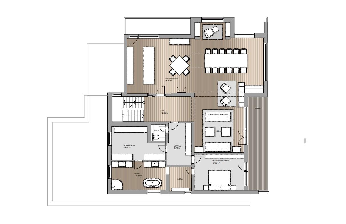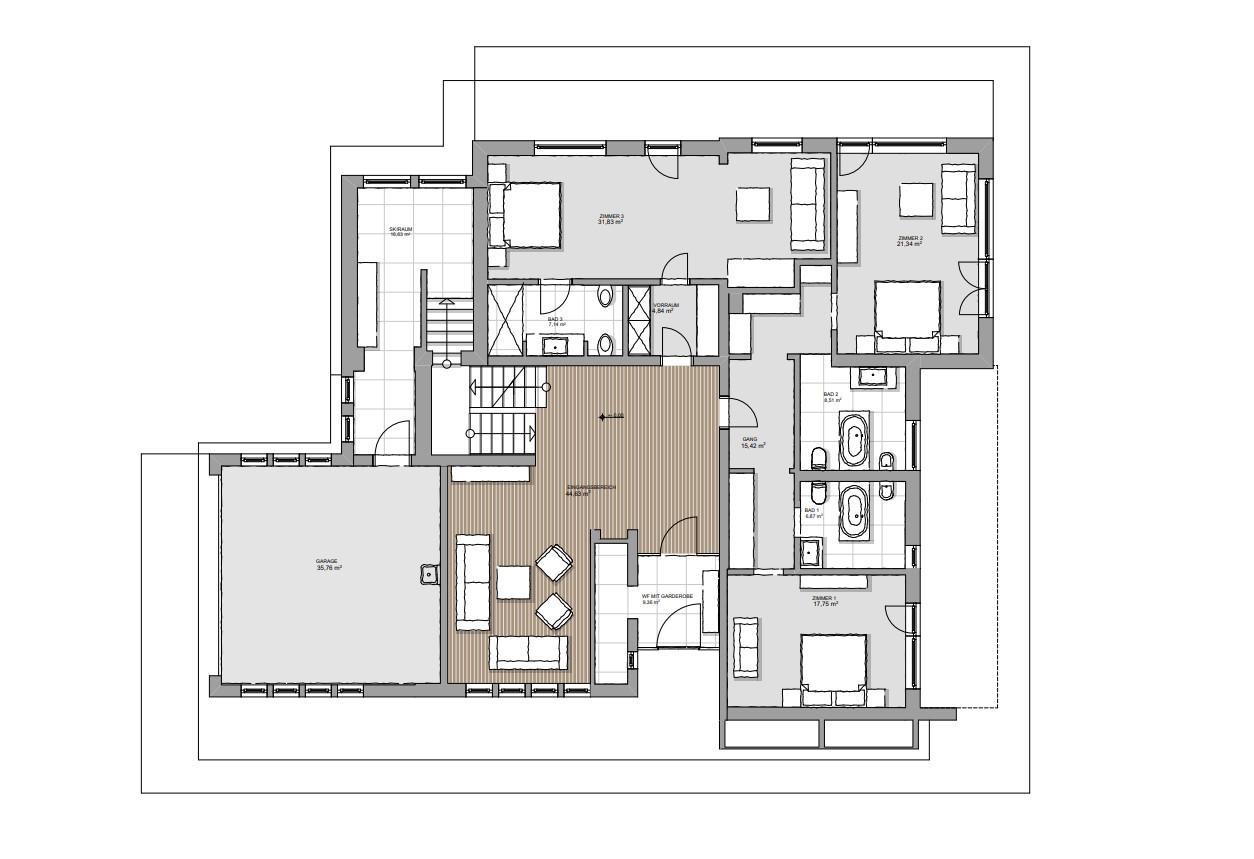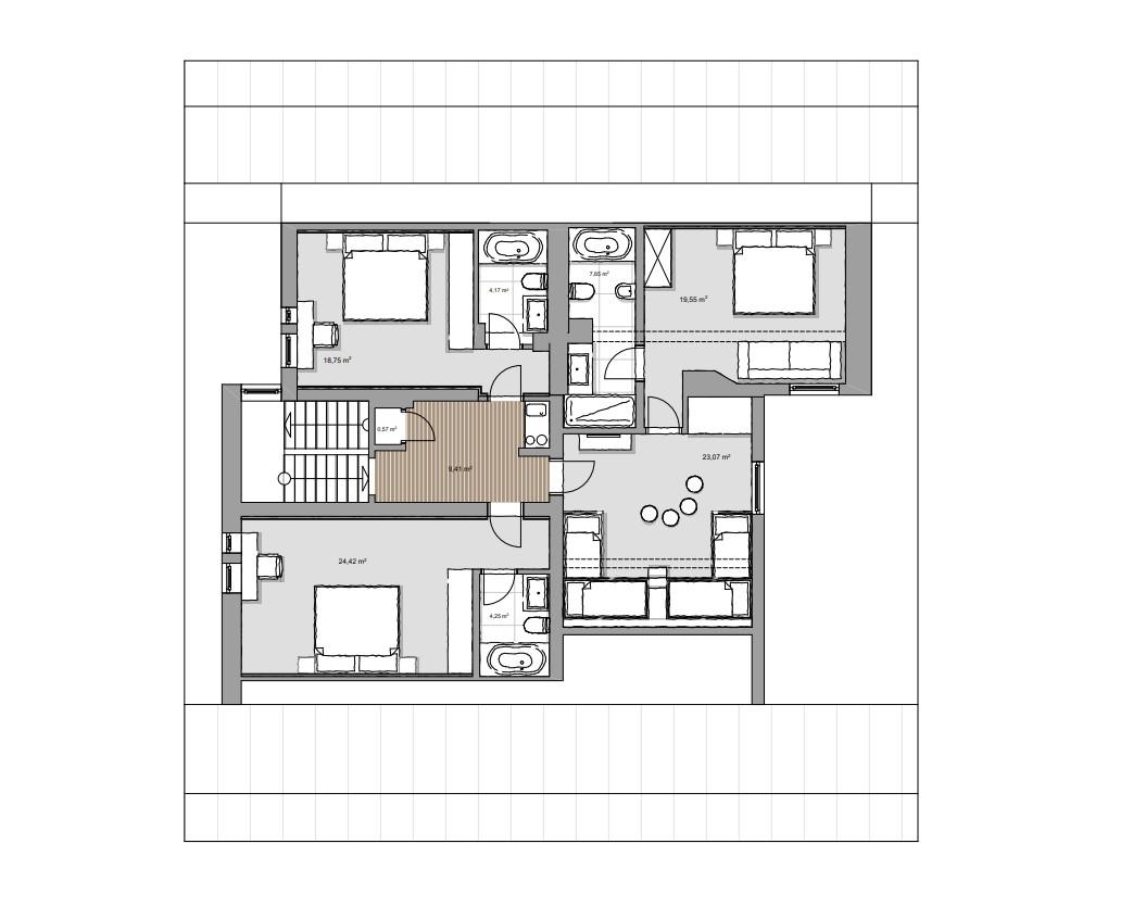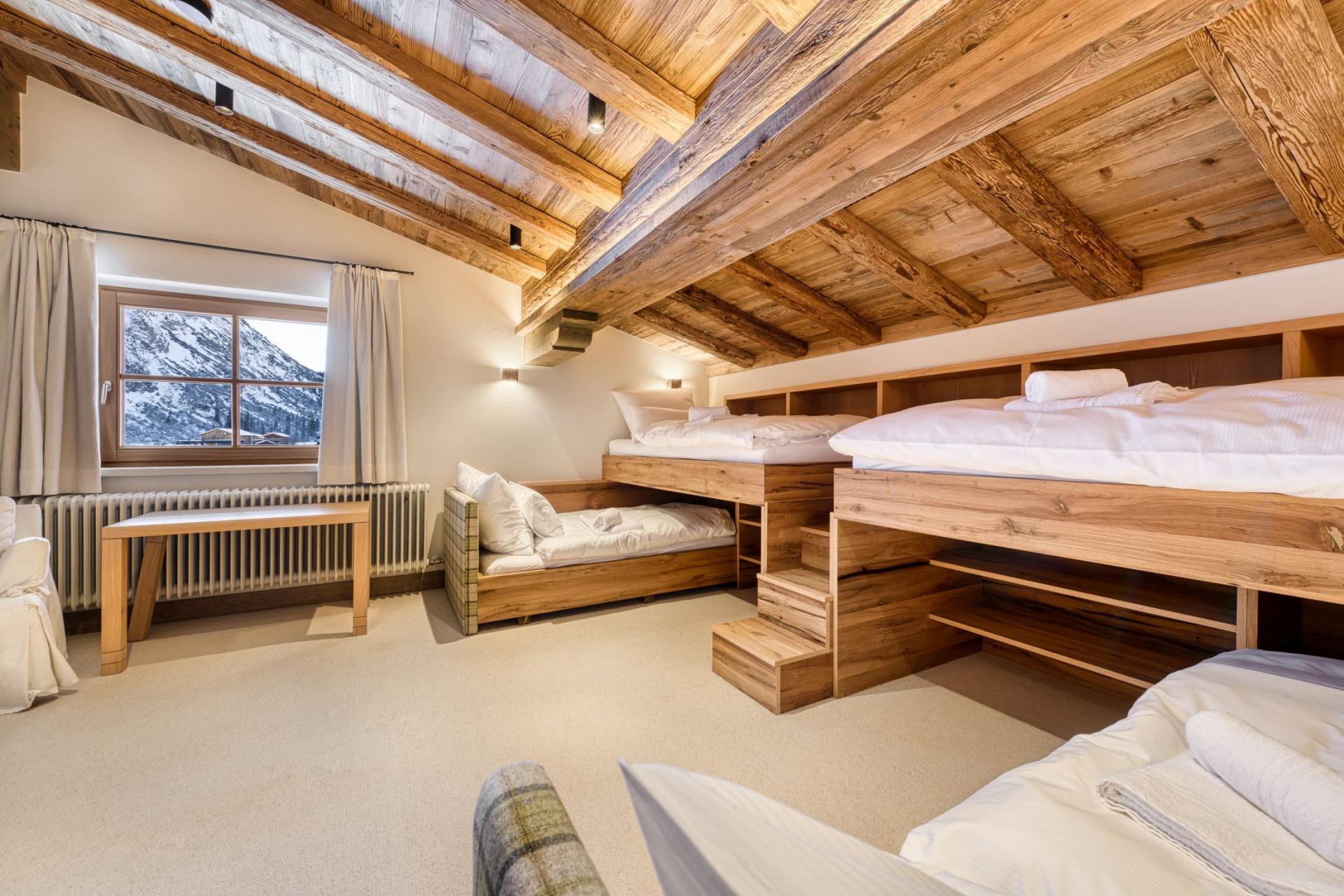 Chalet Lilly F&F's 8 homely bedrooms present spacious, comfortable retreats for 14–18 guests. Each bedroom features sumptuous furnishings and traditional Alpine elements, maintaining the same feel that is seamlessly showcased throughout Chalet Lilly F&F's interiors. The master double bedroom, which benefits from plenty of space, balcony access and an extremely large en-suite bathroom, is the only room that features on the chalet's first floor. Going upstairs to Chalet Lilly F&F's top floor, guests will a further 3 double bedrooms and a quad bunk bedroom (with 4 full-size beds), ideal for ski holidays with friends or those larger luxury family ski holidays in Lech. As the top floor can be closed off, and also comes complete with a kitchen unit on its landing, it is ideal for accommodating a family on multiple group holidays. On the ground floor, lies the remaining 3 double bedrooms, all benefitting from terrace access and en-suite facilities.