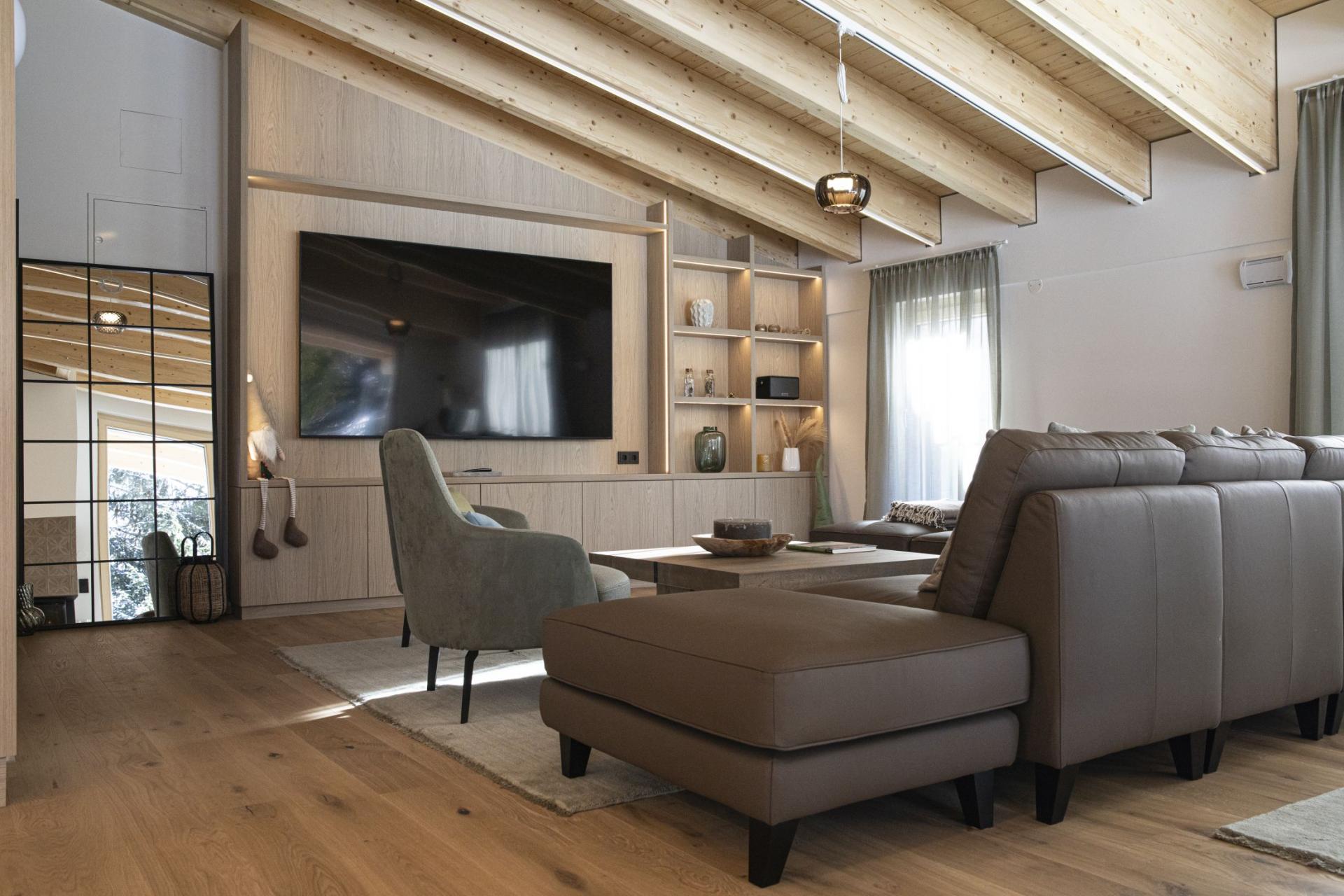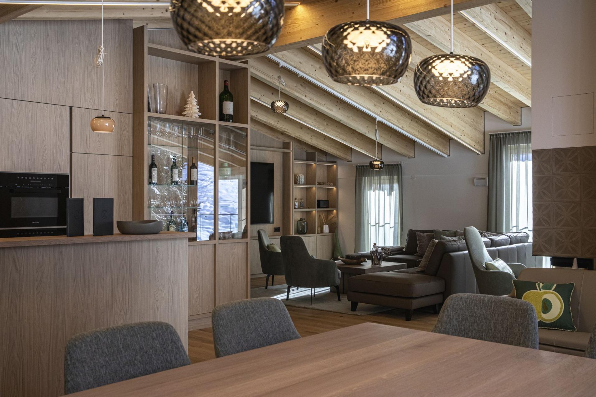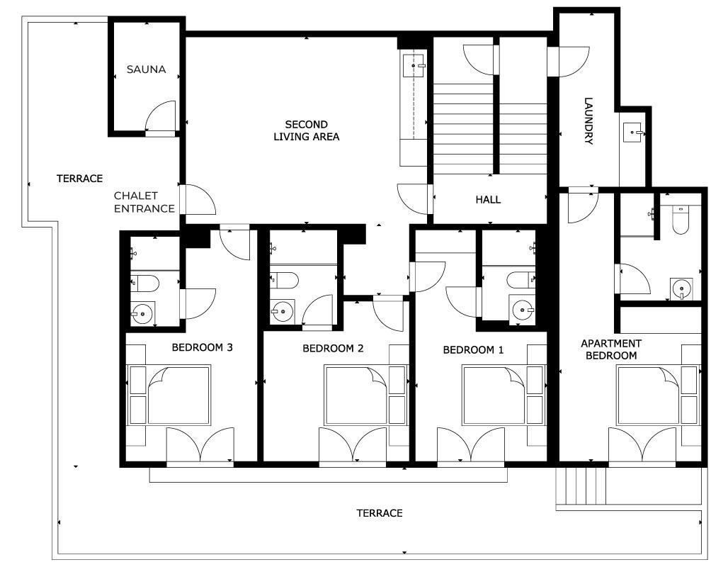 Chalet Frieda features five double bedrooms, which in total sleep up to 10 guests. The rooms offer a mountain charm, utilising wooden interiors and plush furnishings to great effect. There is a spacious and luxurious master suite just off the main living area, in addition to a self-contained apartment-style bedroom on the ground floor, both perfect for those wanting some privacy. The other three bedrooms are spread across the ground floor, with shared terrace access. All bedrooms come with a dedicated en-suite shower room, and all can be taken as either double or twin rooms for greater flexibility in sleeping arrangements.