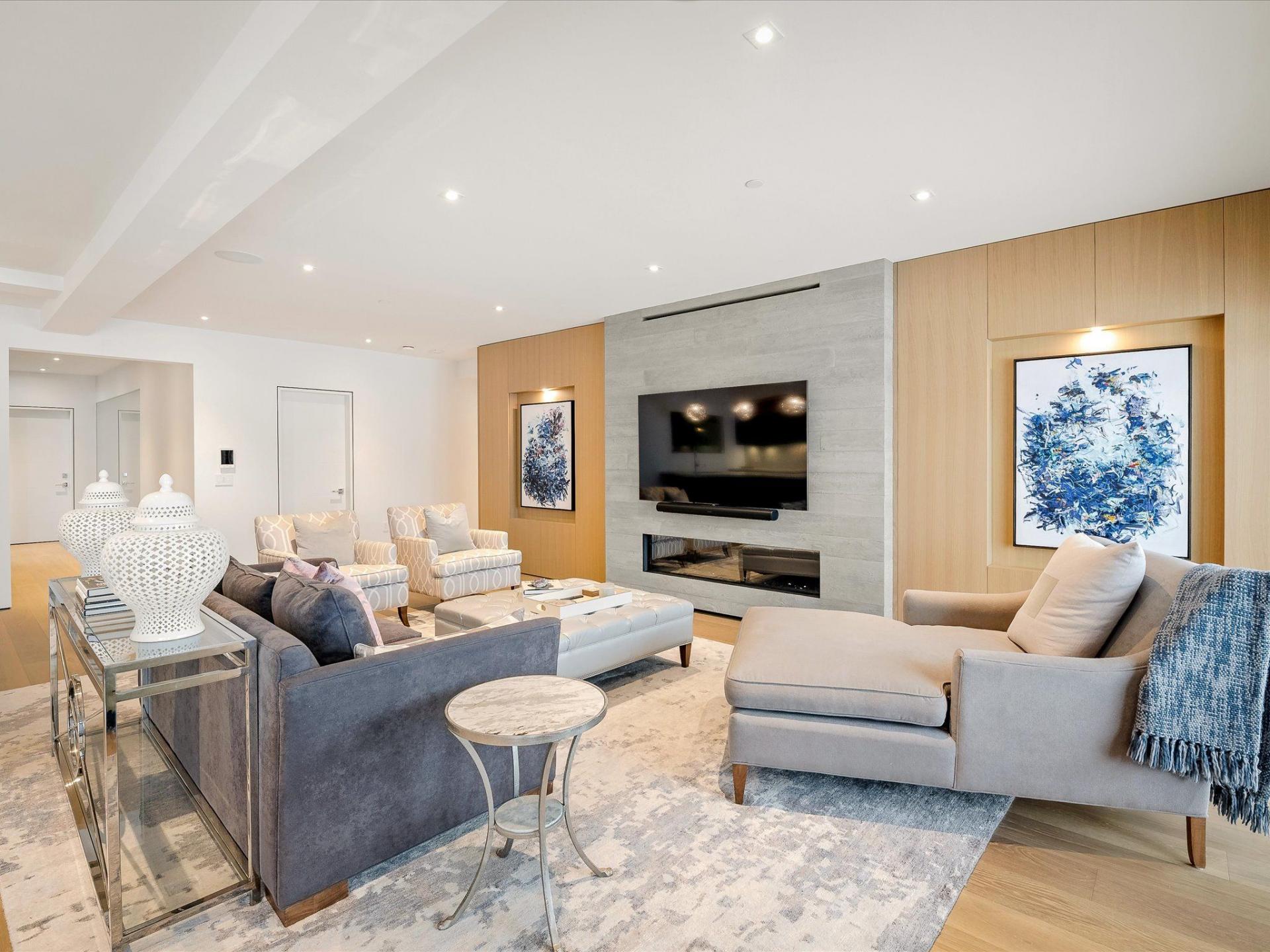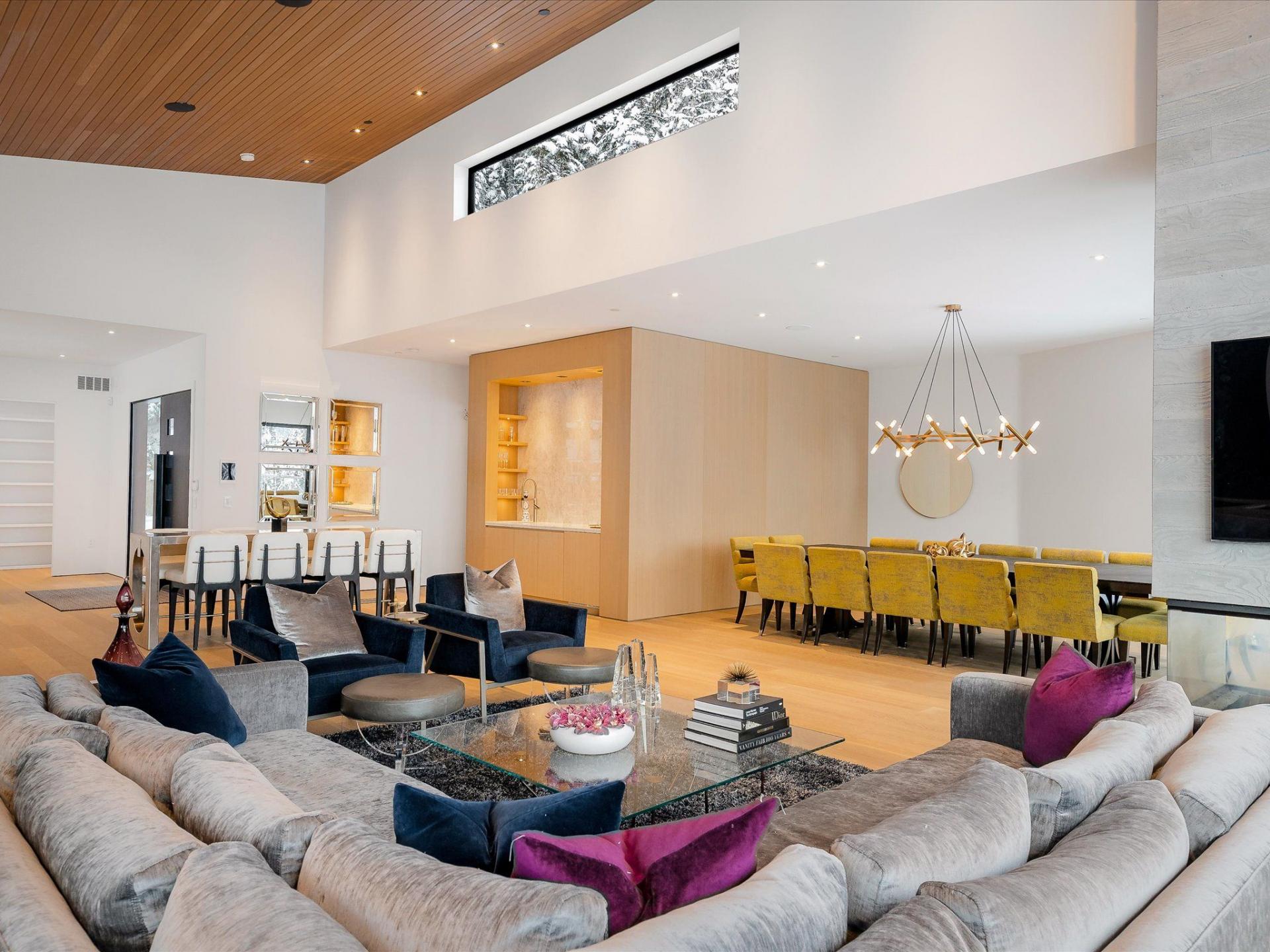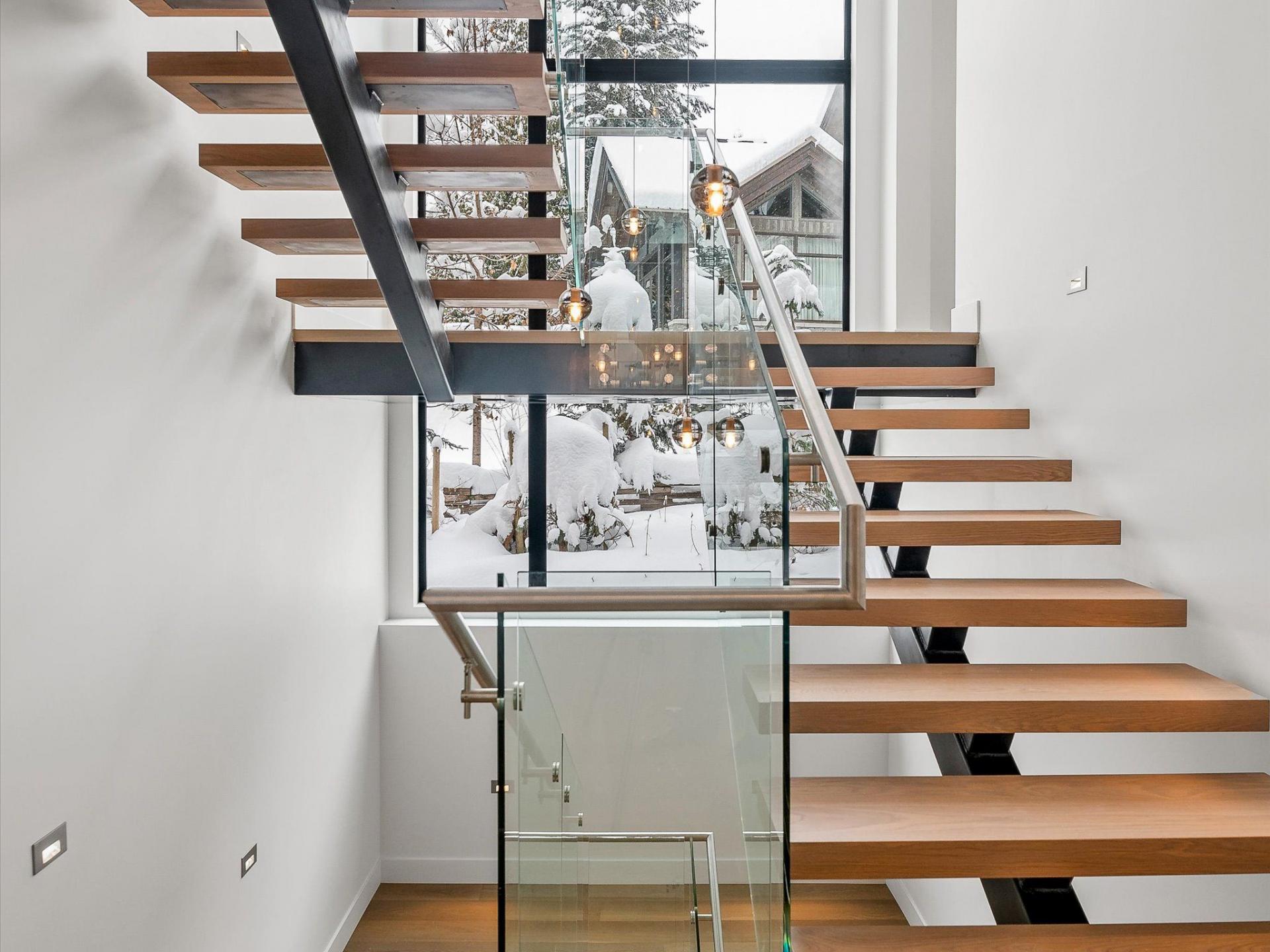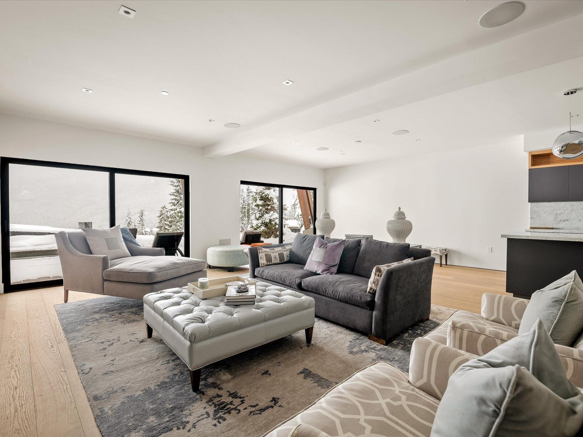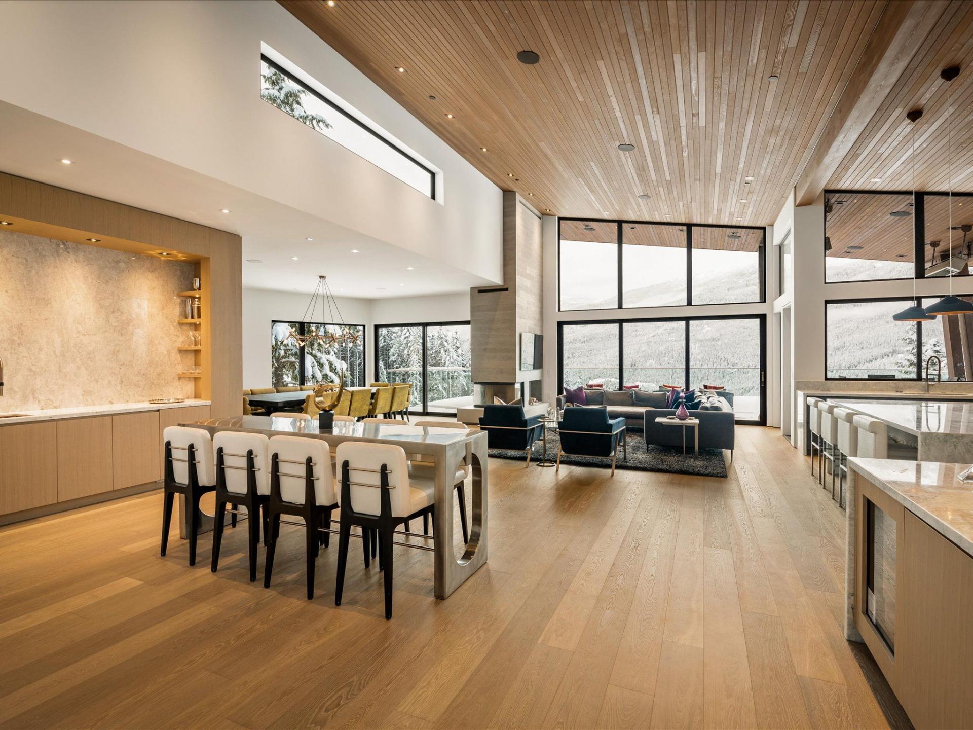 The design of Heritage Peaks Estate is one of clean, modern elegance, with sleek wood interiors and chic modern furnishings. The main living area is beautifully finished, with a double-height living space that feels light and spacious. Towering windows frame stunning panoramic mountain views, and flood the space with light. Relax comfortably on the designer sofas before the warmth of the feature fireplace, or dine together along the open-plan dining area. A fully-equipped open kitchen with large central island completes the living space, while there is also a separate prep kitchen available for use. Heritage Peaks Estate benefits from several sizeable terrace and balcony areas, which include comfortable outdoor furniture, spellbinding snowy views, and a heated dining area and outdoor fire pit, perfect for keeping you warm as you enjoy the fresh air.