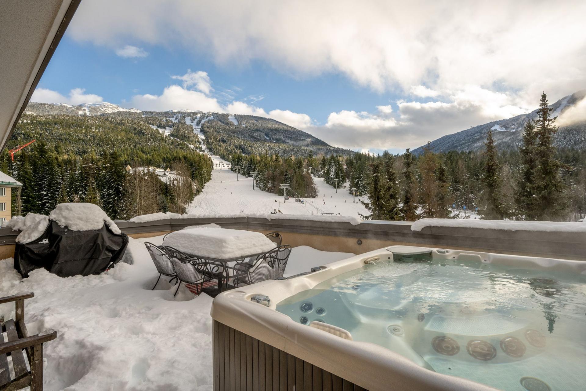 The balcony is host to one of Le Chamos Penthouse's best features, an outdoor hot tub. There are few better ways to unwind after skiing in Whistler than in the soothing warmth of the bubbling waters, while watching the last skiers zip down the slopes at the end of the day.