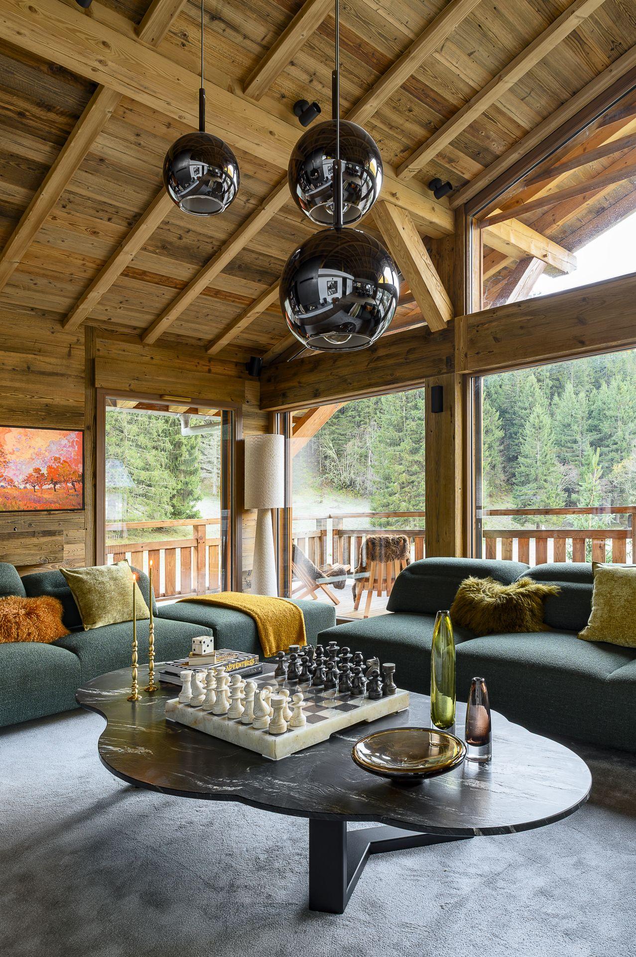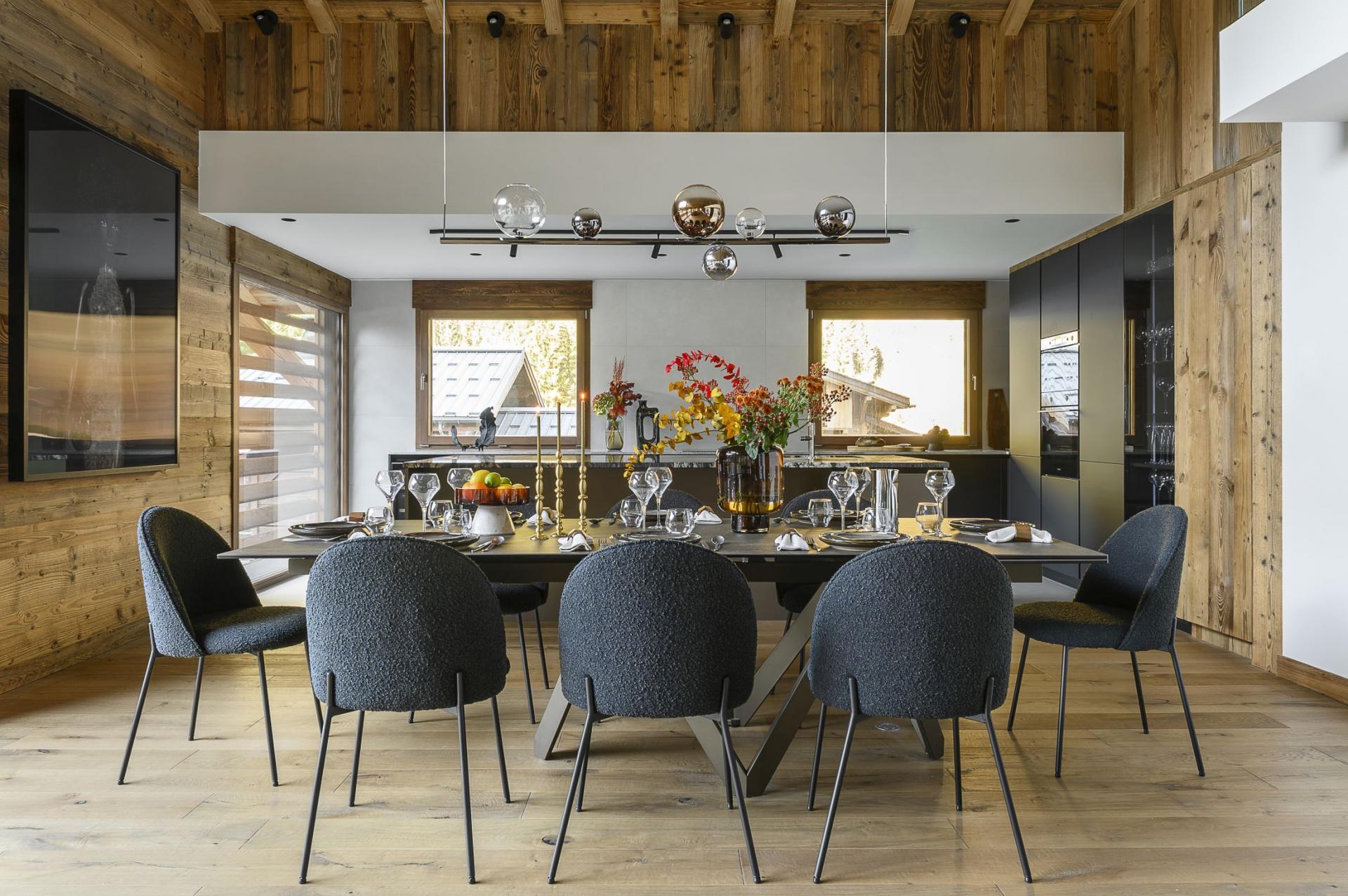 Chalet Patagonia leverages space beautifully to create an airy environment. The chalet's open-plan living area joins the lounge, dining area, and fully-fitted kitchen together into one spacious room. Double-height vaulted ceilings and exposed beams pay homage to the Alpine heritage of Chalet Patagonia, while large floor-to-ceiling windows serve to frame the surrounding valley for guests to enjoy as they recline on the comfortable sofas. These deep sofas invite guests to rest their legs after a long day on the slopes, while the bright colour choice in furnishings gives the space a bold, unique style. The lounge was designed with convivial living in mind, where a central fireplace facing towards the sofas breathes warmth to guests as they gather round to share stories of their adventures of the day. The dining area being situated so close to the kitchen allows for the group's appointed chef to keep in the conversation while they create a culinary masterpiece for a family meal. A wraparound balcony can be accessed off this living space, with steps leading down to the chalet's garden, a lovely space to enjoy the refreshing mountain air and marvel at the breathtaking mountain views that surround the Chamonix valley.