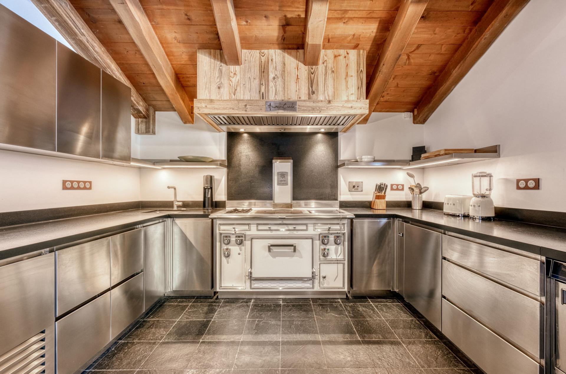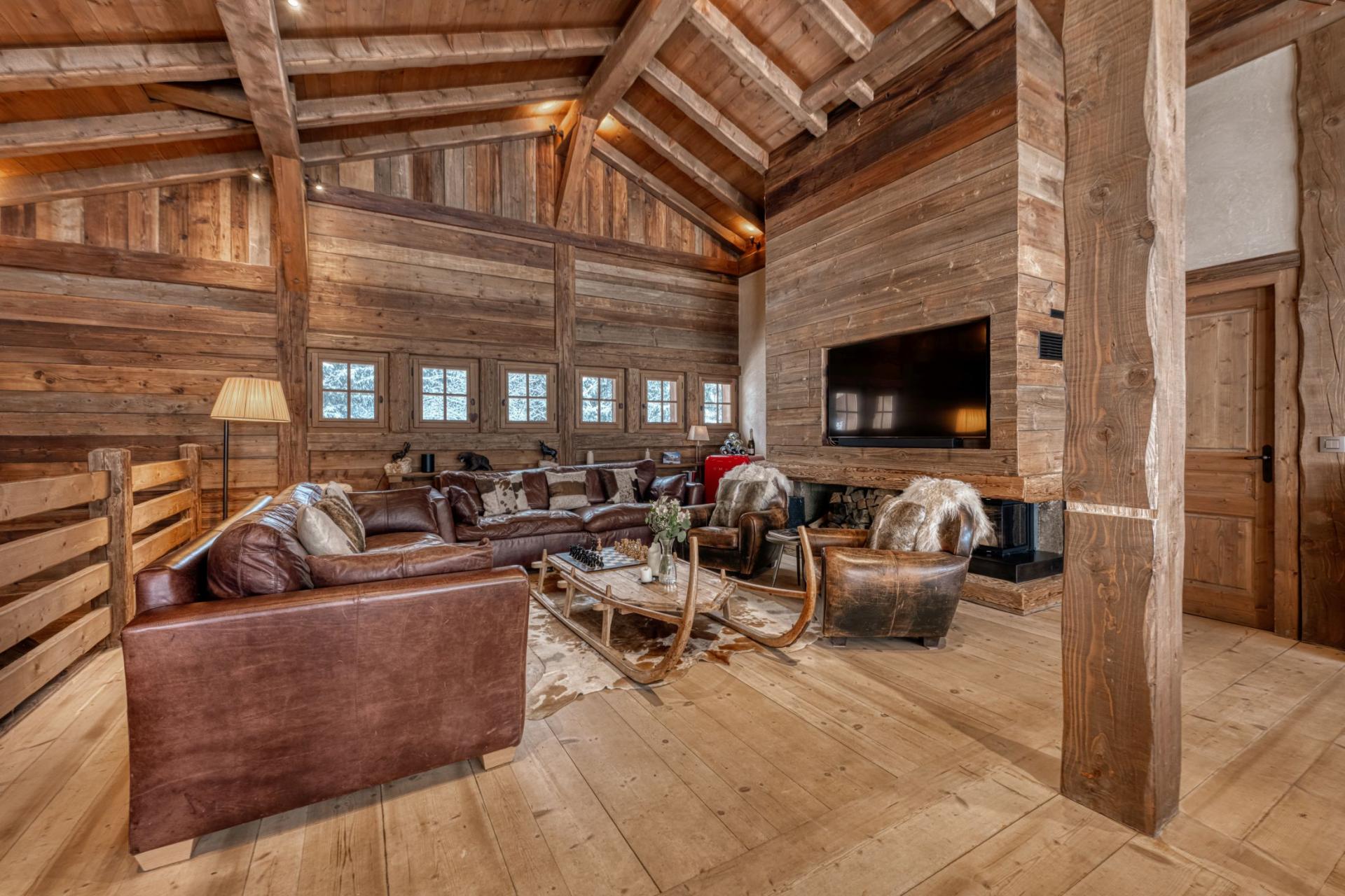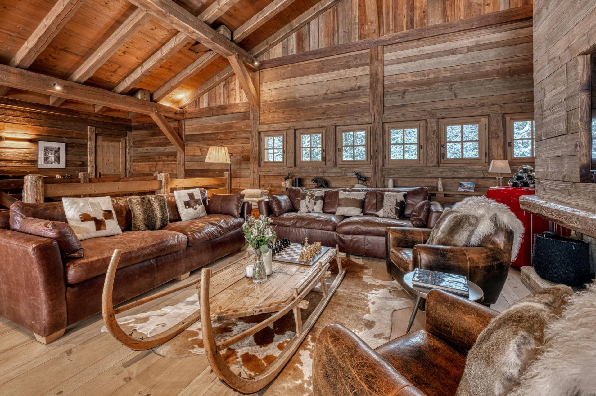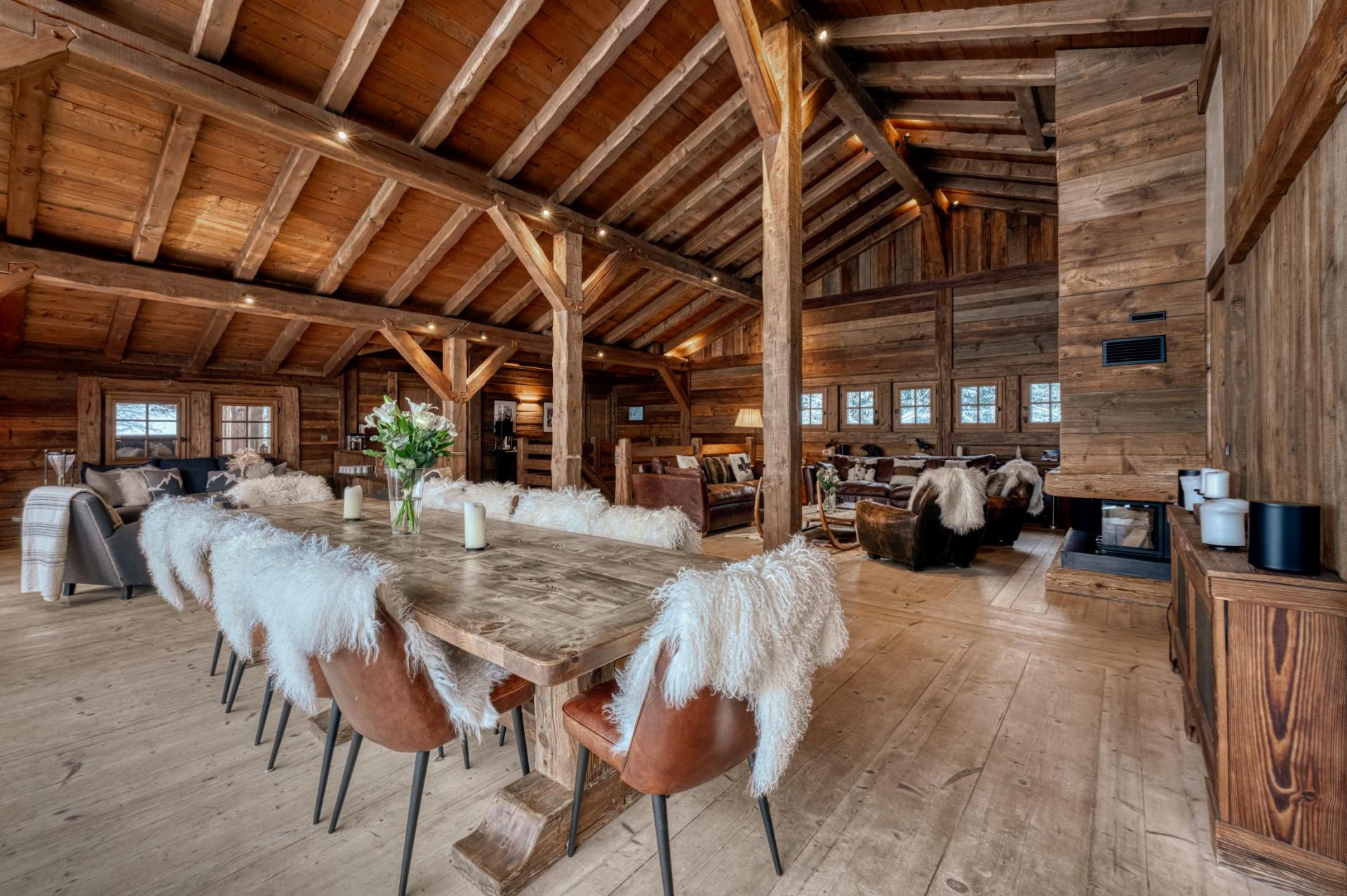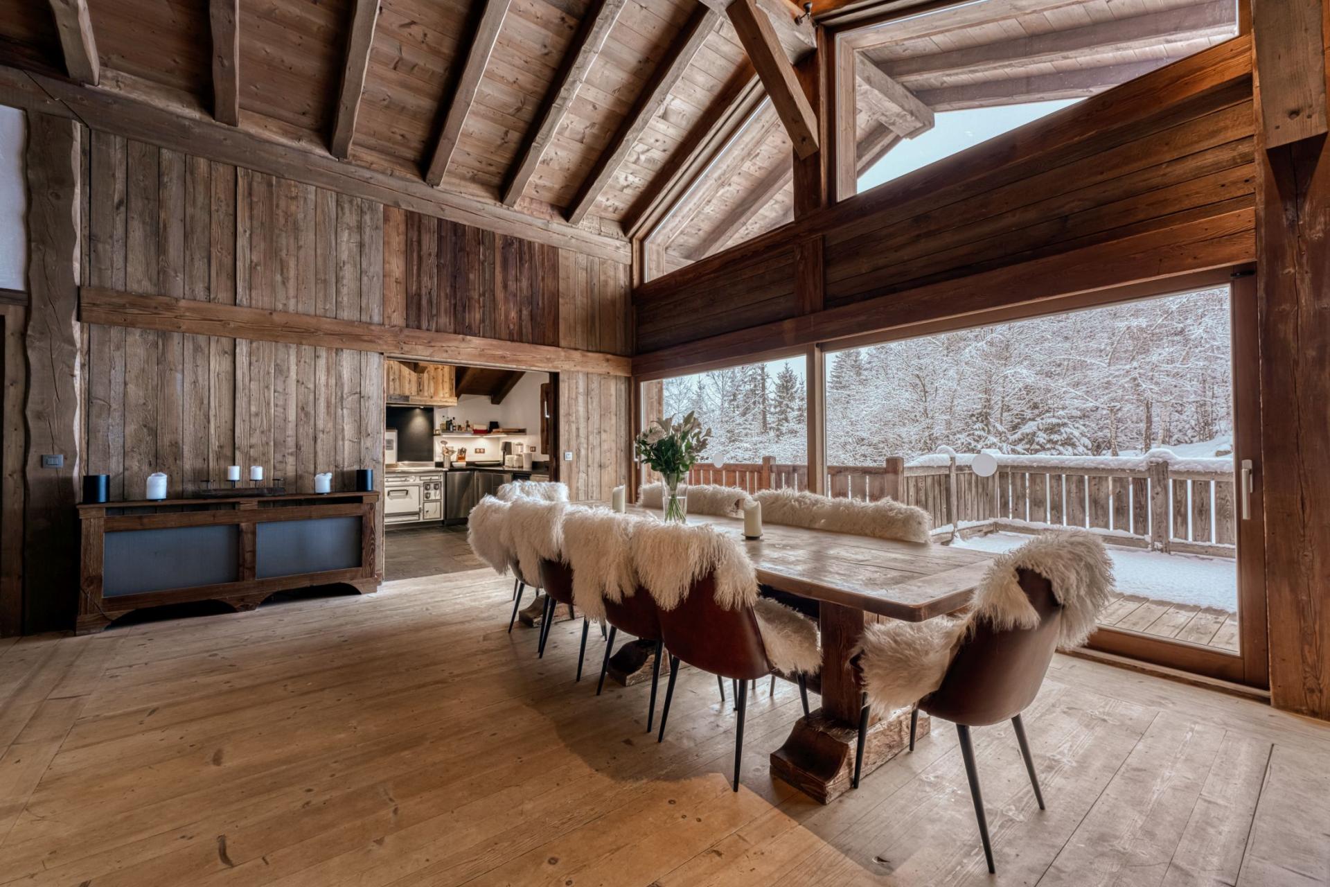 Set across two levels, Chalet Amazon Creek exudes traditional alpine charm, whilst offering a high quality finish and modern touches. A mix of antique decorations and authentic alpine furnishings bring to life the chalet's Chamonix valley setting. The living area is an expansive open-plan space, with high vaulted ceilings and large French windows overlooking the garden and forest beyond. There are two comfortable seating areas, providing ample space for the group to relax and enjoy the warmth of the roaring fireplace. The dining area sits in front of the large windows and balconies, providing plenty of natural light. The fully equipped kitchen can be concealed from this space with sliding doors for a more private setting.