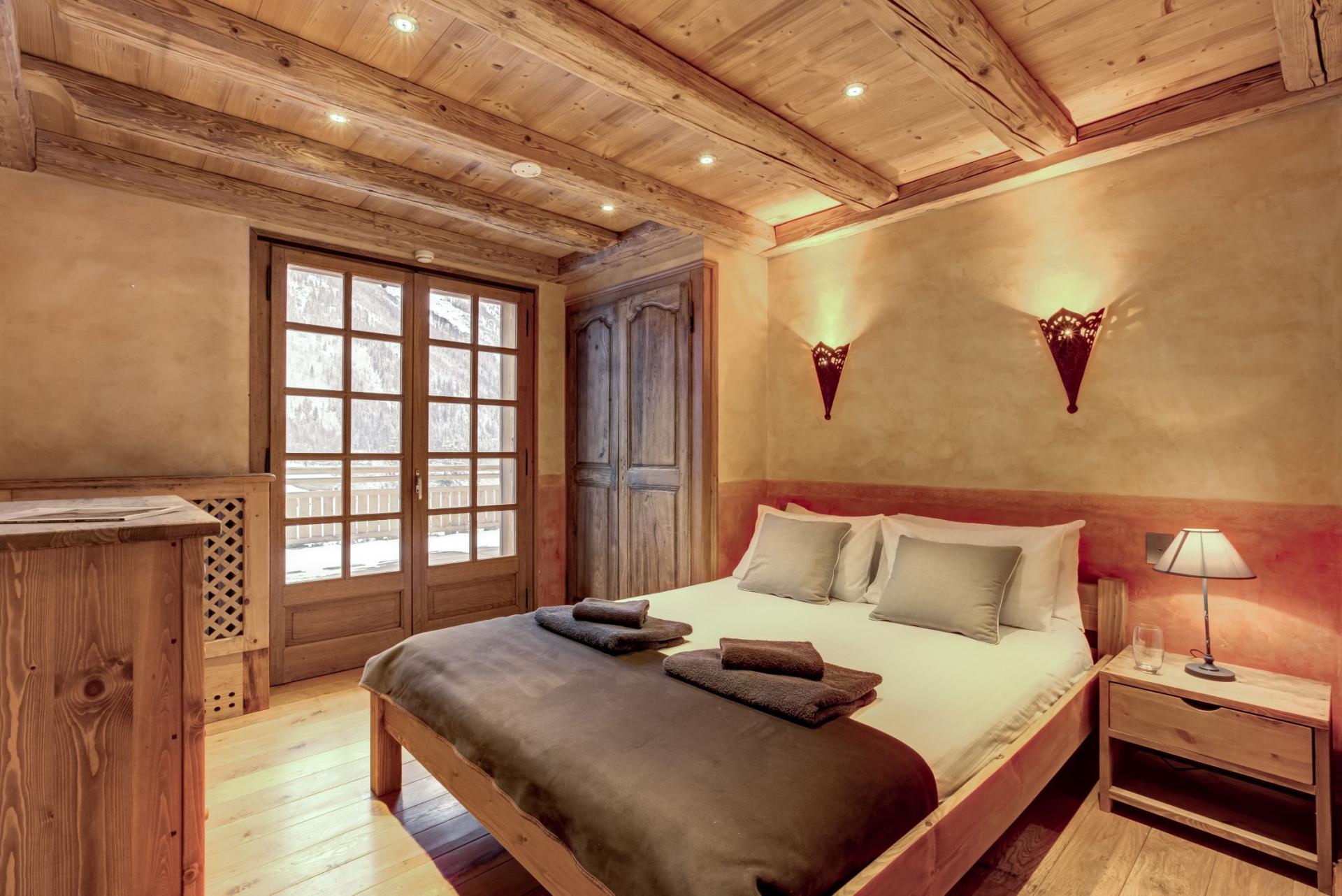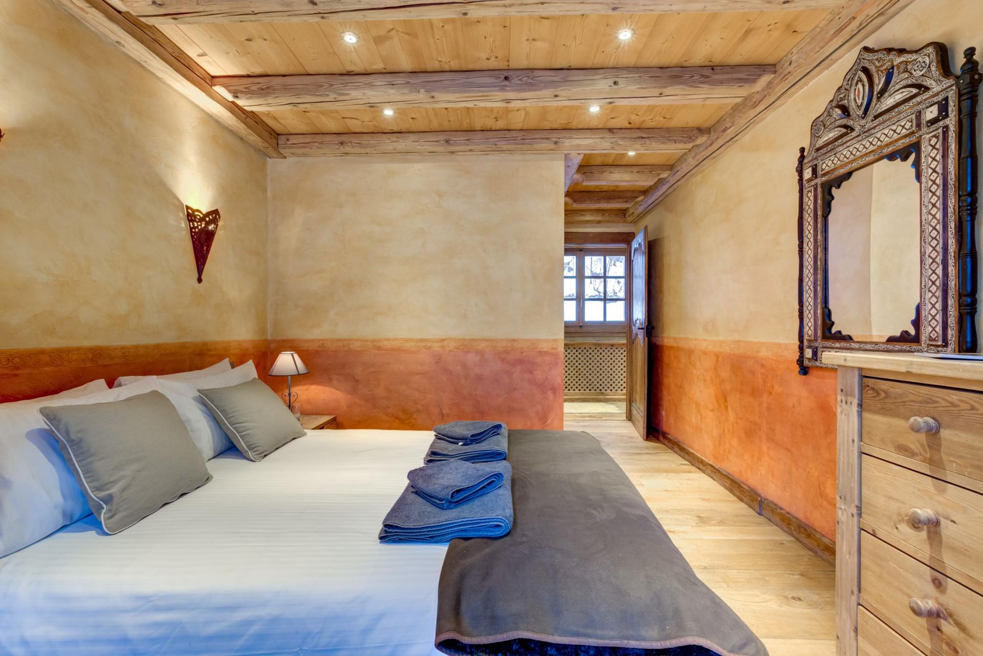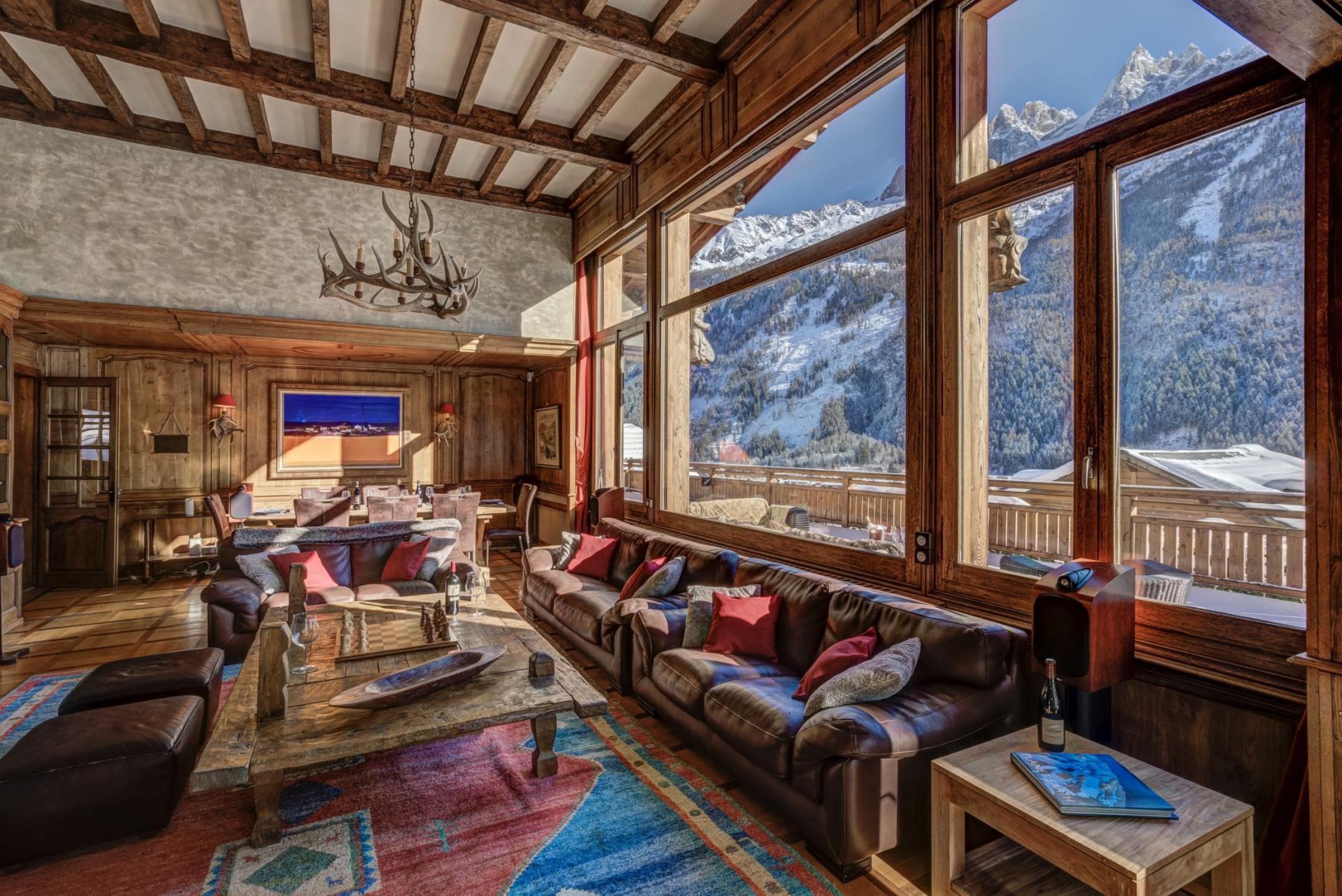 The middle floor of the chalet comprises of an open plan living and dining area. Beautifully renovated, yet keeping a classic alpine theme, this space is complimented by the traditional wooden beams and large open fireplace. The large window behind the sofa lets light flood in, as well as offering fantastic views of Mont Blanc. Also on the same floor is a wrap-around balcony, with multiple outdoor sofas, the perfect setting for catching the afternoon sun.