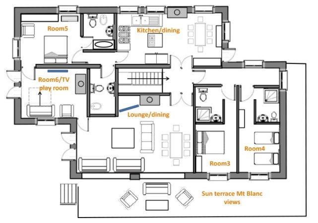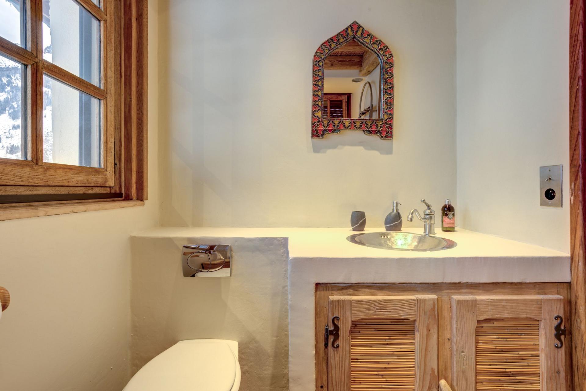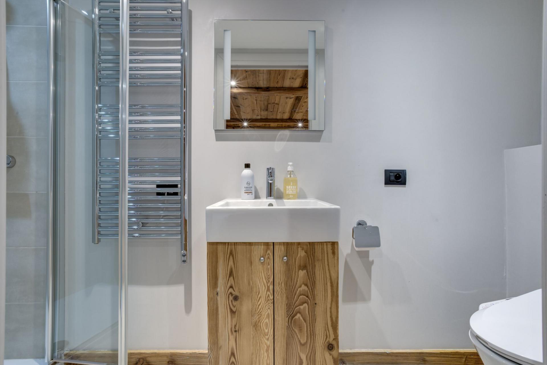 The middle floor of the chalet comprises of an open plan living and dining area. Beautifully renovated, yet keeping a classic alpine theme, this space is complimented by the traditional wooden beams and large open fireplace. The large window behind the sofa lets light flood in, as well as offering fantastic views of Mont Blanc. Also on the same floor is a wrap-around balcony, with multiple outdoor sofas, the perfect setting for catching the afternoon sun.