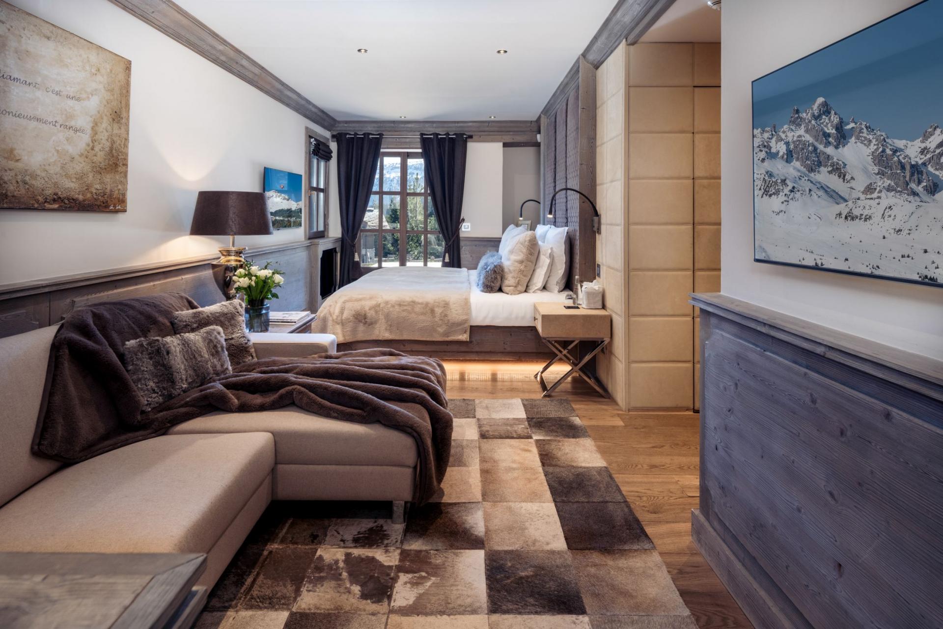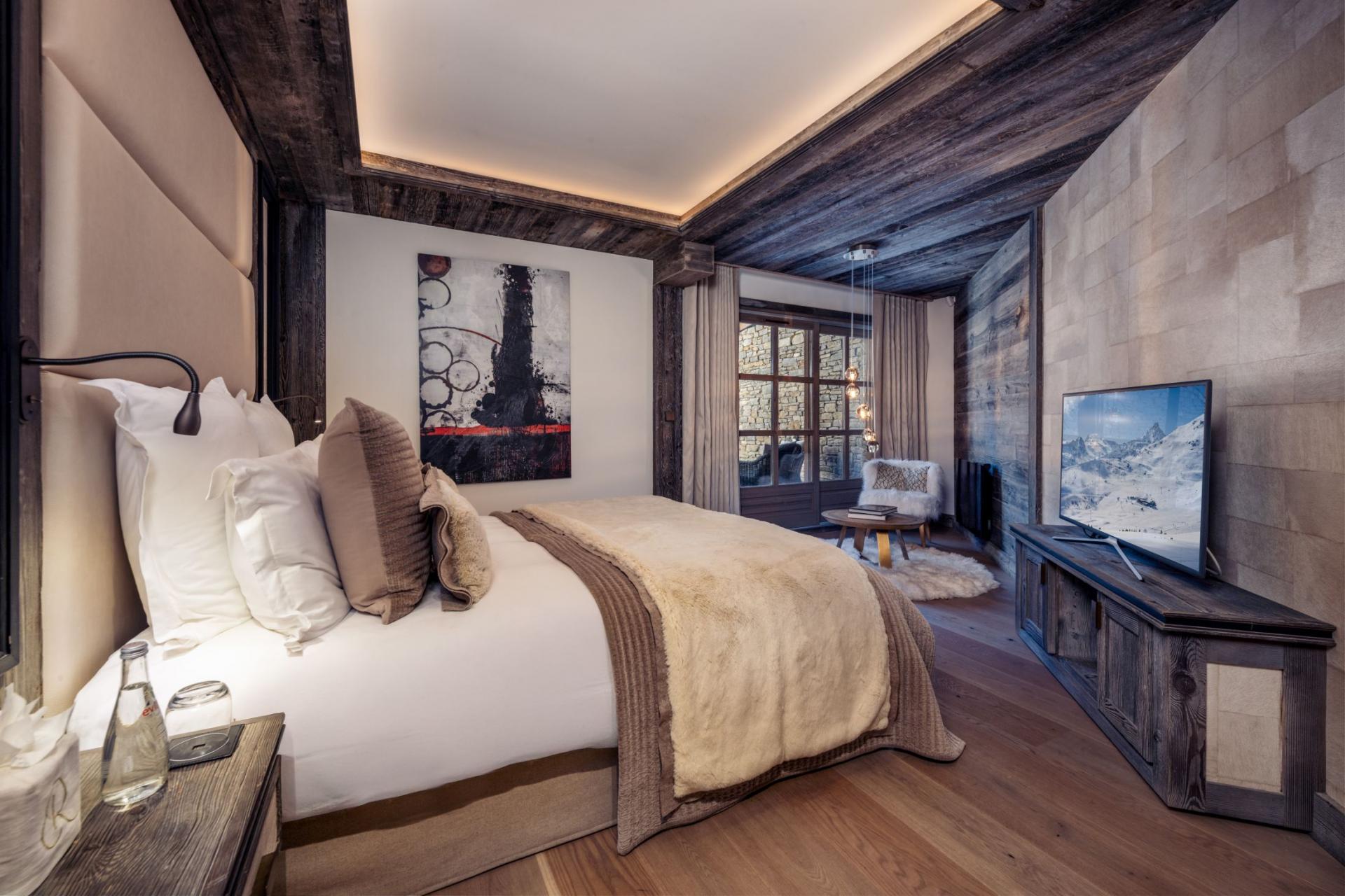 Chalet Razzie has been designed to accommodate groups of 10 adults and 2 children, spread across five double bedrooms and a bunk room. The rooms maintain a similar style to the living areas of the chalet, with wood clad interiors and plush white furnishings, offering a luxurious suite with a calming alpine ambience. There are two master suites, one of which is located on its own floor, both of which is accompanied by an en-suite bathroom with shower. Of the other three double bedrooms, two have the capacity to be taken as twin, and each is completed by a well-appointed en-suite. The children's bunk room is a cosy snug which shares the use of one of the other bedroom's en-suites.