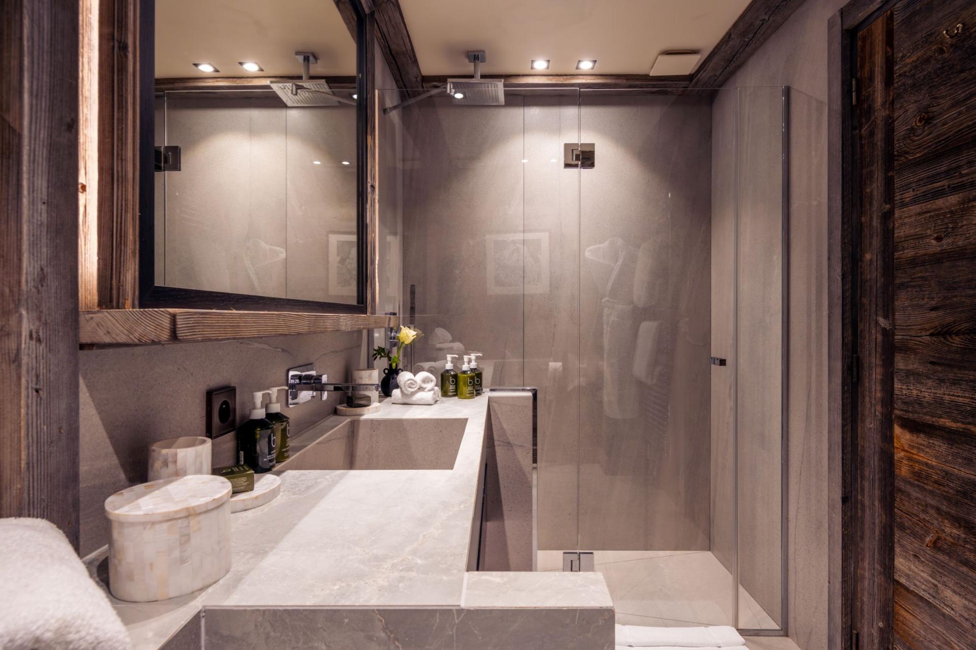 The chalet keeps to a consistent style of whites, browns and greys for an elegant alpine theme throughout the chalet. Chalet Razzie's main living areas include an open-plan lounge and dining area, which benefit from towering vaulted ceilings of dark natural wood. A stone fireplace rises up to the peak of the roof, providing a soothing warmth to those resting upon the sumptuous grey lounge sofas. The graceful chandelier hanging over the dining table adds a further touch of class to your gourmet dining experience. The kitchen remains closed off for your group's privacy, while the living floor also features a dedicated bar area, perfect for après ski at your luxury chalet. There is a lengthy balcony running across the width of the chalet, treating you to a lovely spot to catch some fresh air and admire the magnificent mountain panoramas.