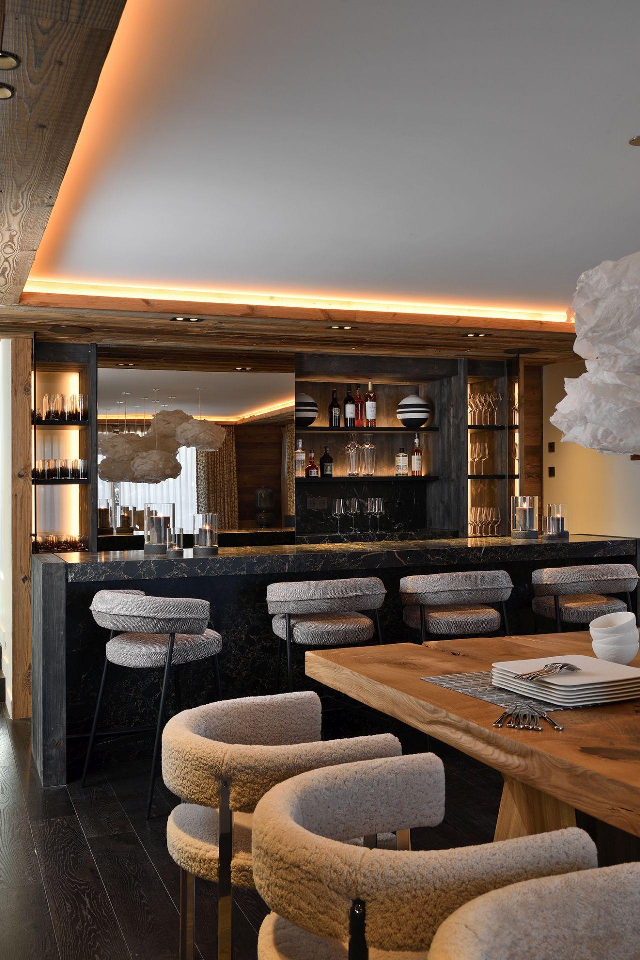 Chalet Yin & Yang spans five floors and an impressive 984m² of interior space. On the first floor, the middle of these five levels, you will find the chalet's main living spaces. The heart of the property is the grand lounge area, a spacious living room that sits beneath double-height ceilings. Elegant alpine woods adorn the floors and ceiling, while the space is sumptuously furnished with plush, inviting sofas and armchairs. There is a feature, dark wood fireplace that breathes warmth through the main lounge areas, although all eyes are likely to be drawn to the statement modern chandelier that hangs above the comfortable seating, a signature piece that showcases the stylish design elements found throughout this elegant alpine chalet. A closed off professional kitchen is also located on this floor, which services the sizeable dining room, complete with classy bar area to one end of the room. Multiple spacious balconies extend off the floors of Chalet Yin & Yang, offering guests a perfect spot to grab some fresh alpine air, perhaps with a morning coffee or après ski apéritif.