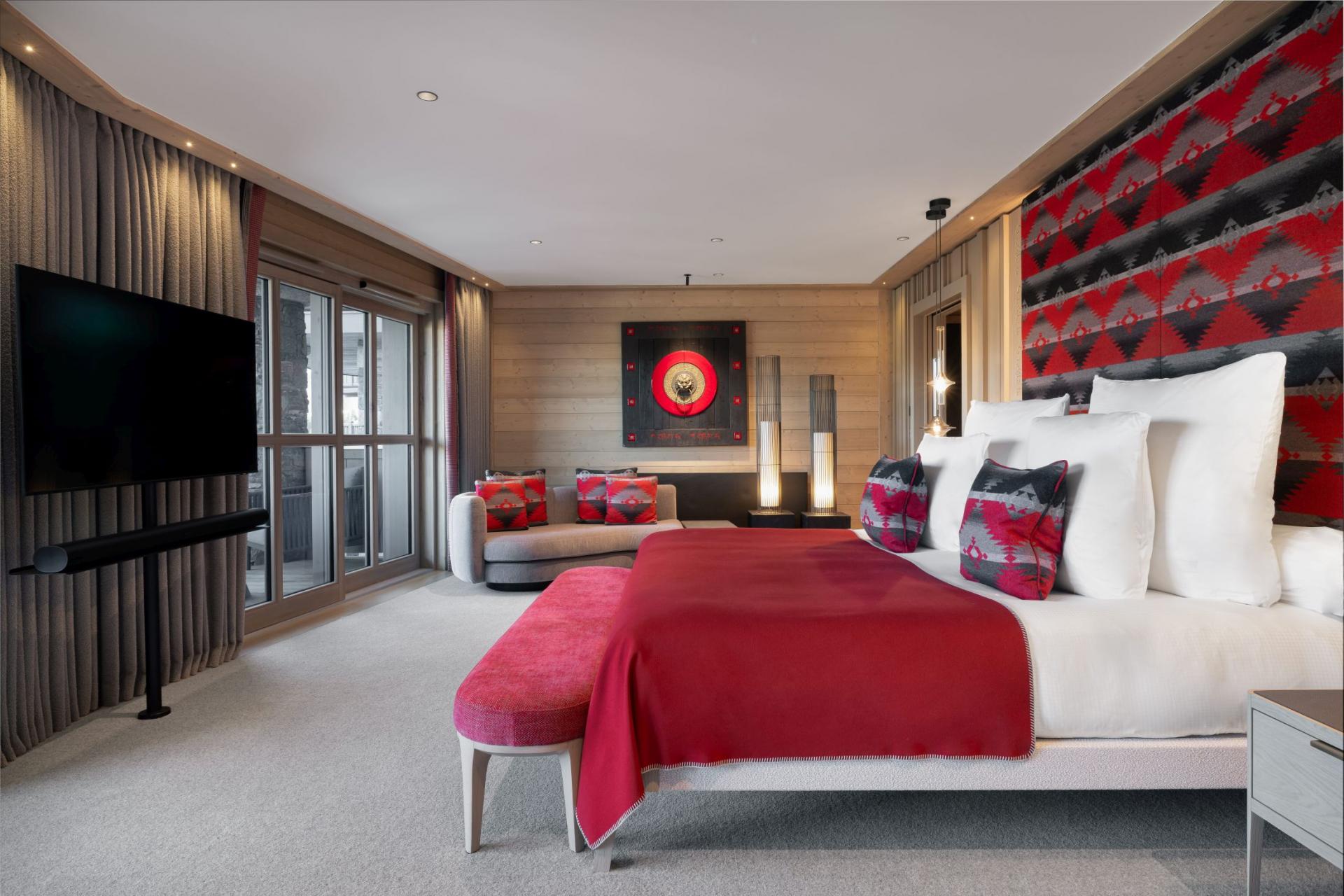The top floor of Le K2 Palace - Chalet Suite K6 houses a spacious open-plan living and dining area. The chalet displays a unique design of alpine and Asian influences, with light woods blending with plush red furniture and ornate decorations. A roaring fireplace provides a homely atmosphere, making the lounge areas an inviting spot to spend a cosy night in, with refreshments able to be arranged at the minibar. Towering windows cover the far wall of this top floor space, leading out onto an extensive balcony that overlooks wondrous views of Courchevel 1850, the surrounding mountains, and down the valley.