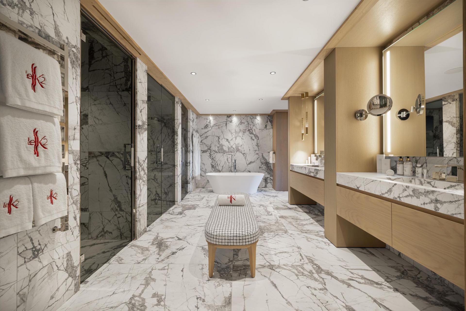 There are three double bedrooms to Le K2 Palace - Chalet Suite K3, sleeping a total of 6 guests. The bedrooms have a sophisticated style in keeping with that of the living areas, with plenty of space and sumptuous beds to retire to at the end of a day of skiing in Courchevel 1850. A master double bedroom enjoys use of a private balcony on the middle floor of this triplex chalet-apartment, while the other two bedrooms share a balcony and provide the flexibility of being either double or twin rooms. The polished en-suite facilities are as luxurious as the rest of this impressive property, with the master bathroom including a rejuvenating Hammam.