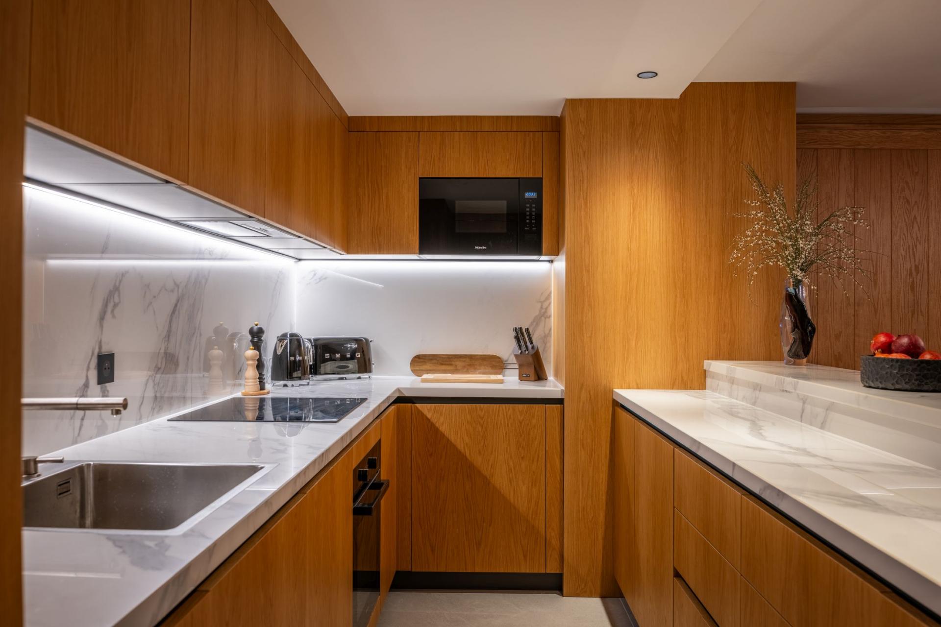 Sasha Apartment 3 is set over two levels, with its primary ground floor level featuring the property's open-plan living spaces. The lounge, dining area, and kitchen of the property occupy one room, where sleek, wood-panelled walls and large, picture windows which showcase the Jardin Alpin slope and gondola help imbue an alpine feeling to your contemporary luxury apartment. Elegantly furnished, there are comfortable lounge sofas to relax upon, alongside a central dining table that can easily accommodate 8 guests. At the back of the room, you'll find the fully-equipped modern kitchen, complete with stylish marble countertops and a kitchen island with breakfast bar seating area. Exit the apartment, and you have access to a private garden space, with picturesque views of the luxurious Jardin Alpin area of Courchevel 1850.