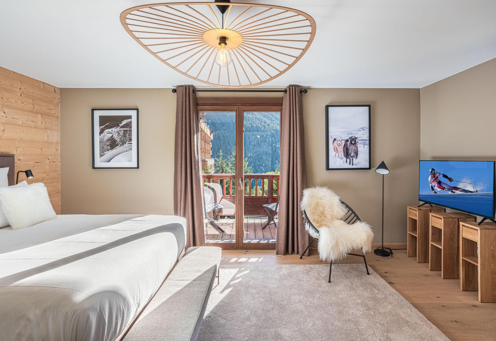 Chalet Grande Casse can accommodate up to 8 guests across 4 bedrooms. The bedrooms all follow a contemporary design, with vibrant pops of colour and plush, comfortable bedding that ensures guests receive ample rest. All bedrooms are fitted with en-suite facilities with either a bath or shower. Balcony access is also provided in two of the bedrooms, offering guests a private viewing space to indulge in the beauty of the mountain scenery.