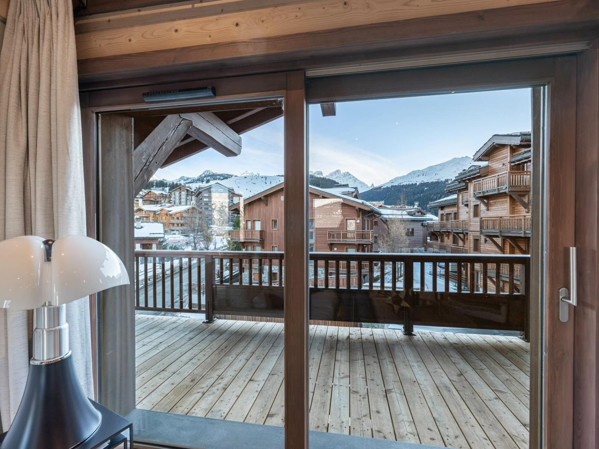 On the top level of Chalet Grande Casse's four floors, you are welcomed by a spacious open-plan living area consisting of a kitchen, dining area, and living room. Plush sofas invite you to rest your legs after a long day on the slopes, where you can cosy up alongside the fireplace with an après-ski drink and share stories of your adventures of the day. Large floor-to-ceiling windows frame the valley for guests to admire, which also lets natural light in, illuminating the entire space. The dual aspect fireplace ensures the entire space is toasty throughout the entire space, keeping you warm in both the lounge and dining area. Large family meals really round out the evening, with the fully-equipped kitchen and island work surface an ideal space for your group's appointed chef to prepare your dinners. Across this floor, sliding glass doors open up to a wraparound balcony, offering guests a more intimate view of the Courchevel valley.