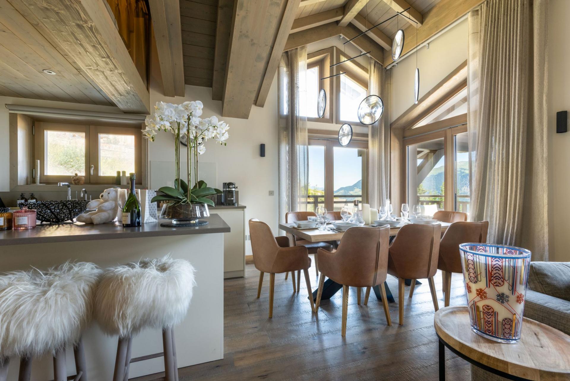 As you enter the chalet, you are greeted by a large open-plan living area with a cosy and comfortable atmosphere. Chalet Ursus makes use of the large windows to allow plenty of natural light; the soft and warm colours of the contemporary furniture is illuminated by the natural light, bringing an incredibly warm feeling into the chalet. Kick up your feet after a fun day on the slopes as you marvel at the picturesque views of the mountains right outside your window. As your group's appointed chef begins their work in the kitchen, some of the group may choose to keep them company by sitting and having a chat nearby on the living room sofas or dining table. Others, looking for a more down tempo recline, may find themselves in the snug mezzanine, where they can lounge in a space that overlooks the main living area. Take a glass of wine to the balcony and indulge in the crisp air, alpine smell and the serene sounds of the mountain environment.