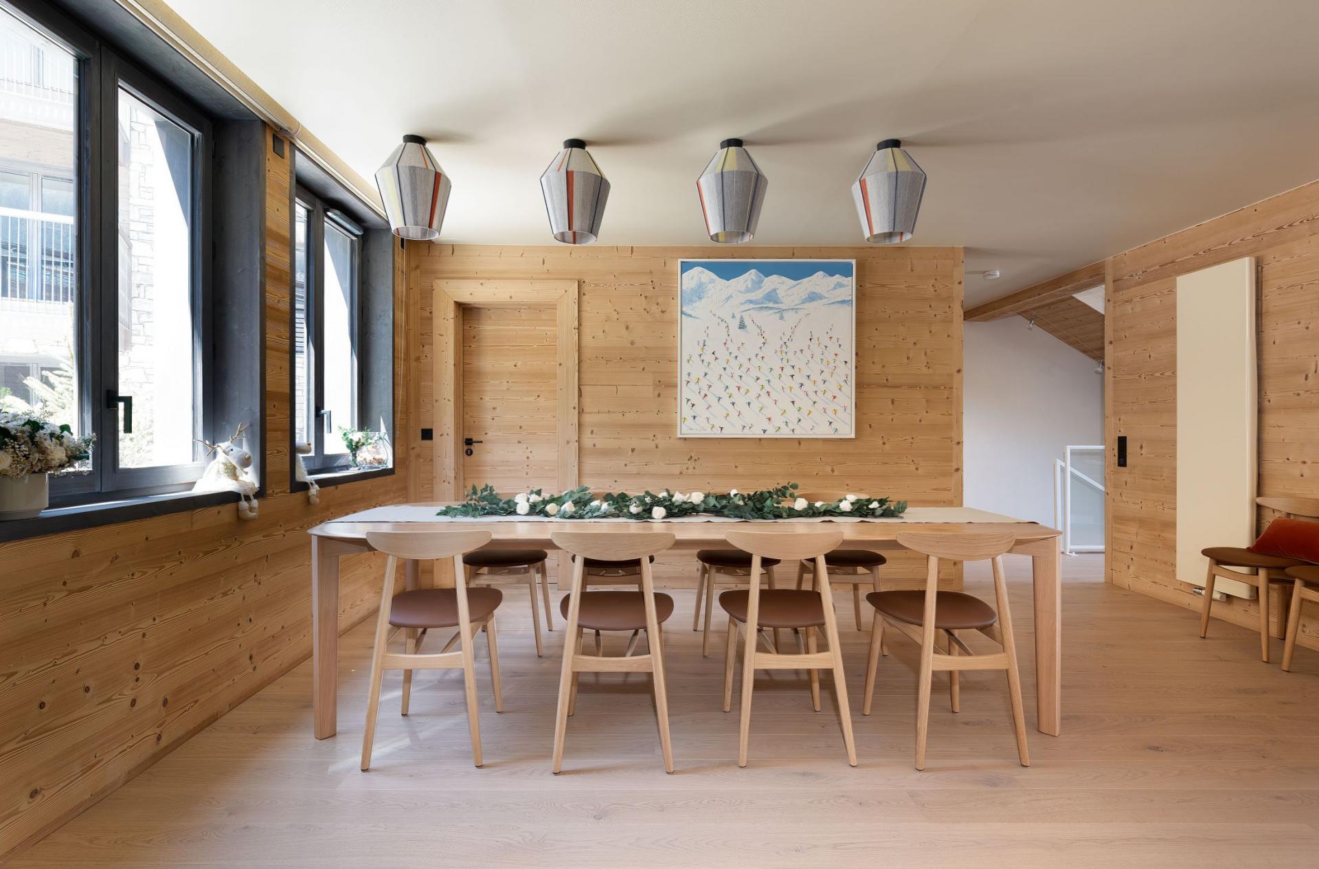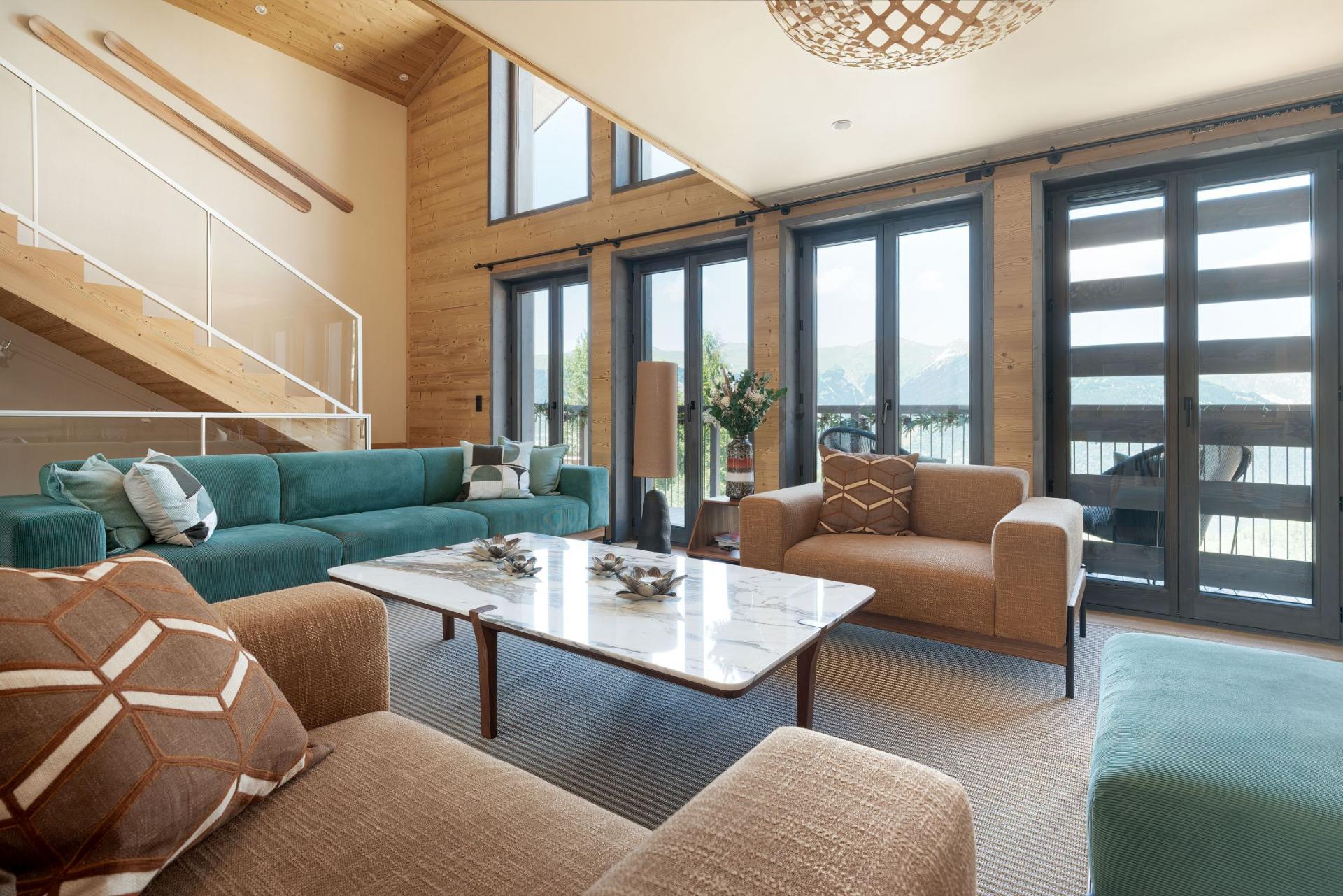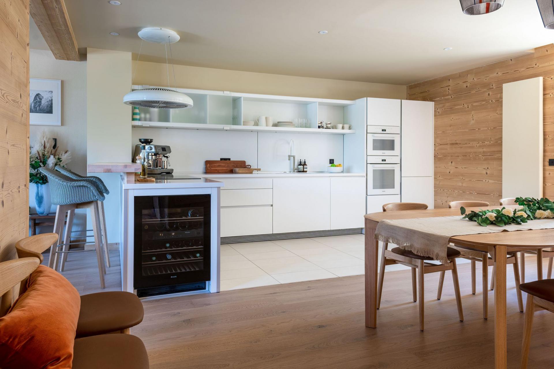 You are welcomed by an open-plan design connecting all the common spaces. Large windows allow for plenty of natural light to enter the space, brightening up the whole room when the sun hits the vibrant coloured furniture. There are plenty of seats to lounge in after a long day on the slopes for you to kick your feet up. Chalet Sira benefits from a wood fireplace, positioned as a centre space to the living area, carrying heat to all corners of the space and ensuring the guests stay nice and toasty throughout their stay. The large dining table is a perfect spot for family dinner nights, and a breakfast bar connects the living and kitchen space. Guests can sit and chat as they await their dinner, or simply to keep them company with an evening glass of wine. You can look to explore the large balcony, which is accessible from the living room. Take your morning coffee out with you and start off your day with a magnificent view of the French Alps.