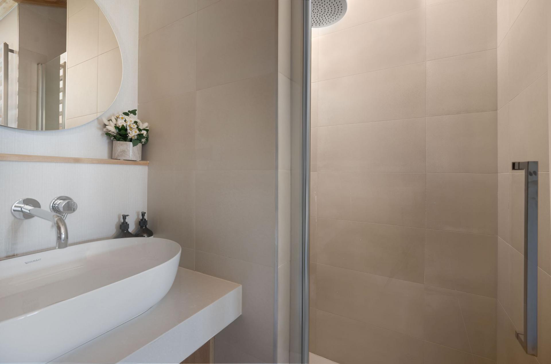 Chalet Sira can host up to 10 guests across 4 bedrooms. The bedrooms follow the same modern design of the chalet, making use of contemporary furnishings. All bedrooms make wonderful use of natural light, in a similar way to the common space. The bedrooms are all en-suite, with either bath or shower facilities, and all have their own WC. The master bedroom benefits from floor to ceiling windows, allowing unobstructed views of the mountain landscape. . All but one of the bedrooms are found on the first floor, with the last bedroom on the lower floor providing shared access to a balcony.
