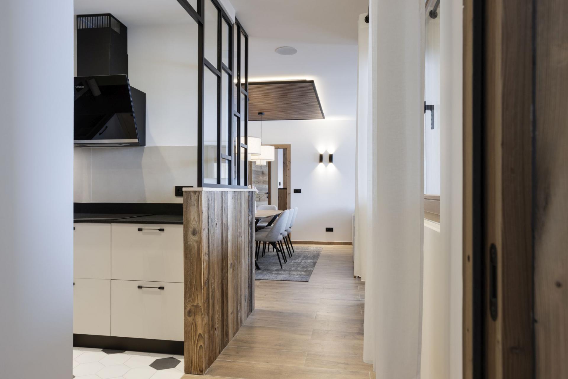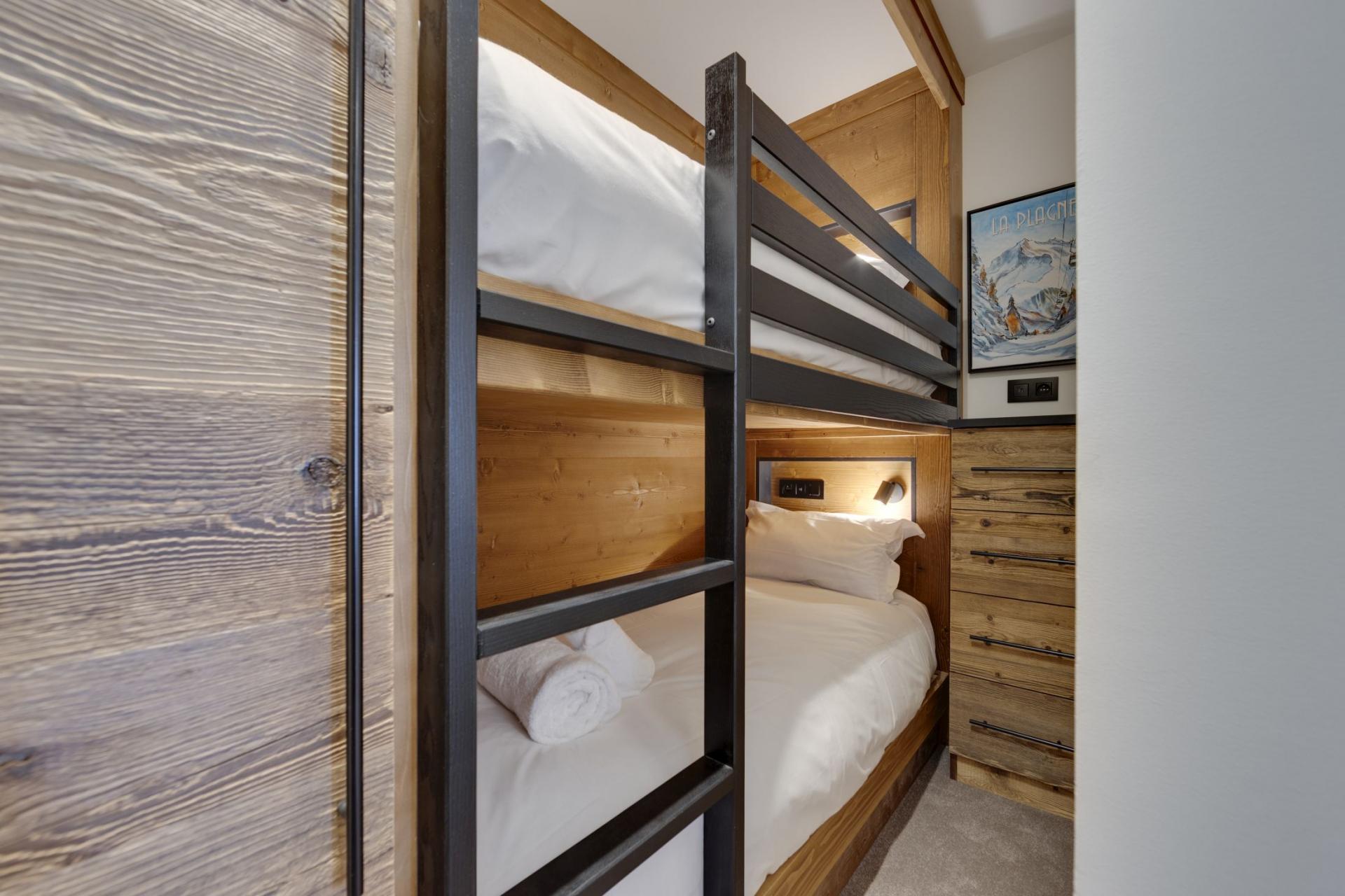 Come together and relax on the sumptuous corner sofa within the open-plan lounge and dining area, with the comforting glow of the eco-friendly fireplace creating a cosy atmosphere to return to after your time on La Plagne's pistes. A wall of glass opens to a Juliet balcony so you can admire the snow swept scenery with a brisk mountain breeze in the comfort of your luxury accommodation. Illuminated by sophisticated lighting is the dining area, comfy chairs surround the wooden table, inviting you to linger long after your meals. Tucked around the corner from the main living is the stylish-fitted kitchen, fully equipped for your host to produce delectable delights during your stay.