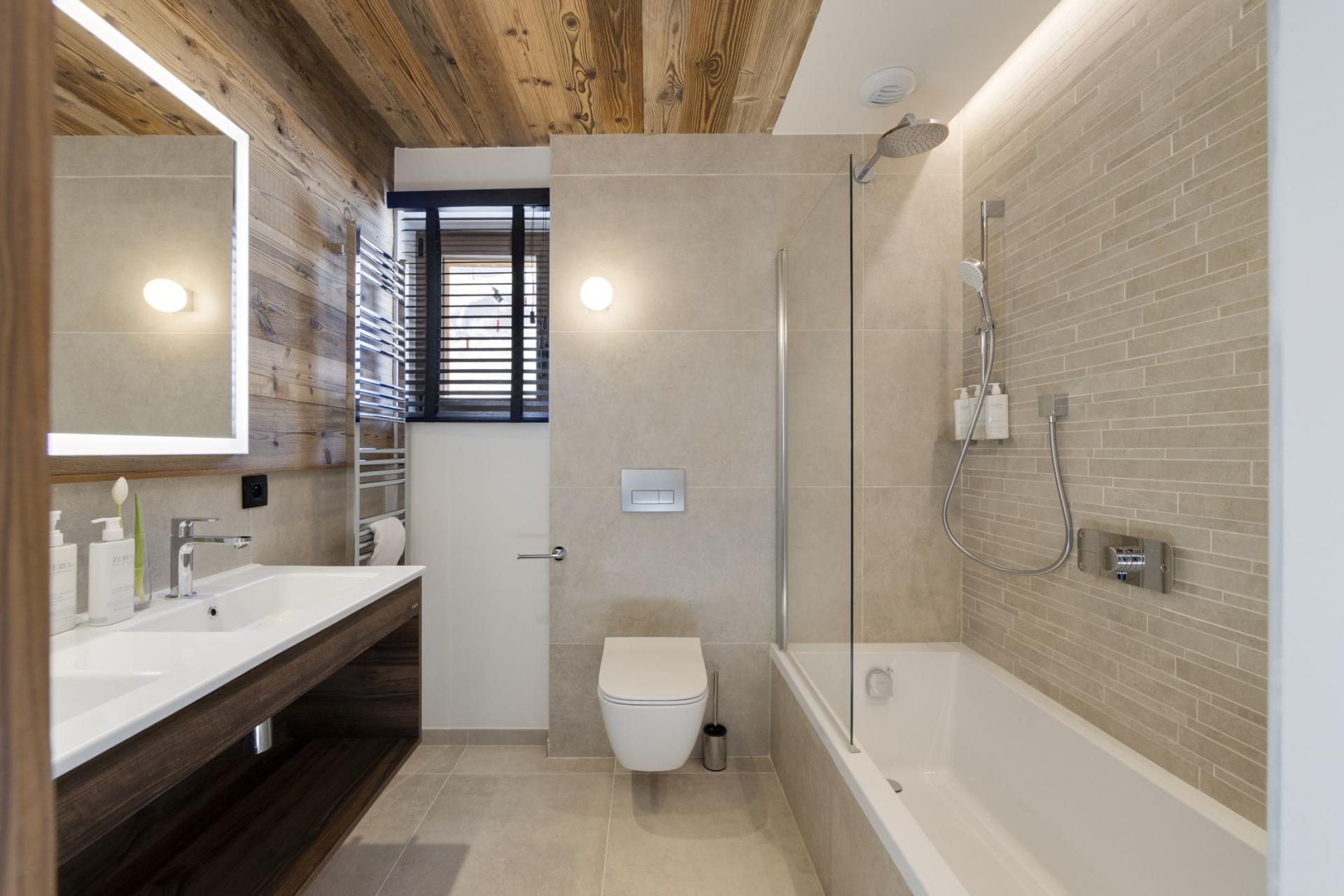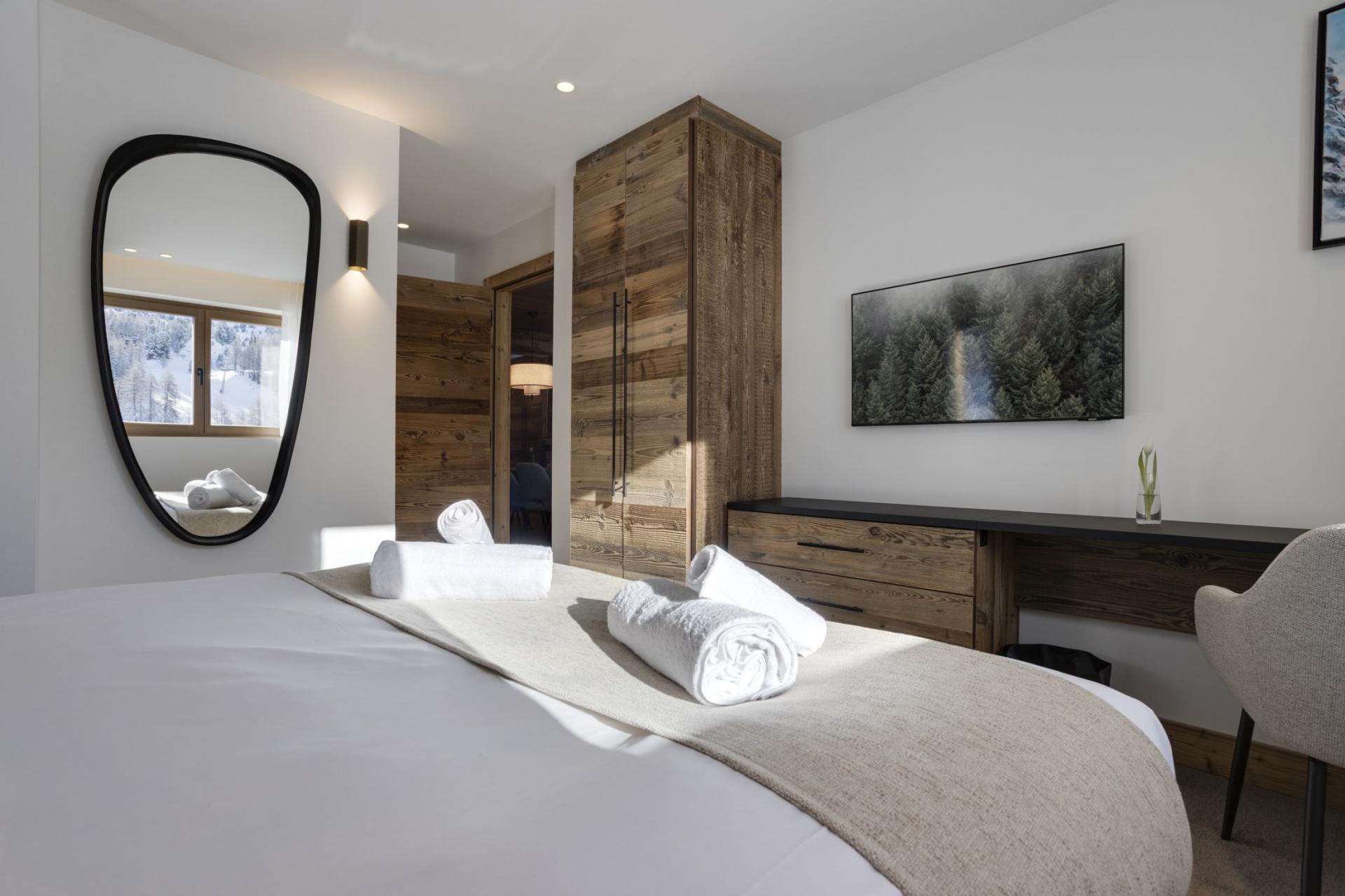 An inviting contemporary alpine chic style fills the living areas of Bellecote Suite, creating a neat design that feels elegant. The semi-open-plan lounge and dining area show off reclaimed wood panelling illuminated by the sunlight streaming through the picture windows of the lounge. Fall into the sumptuous sofas and gaze beyond La Plagne centre to the snow capped mountain ridge behind. A TV hangs above the water vapour fireplace for those calmer evenings spent with your group. Gather around the long dinner table to dine on your homemade meals and retell the day's adventures. The sleek fitted kitchen sits beyond the dining area, separated by a glass wall letting you peek in at your next meal.