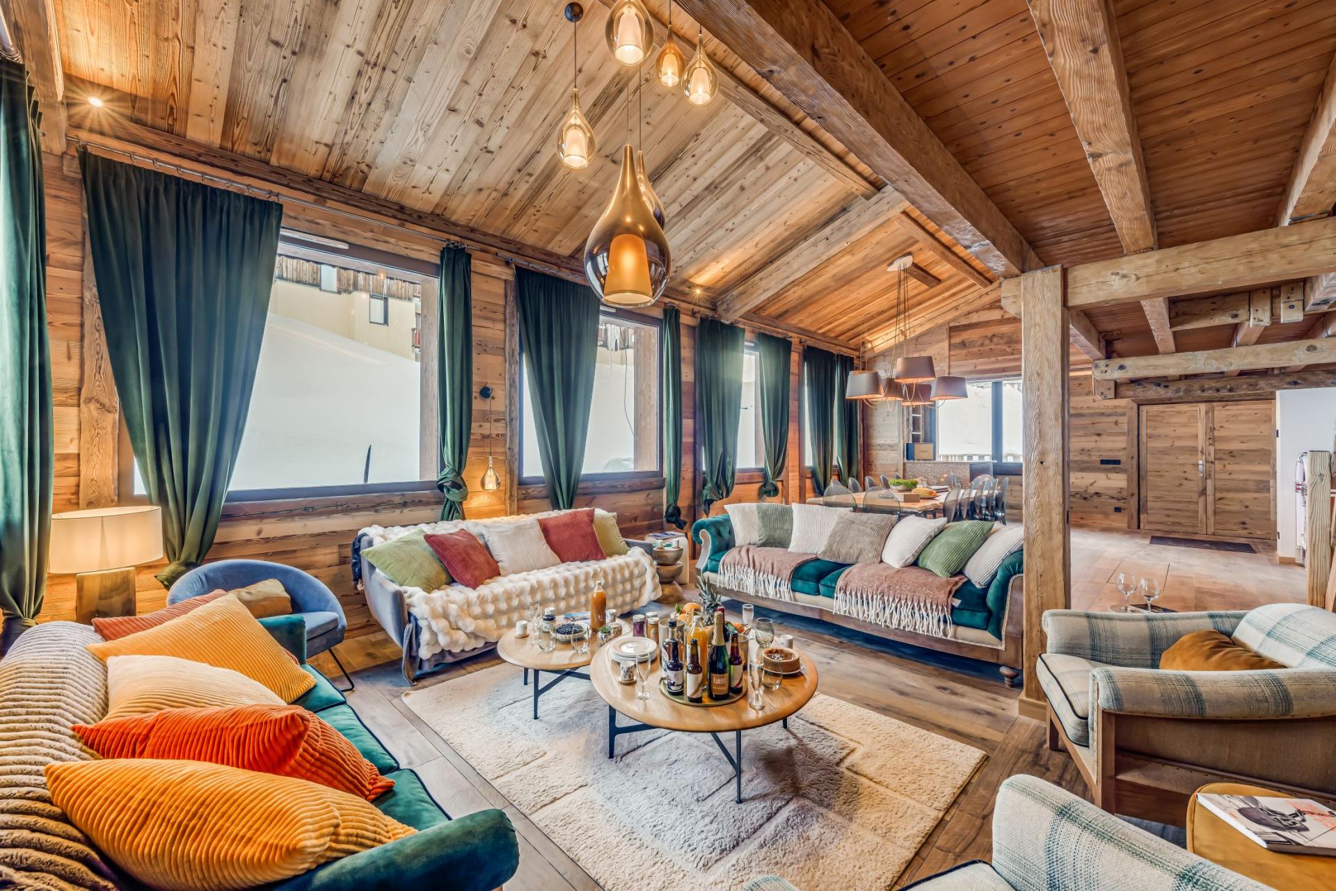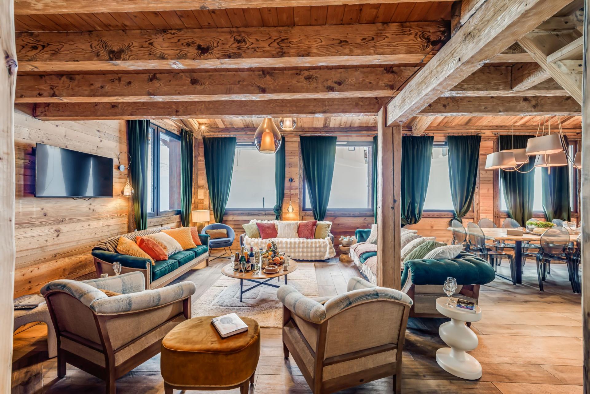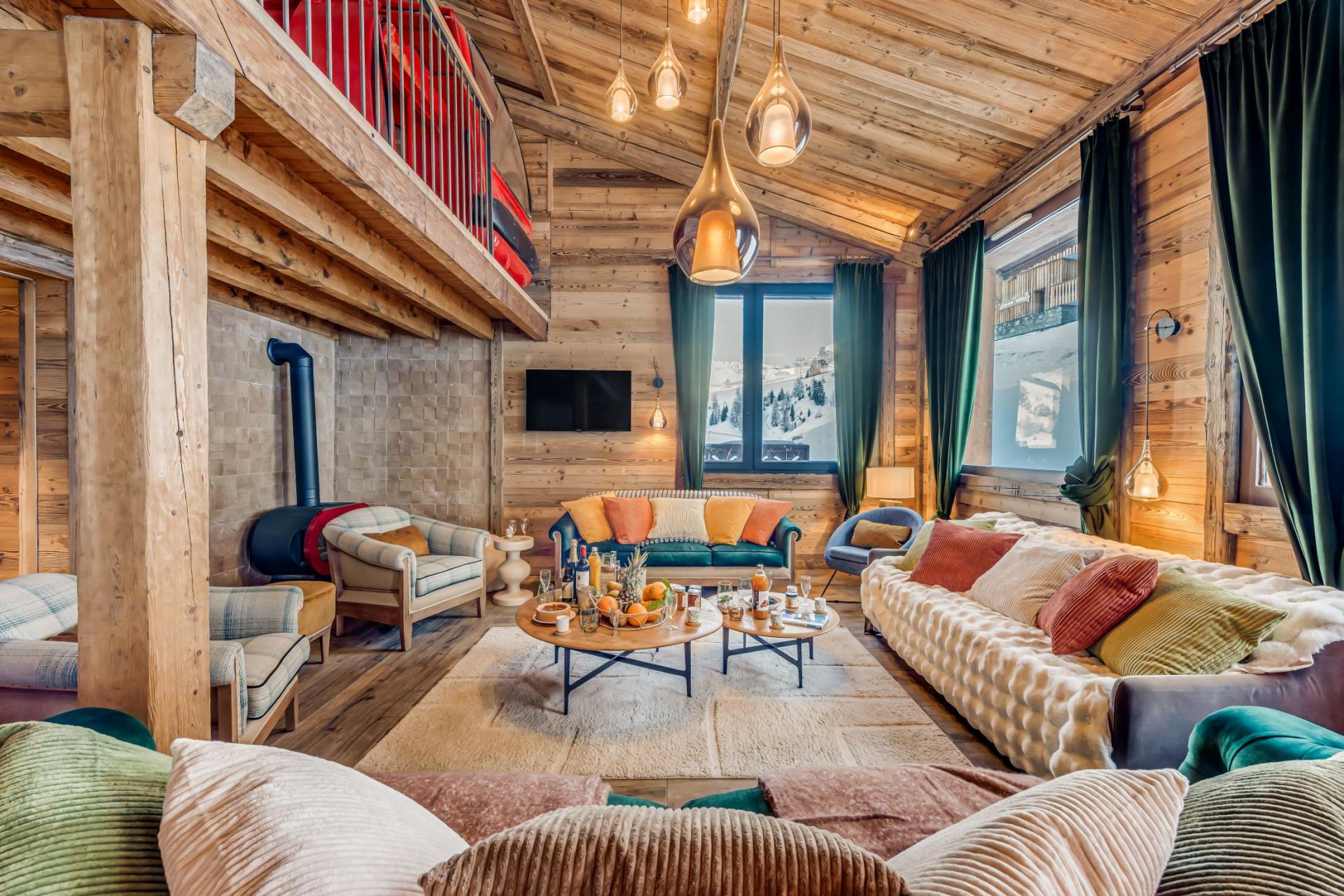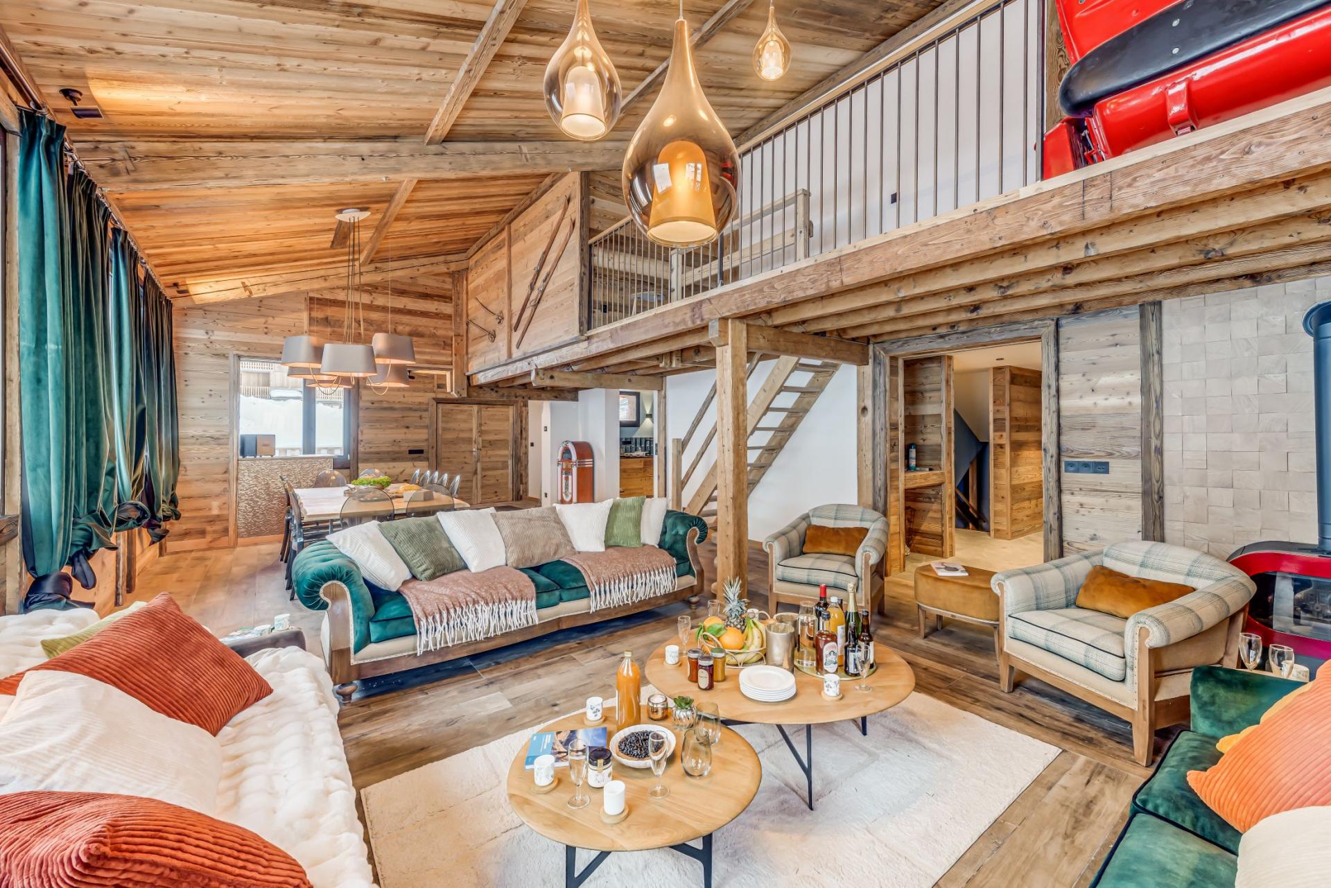 Chalet Riva exhibits a traditional alpine style, with wood-wrapped interiors and an open-plan design, along with sumptuous furnishings and contemporary fittings that showcase its luxurious features. The cosy main lounge and dining area sits across one half of the chalet beneath double-height, slanted ceilings that give the space an airy feel. Plush sofas congregate around a corner log burner fireplace, while an elegant dining table and stylish bar area with jukebox complete the living space. A sizeable, fully-equipped kitchen can be found just off the bar and dining area, where you can whip up delectable mountain meals for dinners together as a group. A charming mezzanine sits above the main living areas, hosting an authentic ski gondola cabin for another area to chill out and relax in.