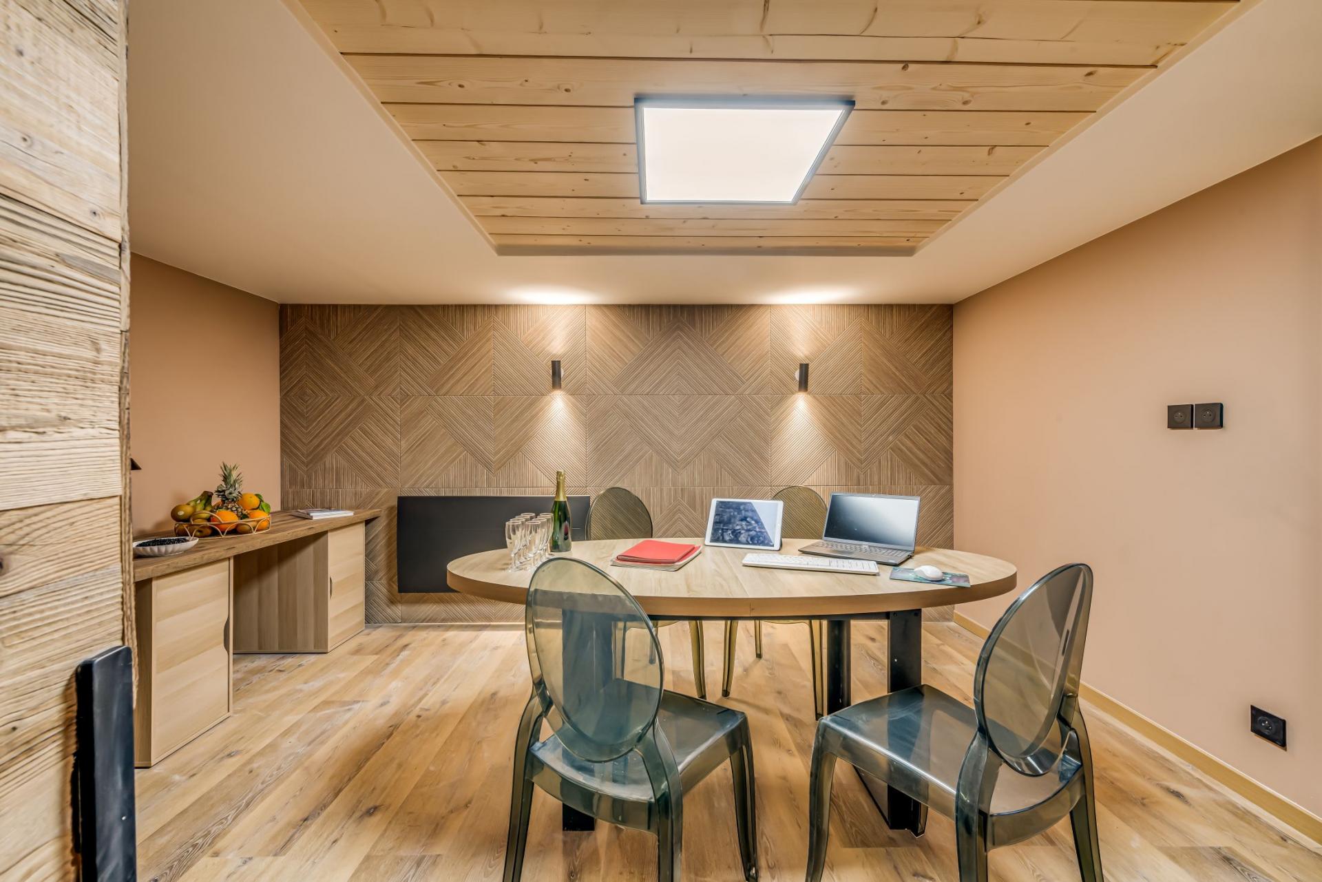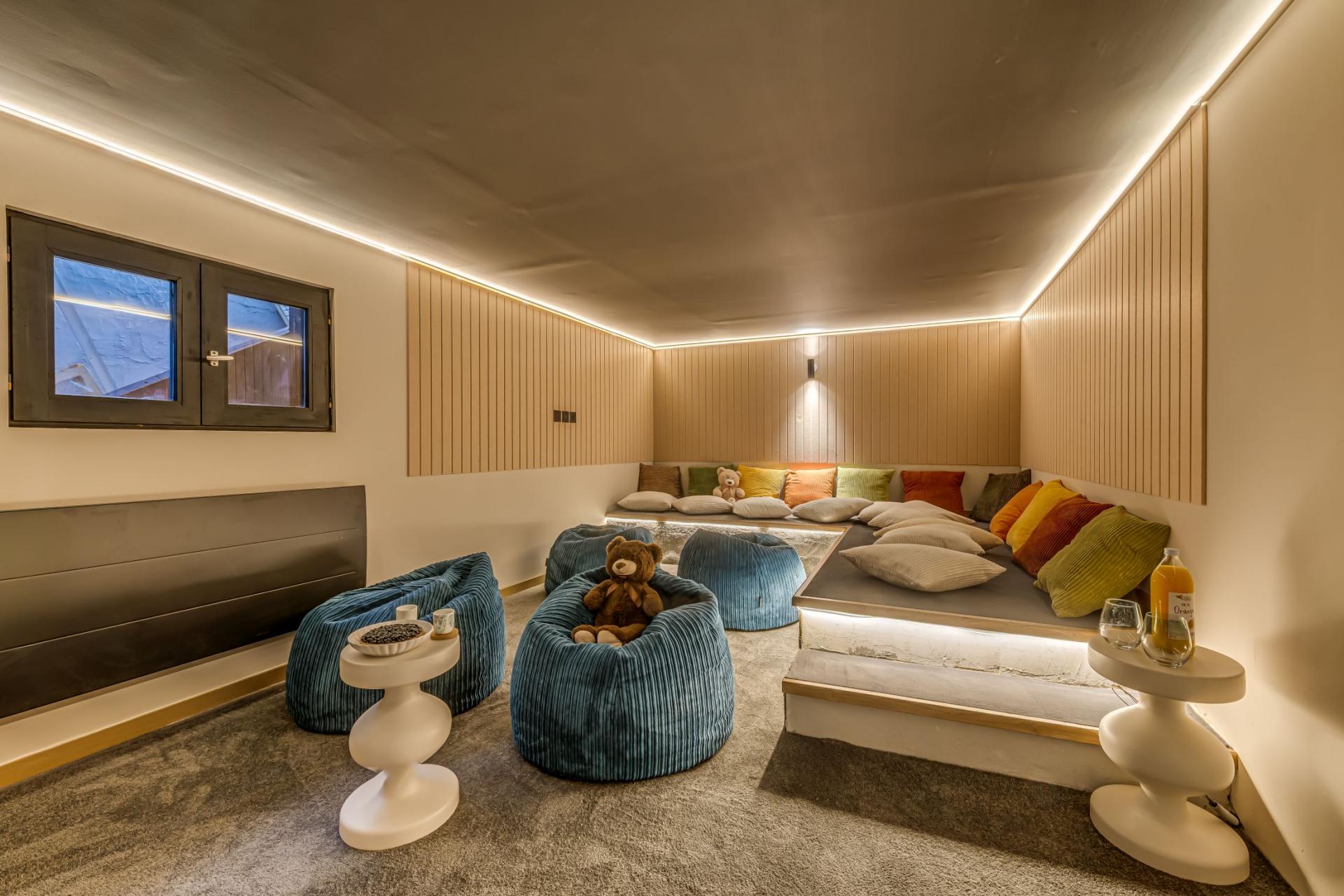 In addition to the wellness facilities, there are a number of spaces across the chalet for entertainment purposes too. A cosy TV lounge with large sofa and TV, and comfortable bean bag seating, is a great way to while away the evening after a full day of skiing in La Plagne. In addition to the bar and jukebox, table football is another fun way to spend time after dinner. And for any corporate groups, the chalet has its own seminar/meeting room, with all the facilities you could need for business meetings.