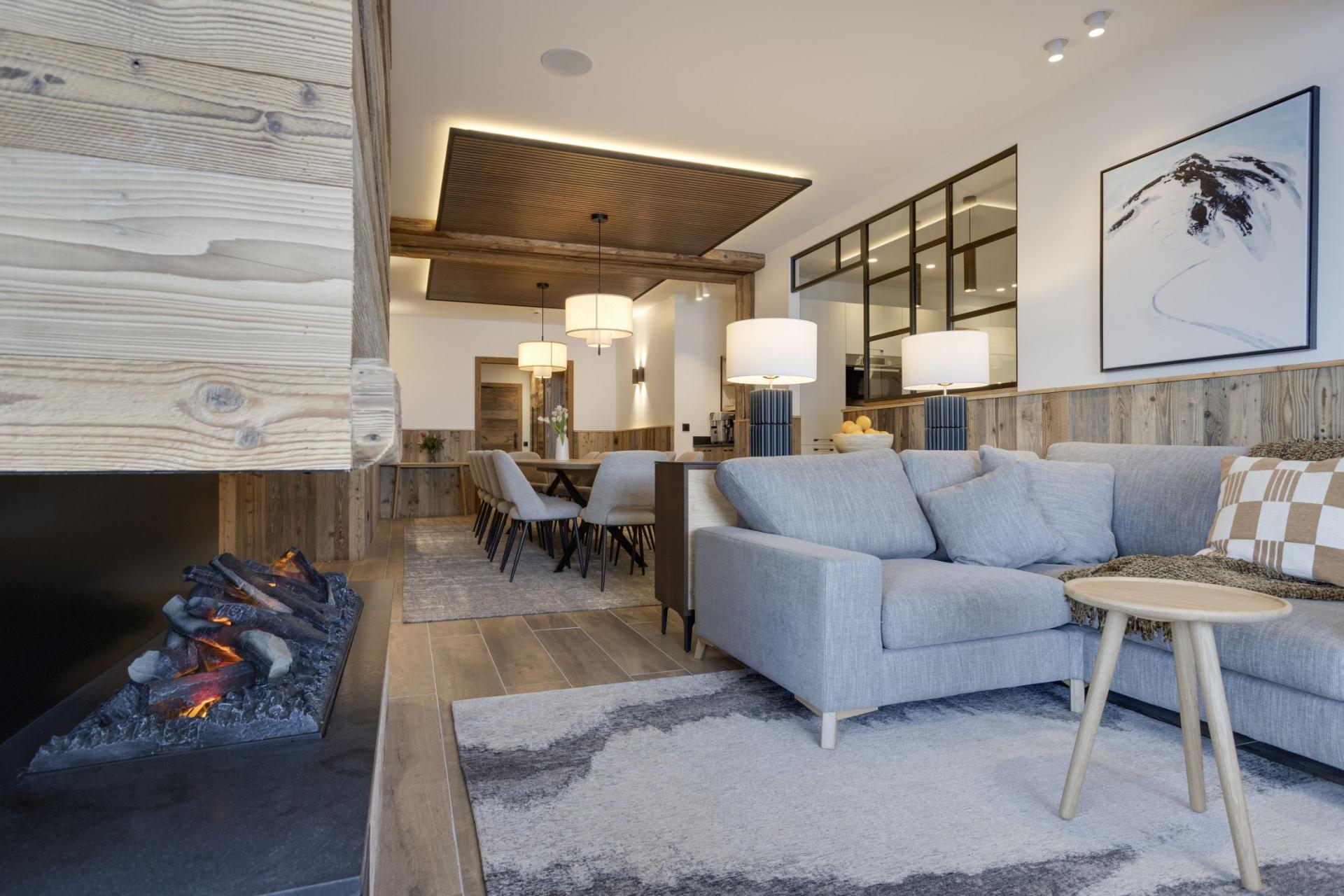 After a tiring day's skiing, retire to the comfort of the substantial sink-in sofas in Jungfrau Suite's open-plan lounge and dining area. Seat yourself beside the picture windows, as the ambient light of the decorative fireplace dances around the room. A TV completes the lounge, perfect for a family movie night everyone can enjoy. The long wooden dining table welcomes 14 guests to share stories over a delicious homemade meal prepared by your dedicated chalet host. Linger long after your dinner, savouring a bottle of wine in great company. The semi-open-plan kitchen has sleek modern fittings and lies behind a glass partition, so you can glance in as mealtime preparations are taking place.