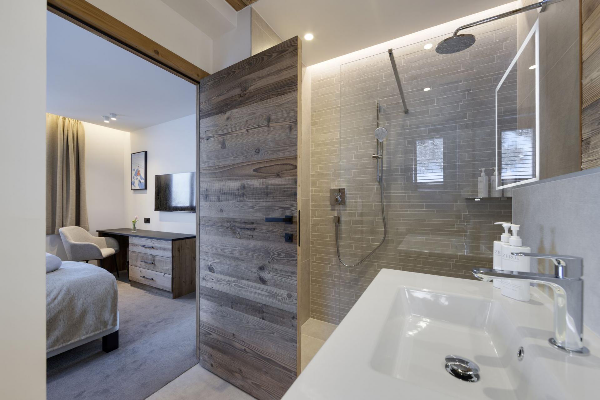 The four bedrooms in Jungfrau Suite follow a contemporary style with neat lines and white walls broken up by highlights of reclaimed wood, sprucing the rooms with an alpine touch. Each room has an en-suite for added privacy. The largest room sleeps six with a double/twin bed and two additional bunk beds, a second family style room sleeps four with a double/twin bed and one additional bunk bed. The last two rooms are both double/twin bedrooms.