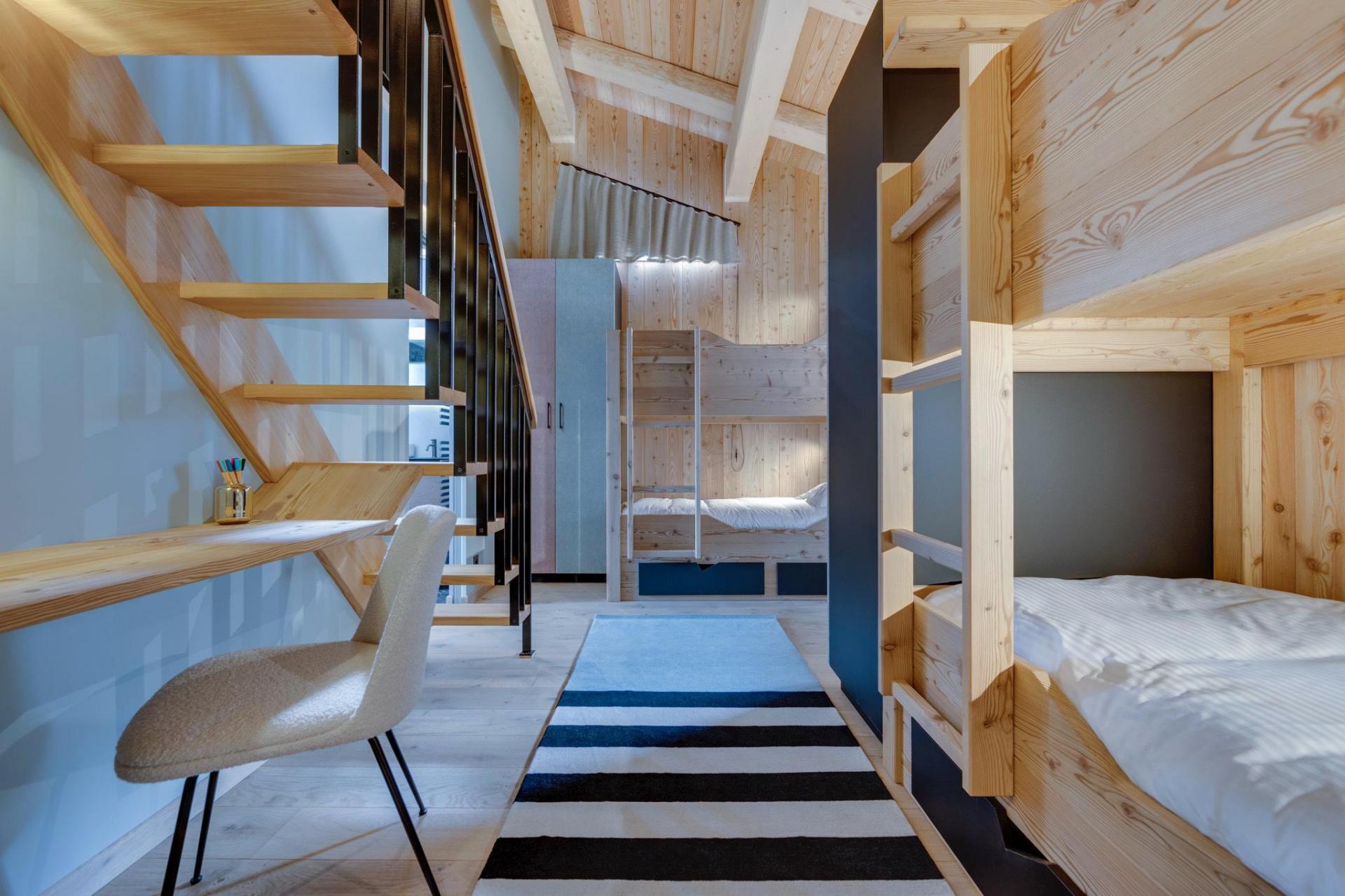 Chalet Bela Vya 1 can accommodate 12 guests across 5 bedrooms. The bedrooms all follow a similar design to the rest of the chalet, making use of blonde wood and large windows that capture natural light. Plush bedding ensures guests ample rest in a bountiful environment for downtime. All bedrooms except for the bunk room are equipped with en-suite facilities, while an additional separate WC is also available. Some rooms open up to private balconies, offering guests space to enjoy the amazing valley views.