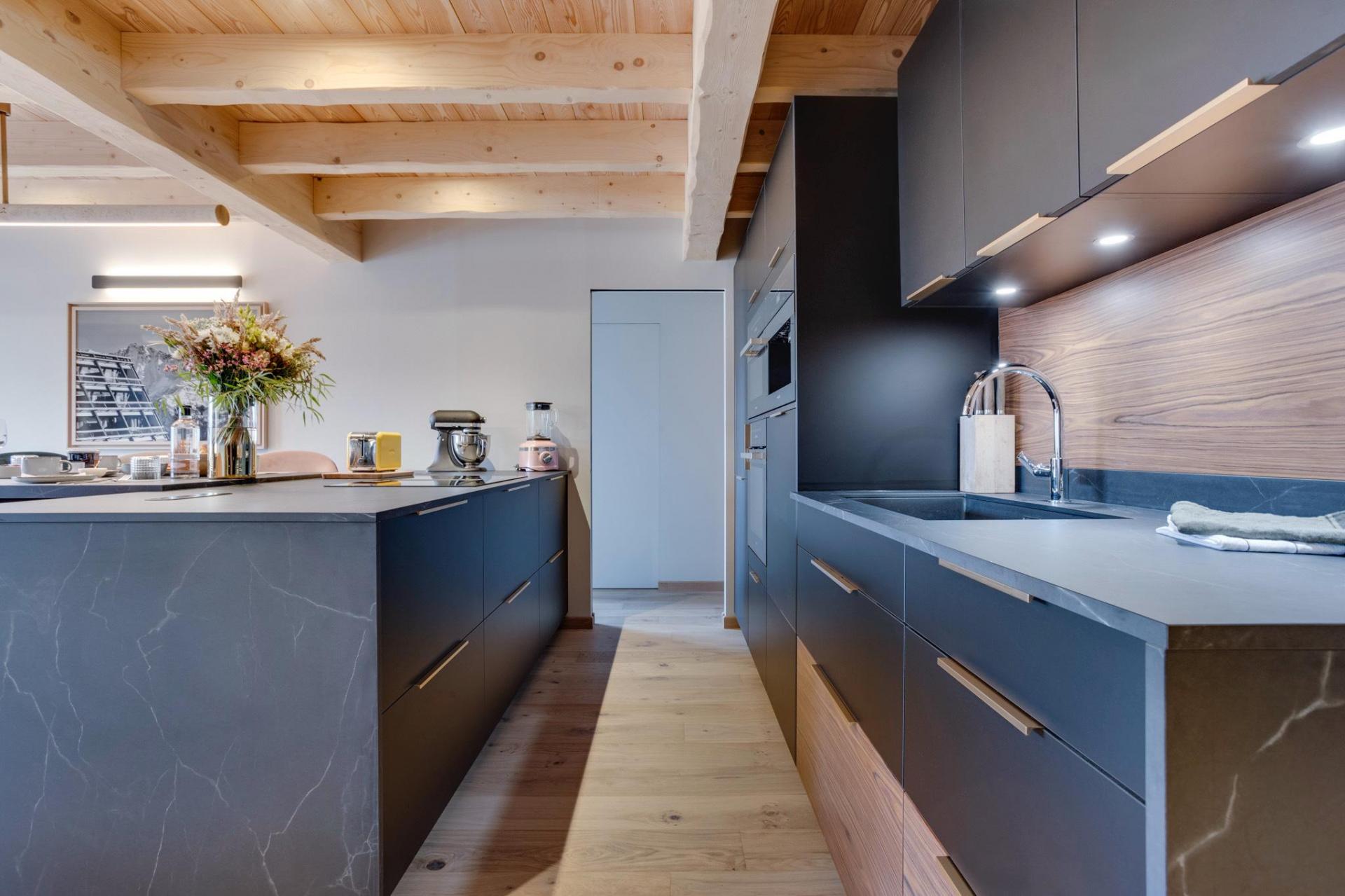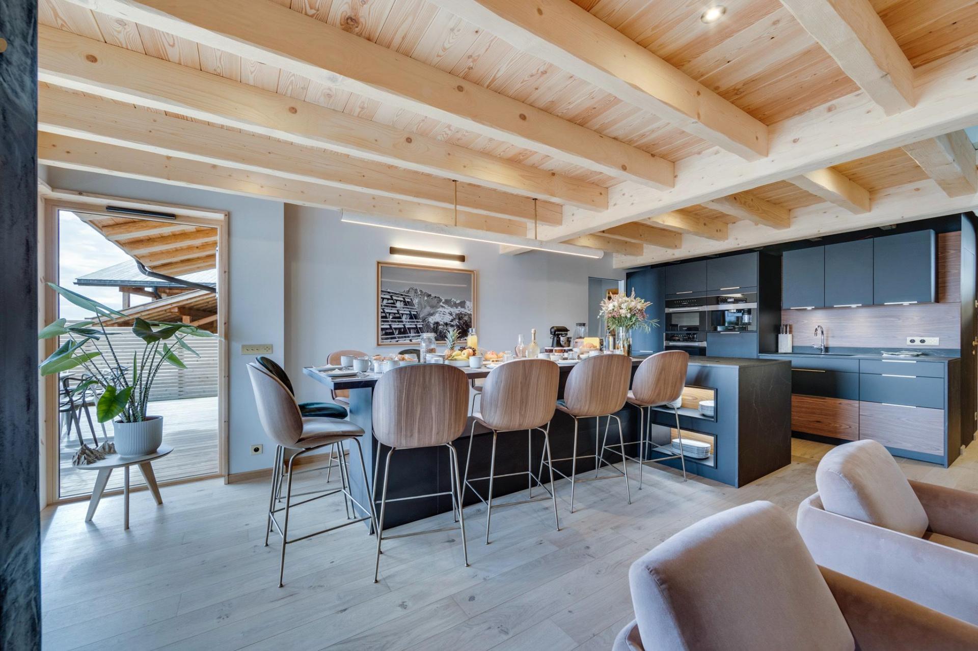 Paying homage to its heritage, the chalet is designed using noble materials of blonde wood and stone. Plenty of natural light seeps through the windows, illuminating the entire chalet, breathing life into the build. You are welcomed by a large open-plan living space connecting the kitchen, dining room, and living room. After a tiring day on the slopes, the plush, contemporary sofa is on hand to catch you as you rest your legs with a glass of wine curated from the wine cellar. A central fireplace keeps guests toasty through the entirety of your stay. Alternatively, sit by the kitchen at the breakfast bar or large dining table to involve the group's appointed chef as they create a gastronomical masterpiece. The furniture follows a very modern-luxe design with a contrasting colour palette of dark and light tones, appealing to the eyes. The terrace is accessible from this area, allowing for a more intimate view of the French Alps and Tarentaise valley.
