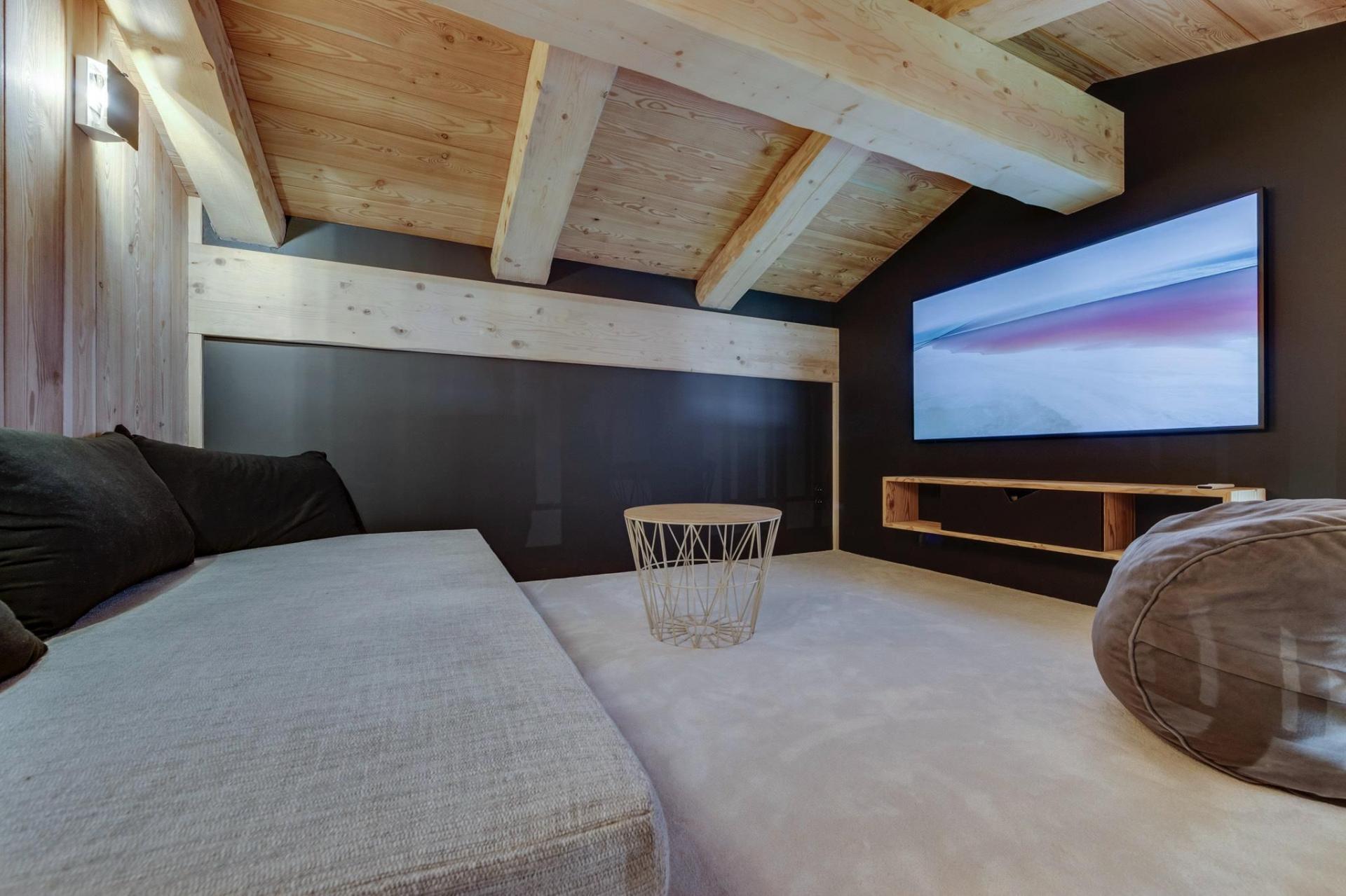 Inside the chalet, a spiral staircase takes you up toward a TV mezzanine lounge, for those looking to fill up some free time catching up on a favourite show or looking to set up a family movie night.
