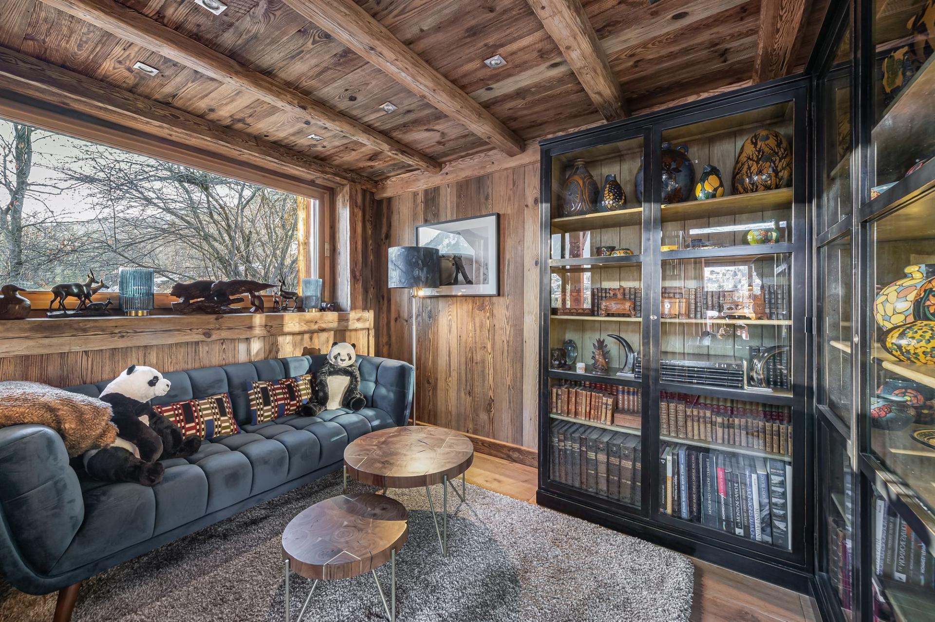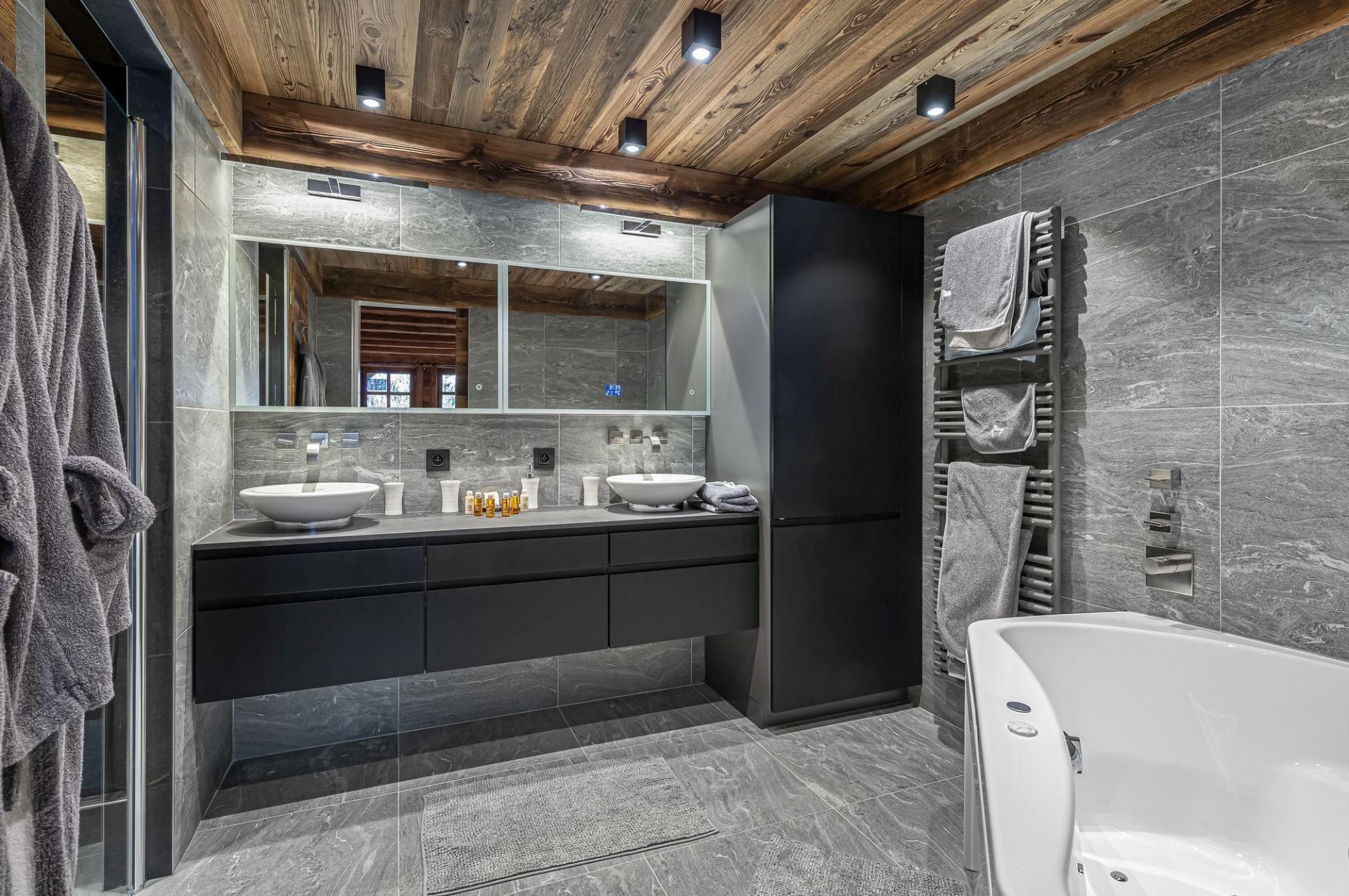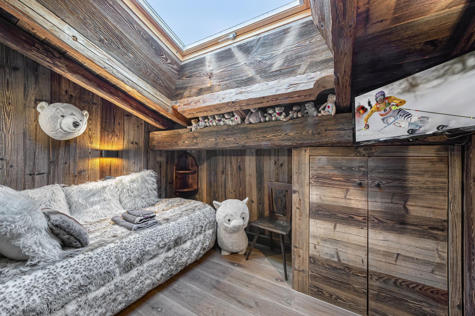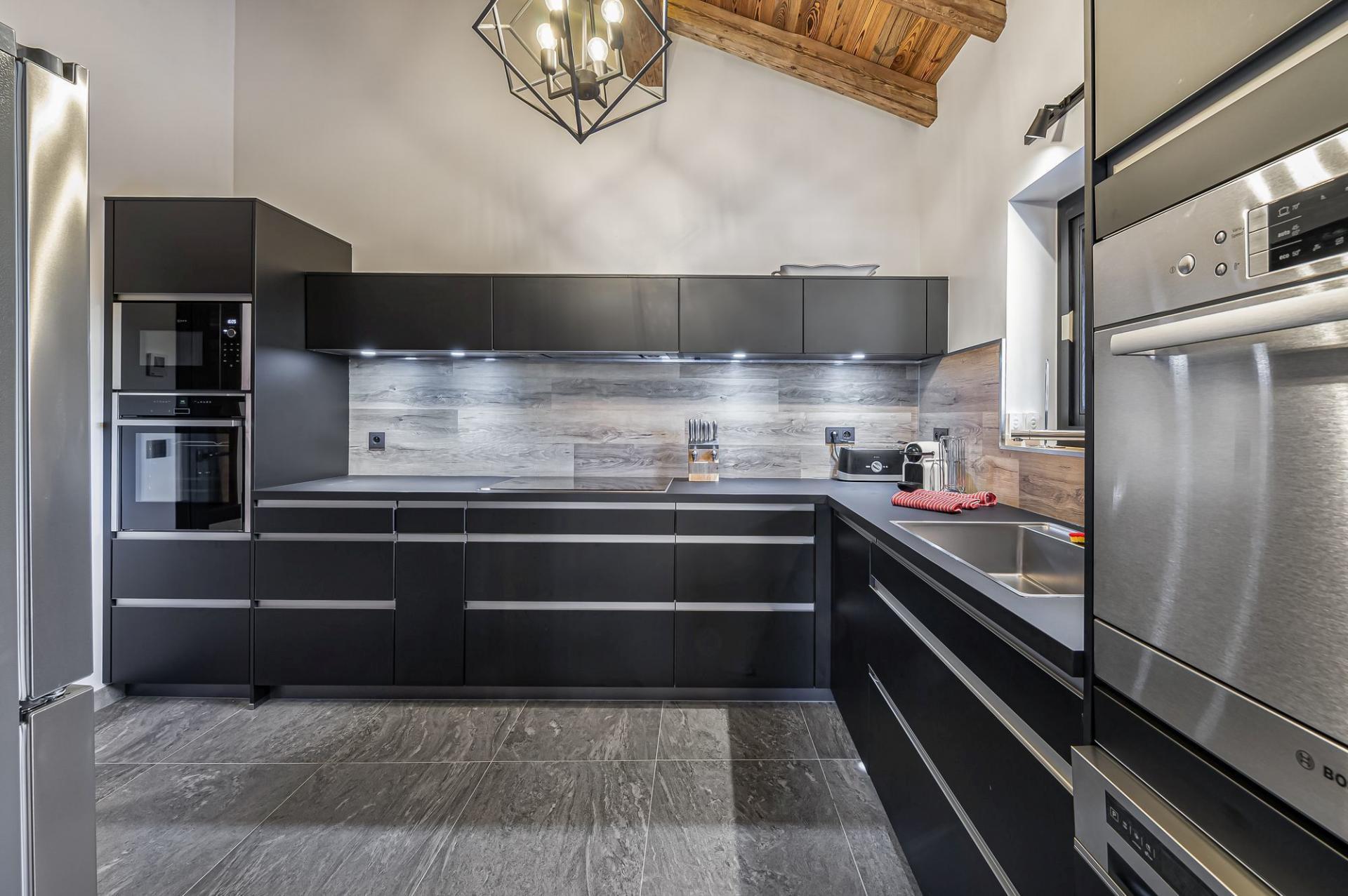The large open plan living area offers a beautiful space with panoramic views over the resort and the Rochbrune ski area beyond. The exposed wood and large central fireplace create a cosy alpine feel to the room. The fully fitted kitchen and dining area are also open plan, providing a large and light space for relaxing and dining. There is also large wrap-around balconies for you to enjoy here too and a small office for those needing to catch up on work while they are away.