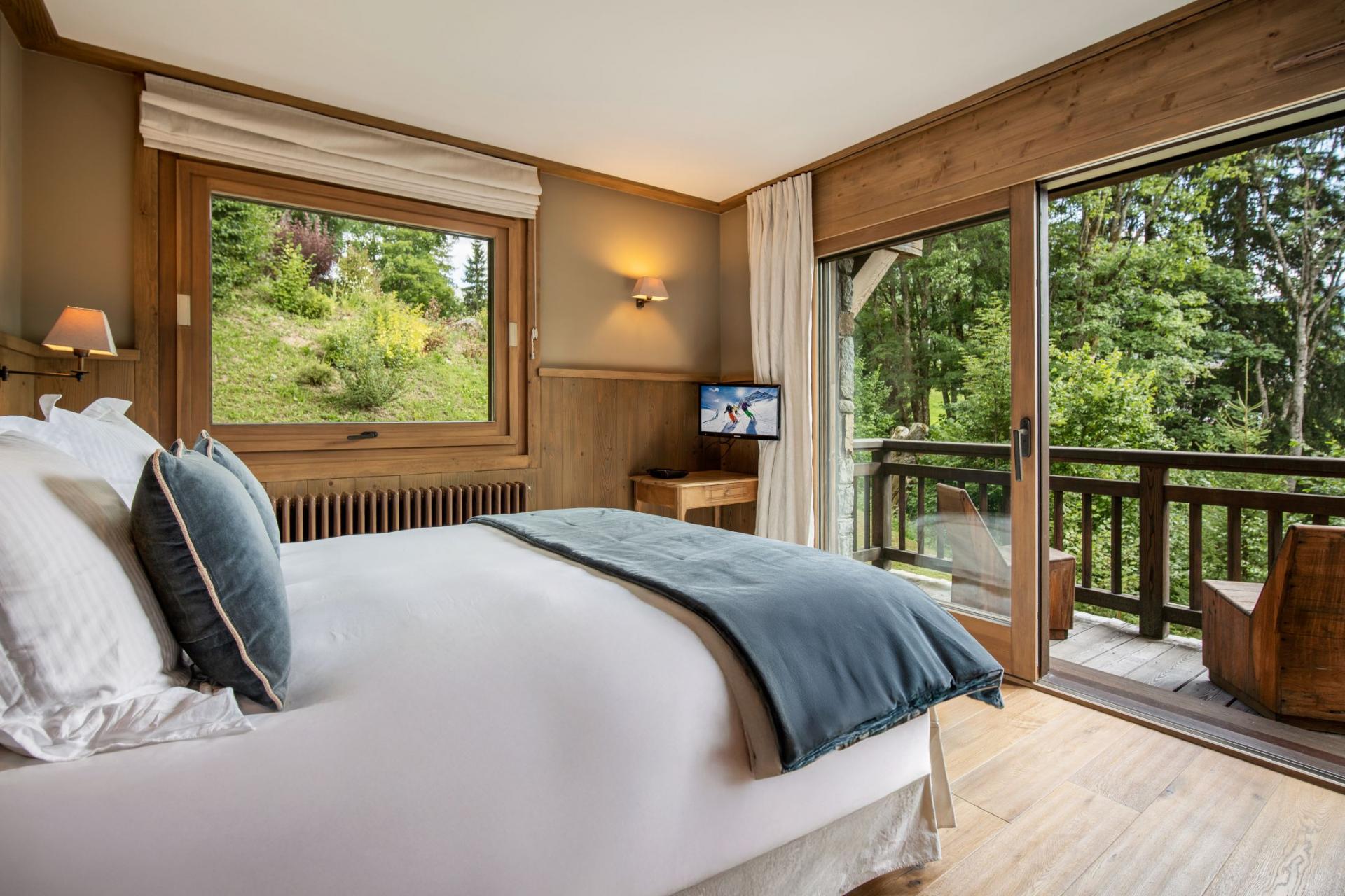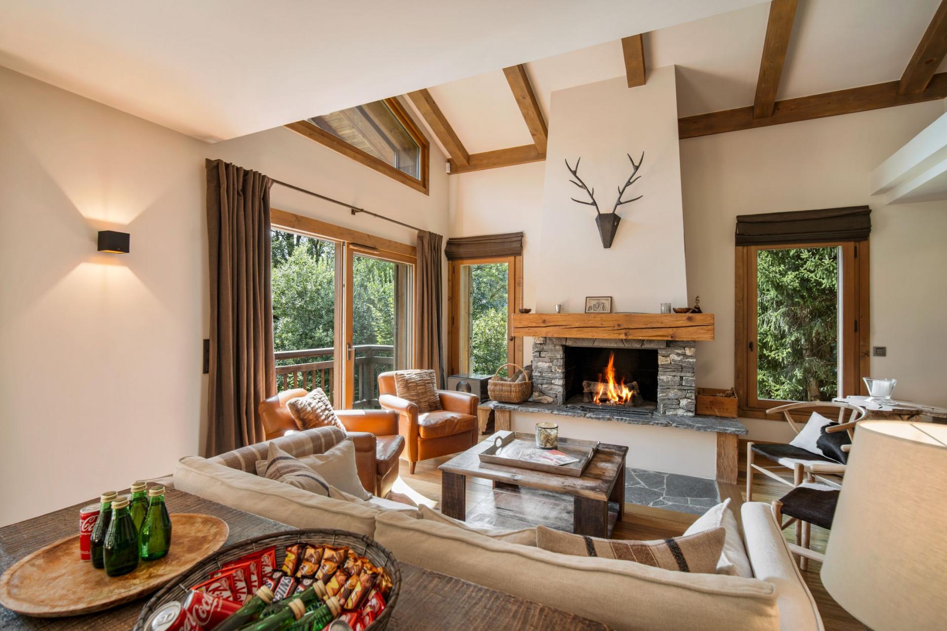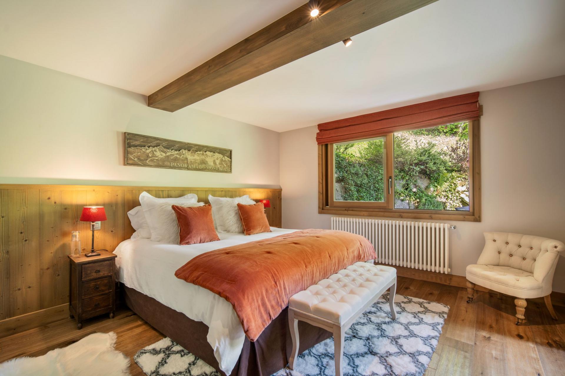 As you enter the chalet, you are greeted with a bright, interconnected area between the living and dining spaces. Plenty of natural light seeps into the chalet, and illuminates the contemporary furnishings, giving you a warm home-away-from-home feeling. The fireplace only enhances this feeling, found in the living room and heating the whole floor, ensuring guests are nice and toasty, no matter where they choose to relax in the evening. Family game nights on the comfy sofas or board games in the dining room on a table fitting up to 10 guests work a treat for some family downtime as the group's appointed chef creates a culinary masterpiece in the kitchen. This southwest-facing property provides terrace access from both the kitchen and dining room, looking out onto the river, showcasing picturesque views of the Mont Blanc mountain range. An evening nightcap looking out at the majestic view really washes away the fatigue from a busy day on the slopes.