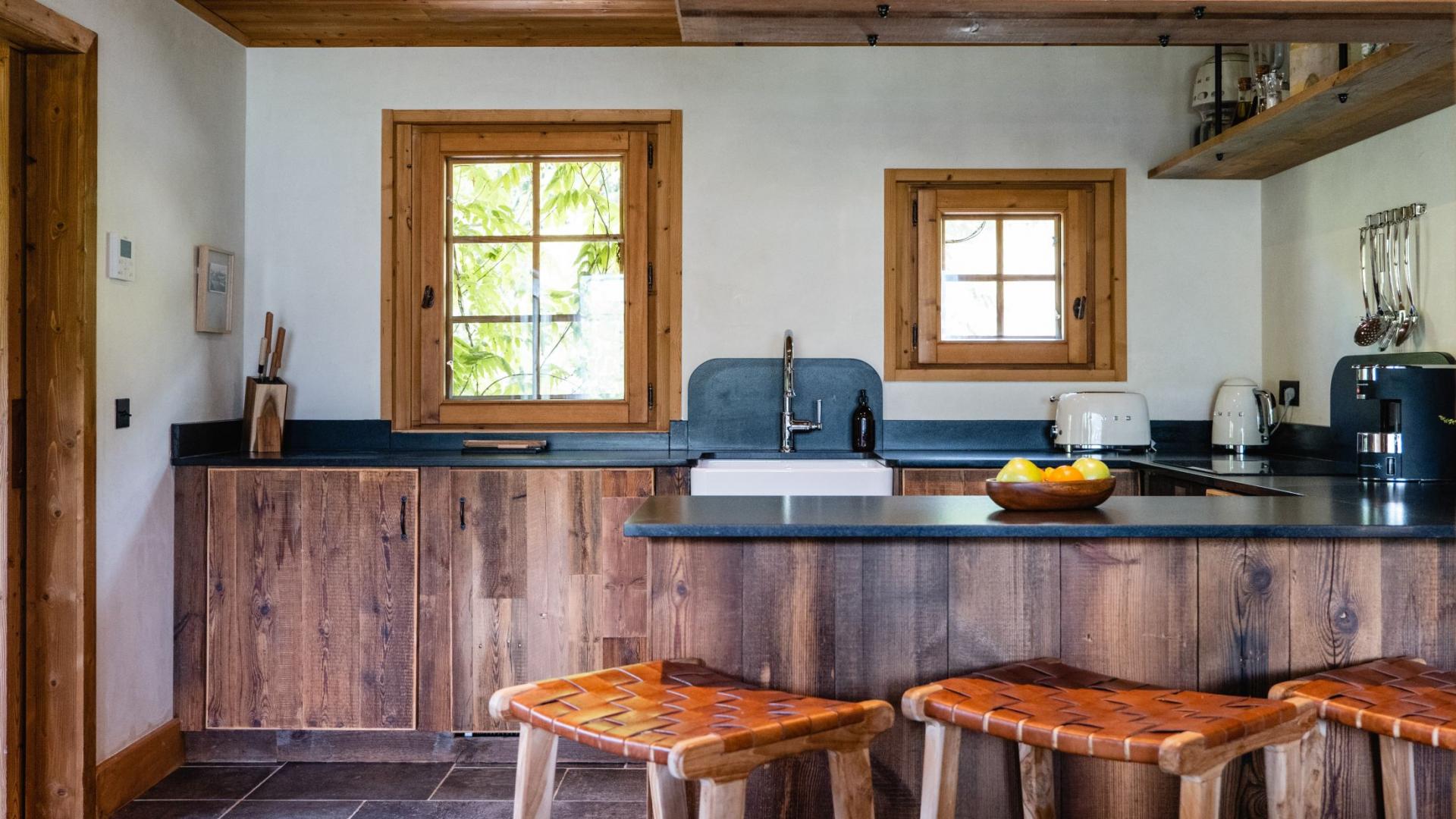 The chalet's main living floor is home to a comfortable lounge, perfect for snuggling on the deep sofas, catching up around the feature fireplace, or wandering onto the large balcony for pre-dinner drinks with a world-class view! Neighbouring the living space is the chalet's dining room with its beautiful oak table. Here guests can enjoy hearty meals while the sun sets through panoramic windows alongside. This floor is also where guests will find the fully-equipped farmhouse style kitchen and a reading corner/study.