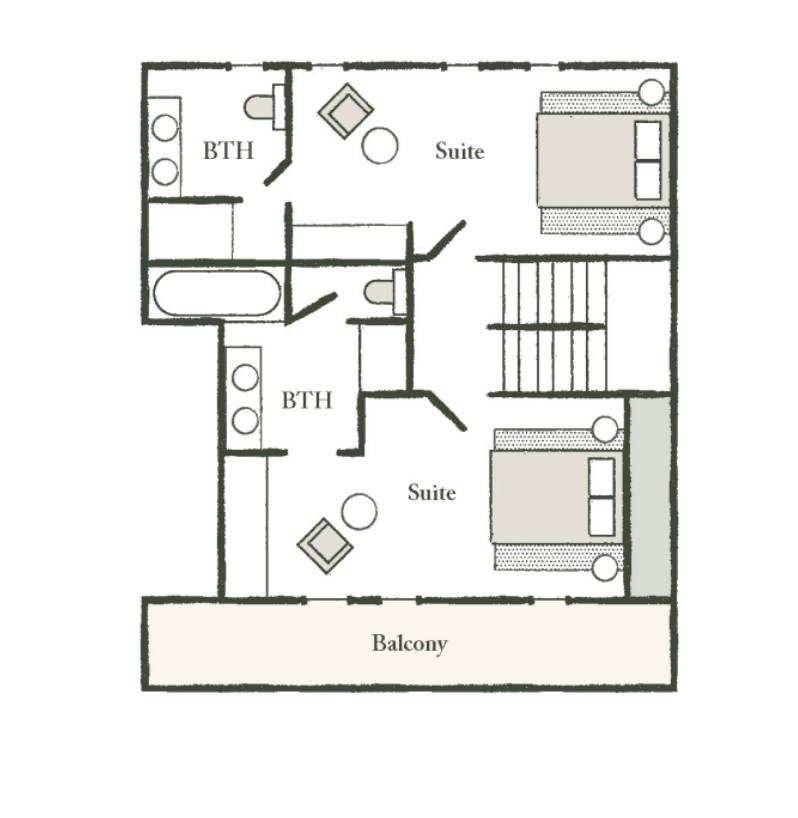 Chalet Eustache has 6 lovely bedrooms. On the Garden Level there's two ensuite double bedrooms, each with direct balcony access. There's also an ensuite family suite with a double bedroom, additional sleeping nook for a child, and a living area with kitchenette which opens out onto a terrace. On the chalet's first floor there's a double ensuite bedroom.
