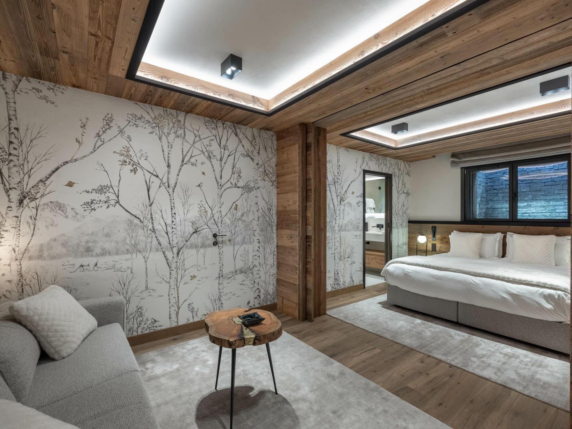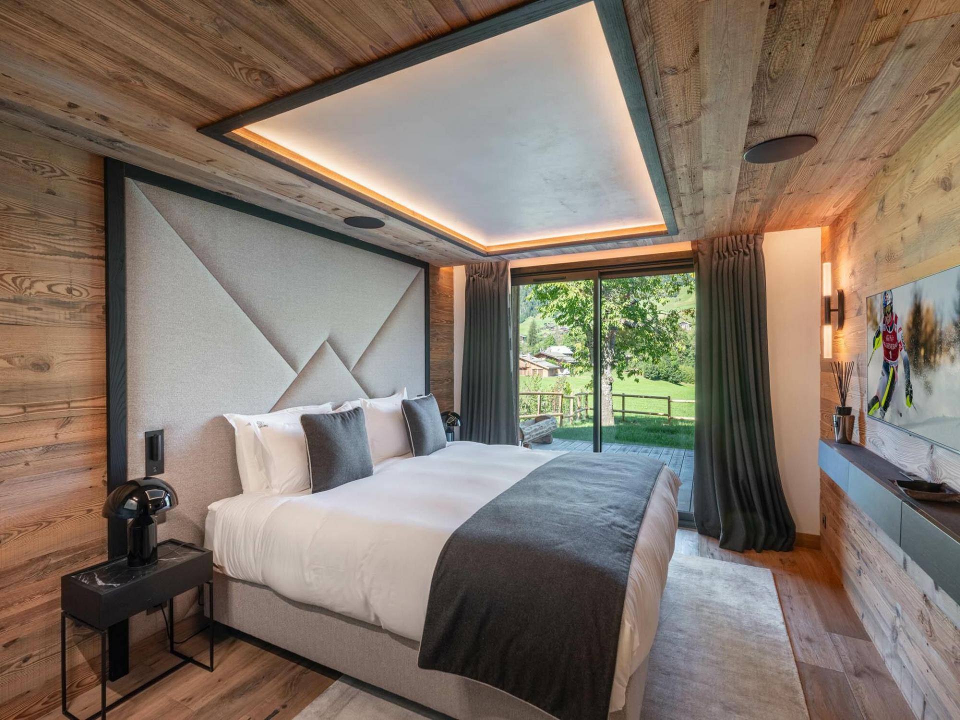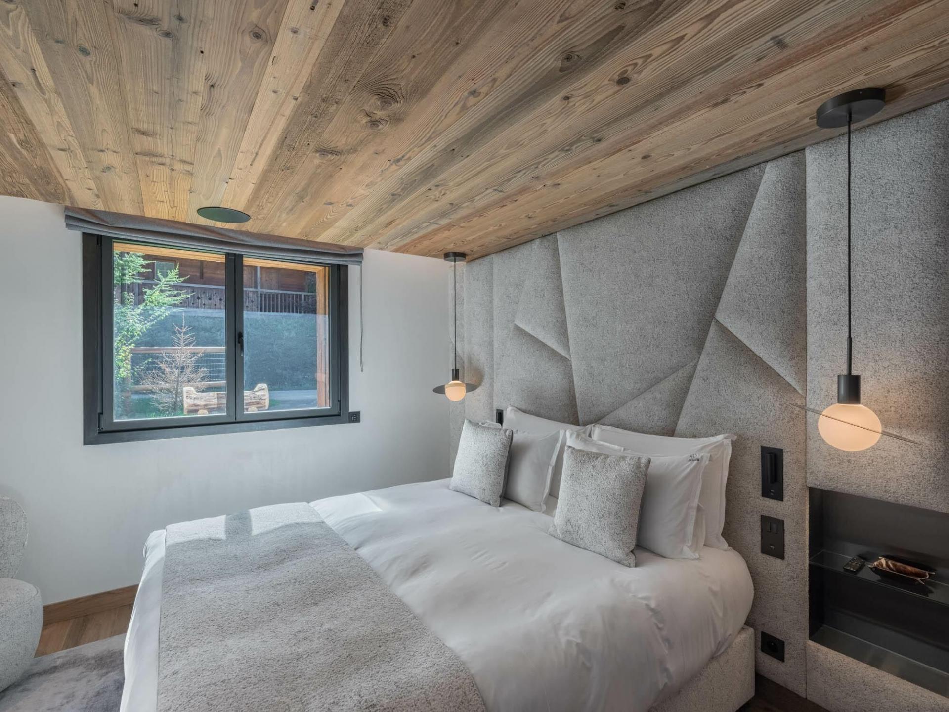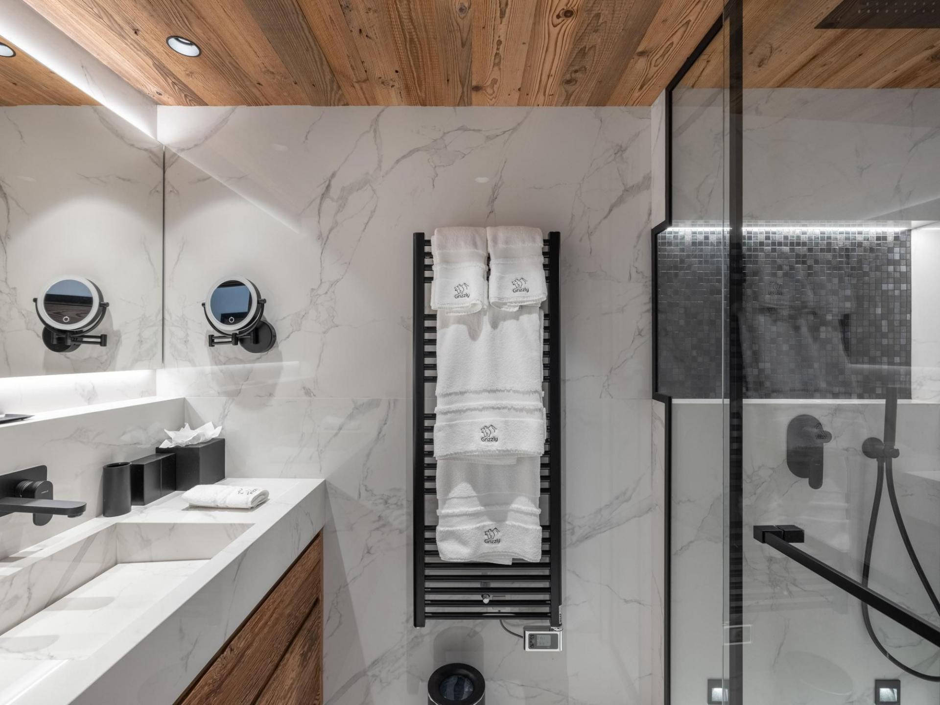 Chalet Grizzly can accommodate up to 12 guests across 6 en-suite bedrooms, fitted with either a shower or bathroom. With a similar design to the other areas of the chalet, the bedrooms feature an interior style blending wood, modern accents, and soft lighting. Vaulted ceilings with exposed beams are also prevalent in select bedrooms. Plush bedding ensures ample rest for guests, while many of the rooms provide access to the terrace or a private balcony.