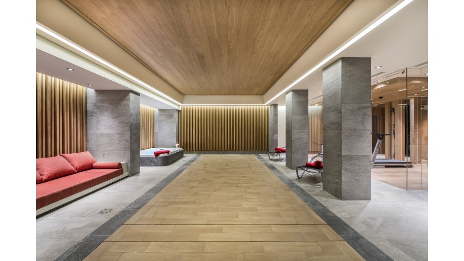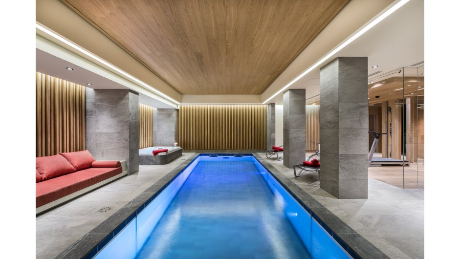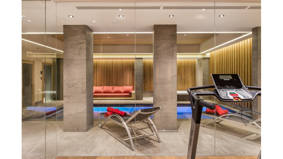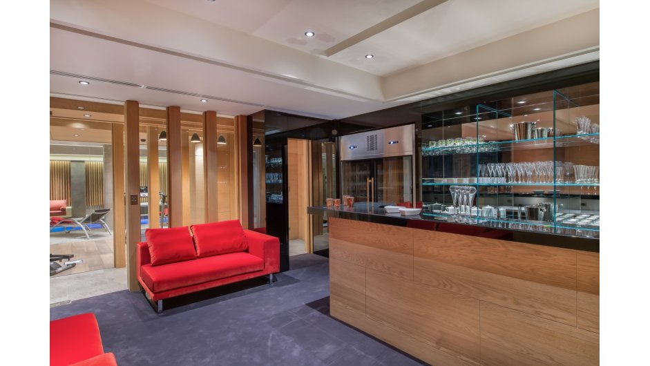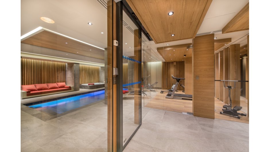The lower ground floor level of this luxurious property features a fantastic wellness area for the whole family to enjoy. It includes a relaxation area with sauna, hammam, shower, jacuzzi and swimming pool with mobile bottom - the floor disappears and the water rises! There is a glass fitness room with views over the pool and ski room with heated boot warmers. This level also has a cinema room, bar area and wine cellar plus a garage area with washing area which is connected to Chalet B. There is an internal lift to all floors.