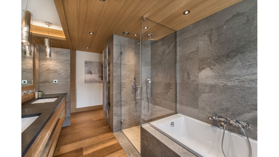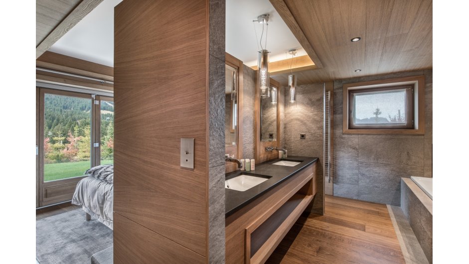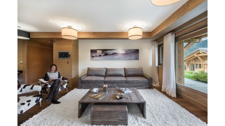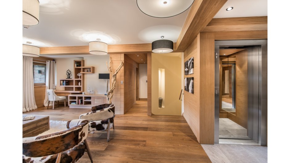 Taking the stairs or lift to the ground floor, the chalet has a "winter" living area with terrace access plus four double en-suite bedrooms and dressing rooms.