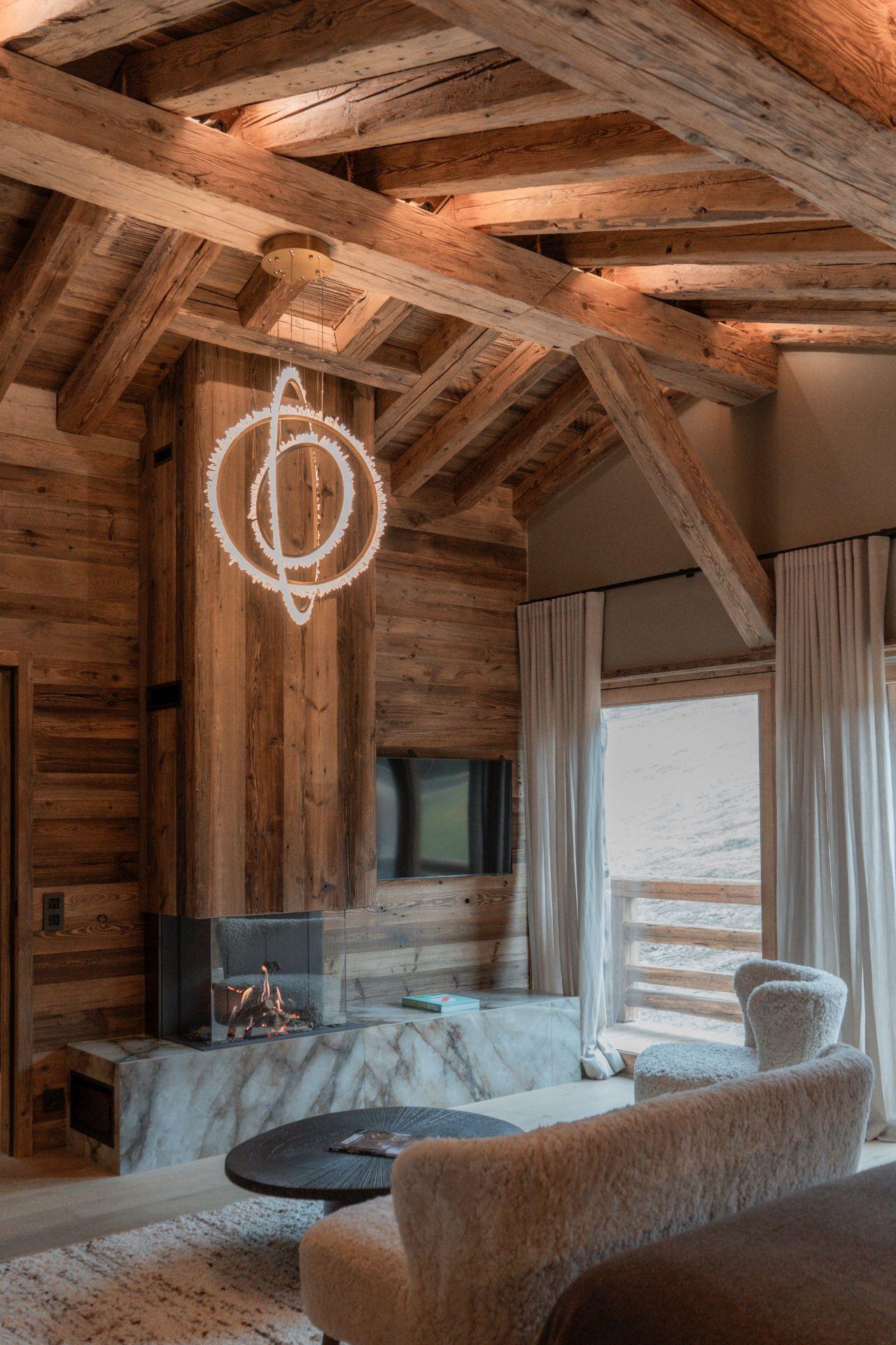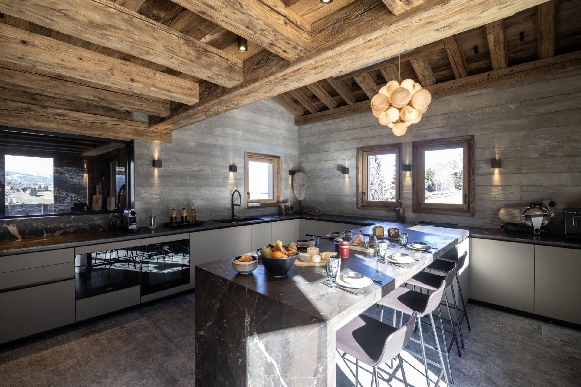 Le Chalet de La Croix's first floor is home to the property's main living areas, decorated in a contemporary mountain style with modern furnishings, exposed woods, decorative artwork and a neutral colour palette. The impressive fireplace divides the lounge areas found in this open-plan environment. To one side, ample sofas and armchairs sit beneath exceptionally high ceilings and a magnificent window wall, that truly elevate the chalet's refined and spacious atmosphere. Behind the fireplace lies a TV corner, for relaxed viewing in a cosy snug. The large dining table sits next to the living room, with a bar area found just beyond where accompanying evening drink concoctions can be made. An elegant kitchen is hidden away in the corner, with enough space for guests to cook together and a roomy breakfast bar that encourages conversation.