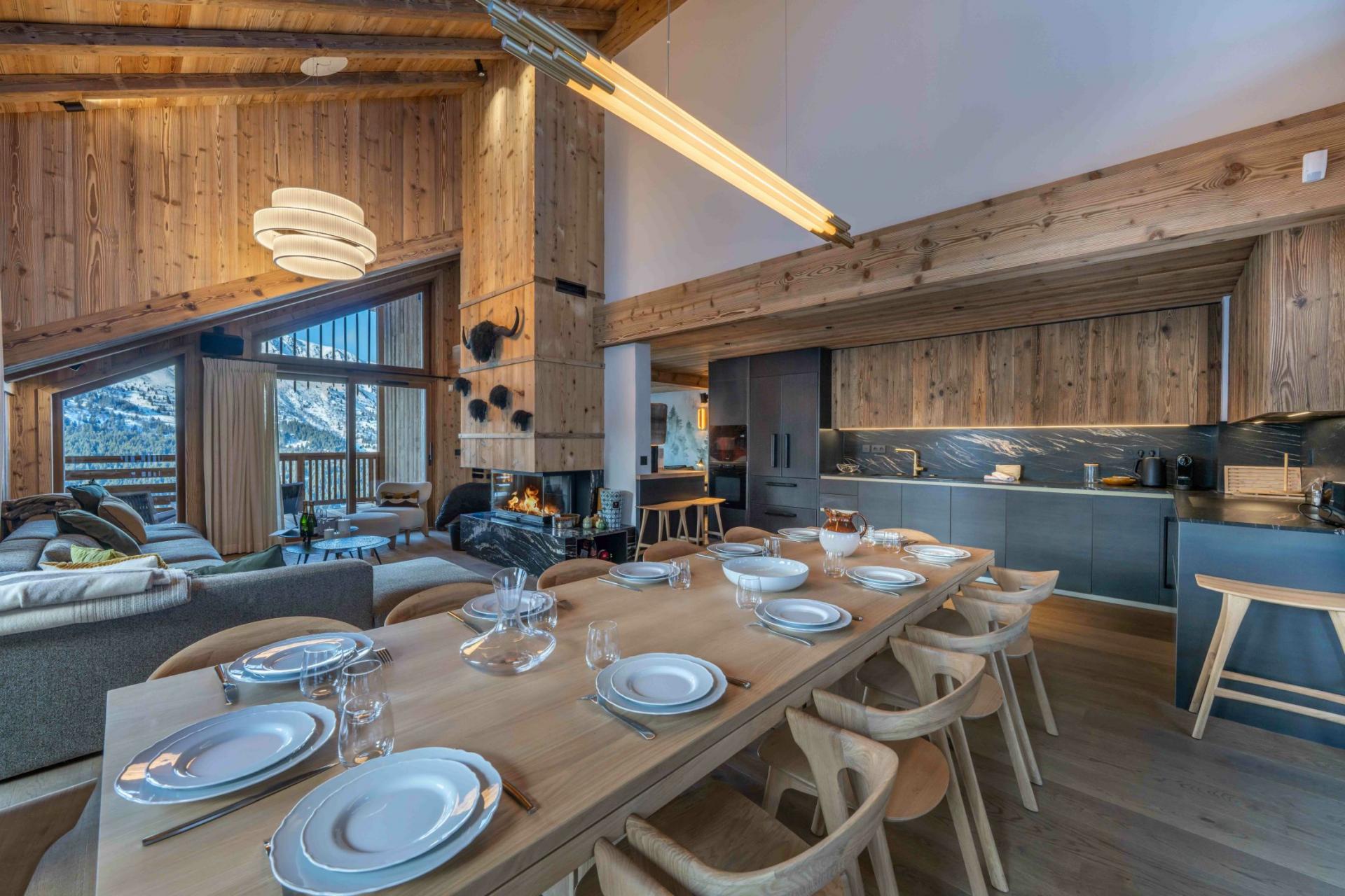 The main living spaces of Apartment Bois des Ours 701 are warm and inviting, featuring refined wood interiors, an open-plan concept, double-height ceilings, and elegant furnishings. This spacious, free-flowing living area includes a lengthy lounge sofa positioned before the warmth of a feature fireplace. Tucked away to the side of the main lounge, Apartment Bois des Ours 701 features a secondary lounge area, a cosy and stylish spot that functions as a TV snug, perfect for unwinding with a relaxing movie night for you and your group. Also located adjacent to the lounge spaces is the apartment's dining table, which exhibits a style of Scandinavian minimalism, alongside a fully-equipped fitted kitchen. Glass doors and windows help fill the space with natural light, and open out to multiple balconies, where guests can escape to for some fresh mountain air and views of both the slopes and glorious mountain panoramas.