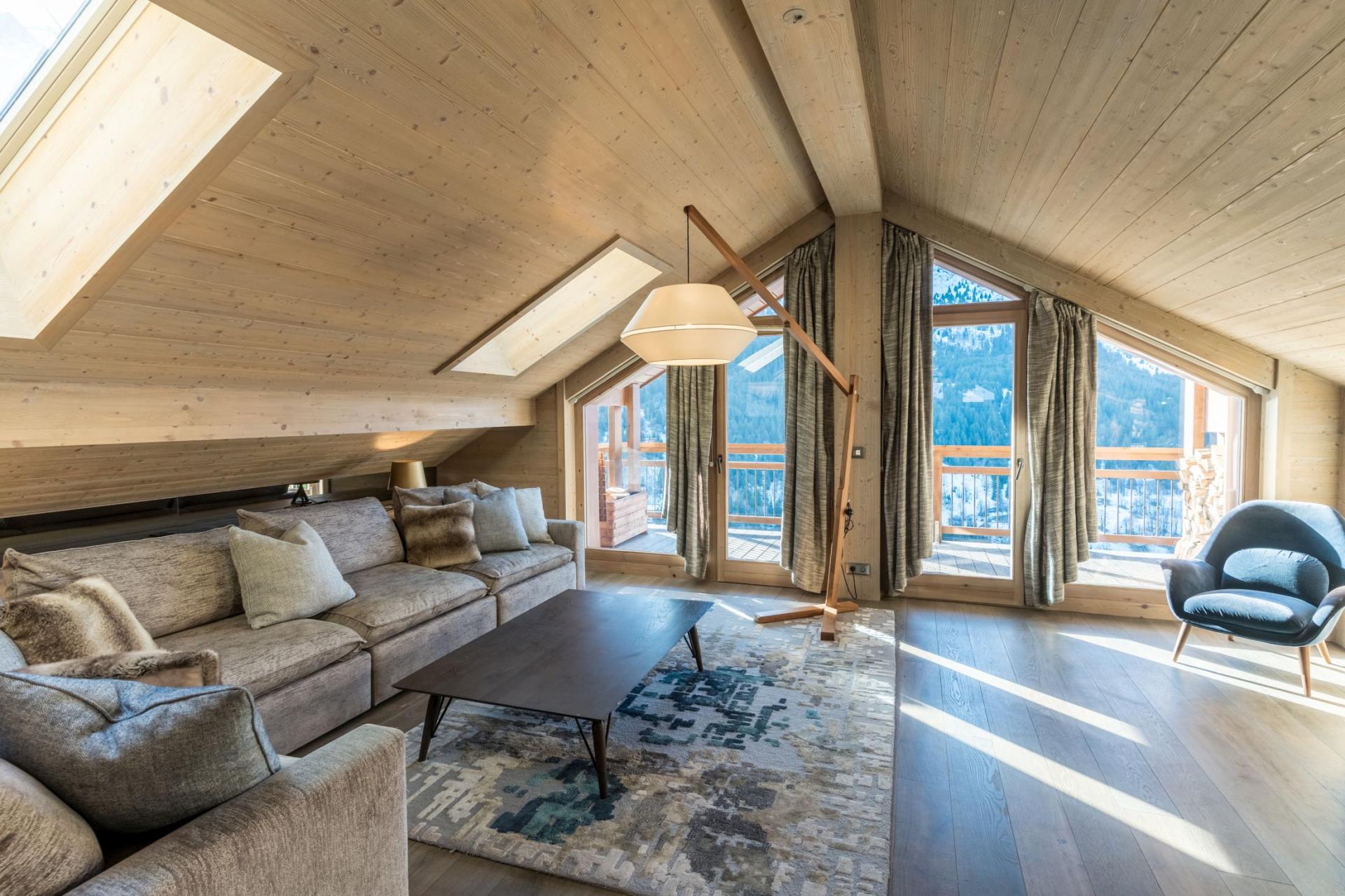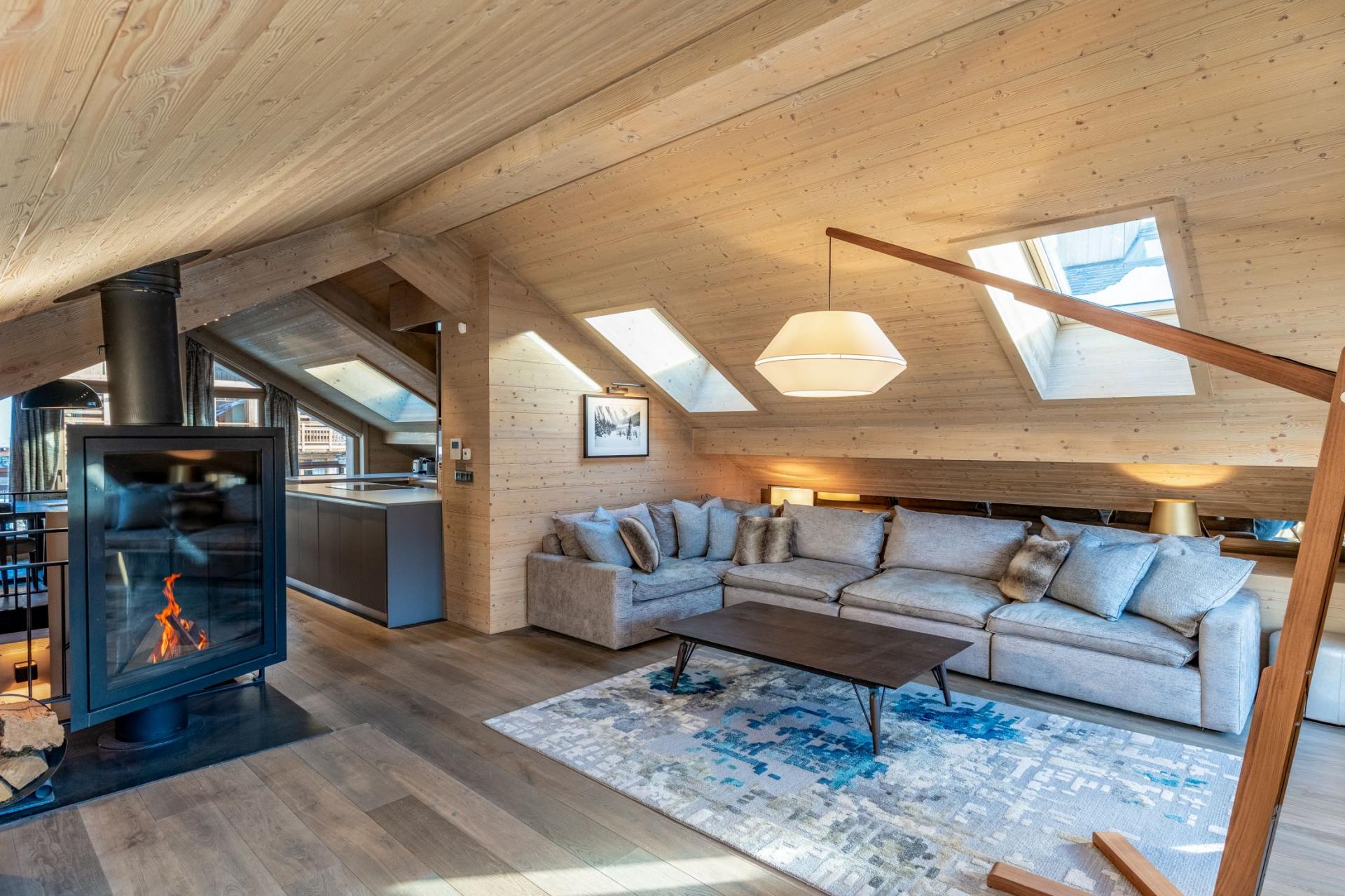An open-plan living area consisting of a cosy lounge, and well-equipped kitchen and dining area occupy one floor of Apartment Tueda. Vaulted ceilings of light wood allow the apartment to pay homage to its mountain chalet heritage, and helps to open out the living space. Comfortable, contemporary sofas invite guests to rest their legs after a long day on the slopes, and you can warm up beside the large log burner fireplace as you share stories of your adventures of the day. Guests may choose to partake in an après-ski drink in the dining space, with a benefit of the open-plan design allowing the group's appointed chef to stay involved in conversation while they are preparing your meals. Skylights and windows both frame the valley views, as well as allowing for natural light to enter the room, to make the living area truly shine on sunny days. The windows open up onto balconies, offering guests a more intimate viewing experience of the Méribel resort and mountain scenery.