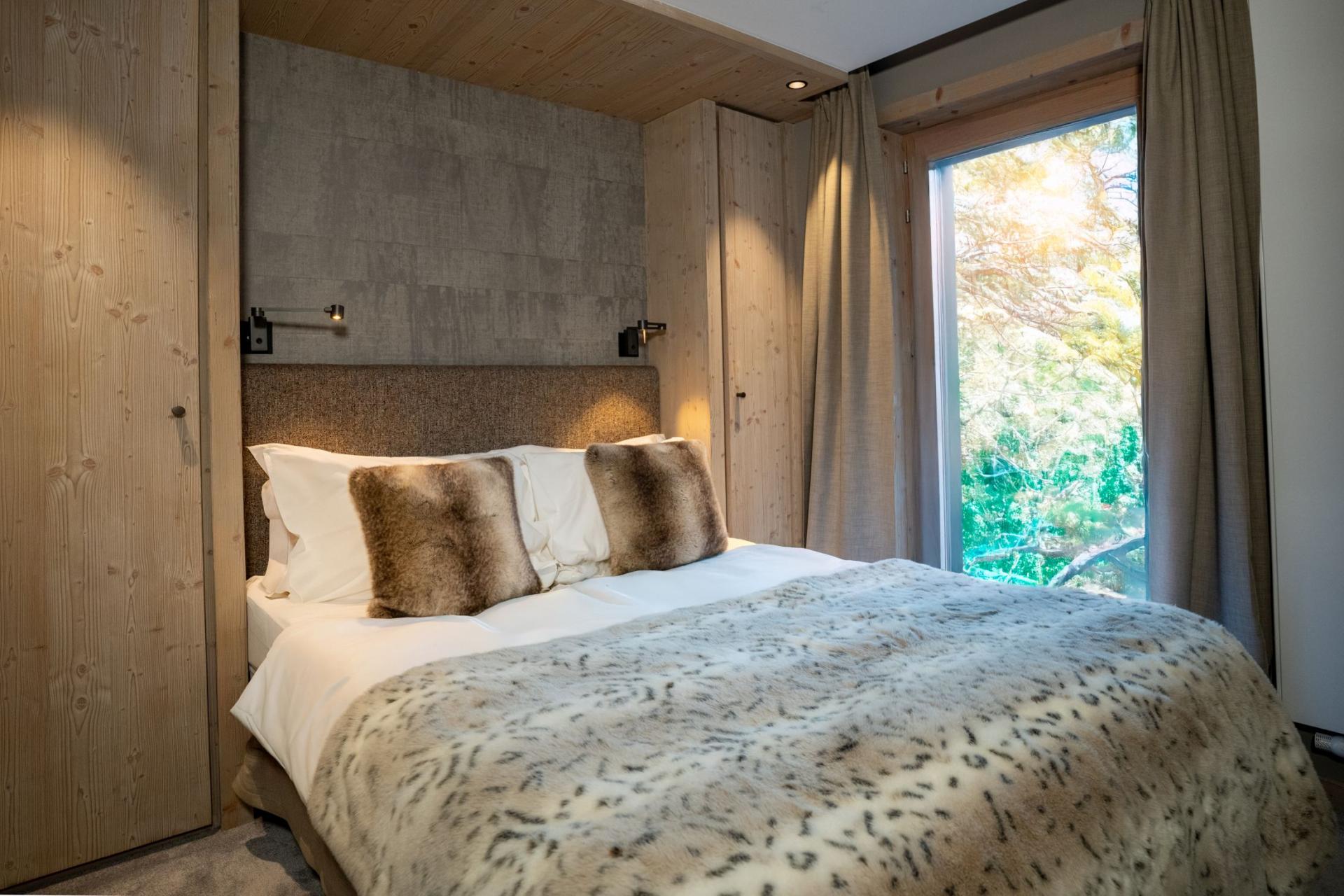 Apartment Tueda can accommodate 8 guests across 4 bedrooms. The bedrooms follow a similar design as the living areas, incorporating vaulted ceilings and wood into the interior design. Plush bedding and modern furniture will ensure guests receive ample rest, staying in top form for whatever the mountain has in store for them. Two bedrooms share balcony access for a viewing space to really enjoy the grandeur of the mountains. All bedrooms also offer private access to either a bath or shower room.