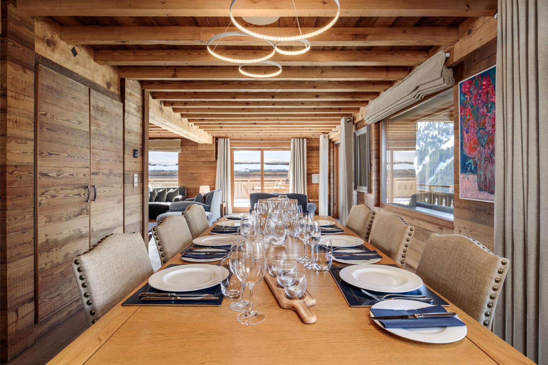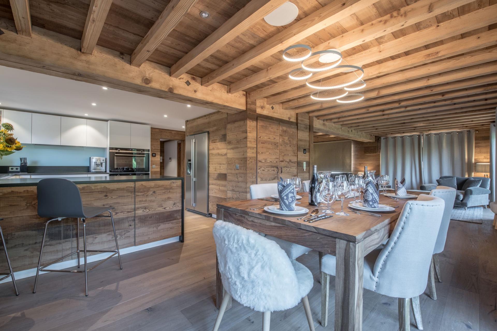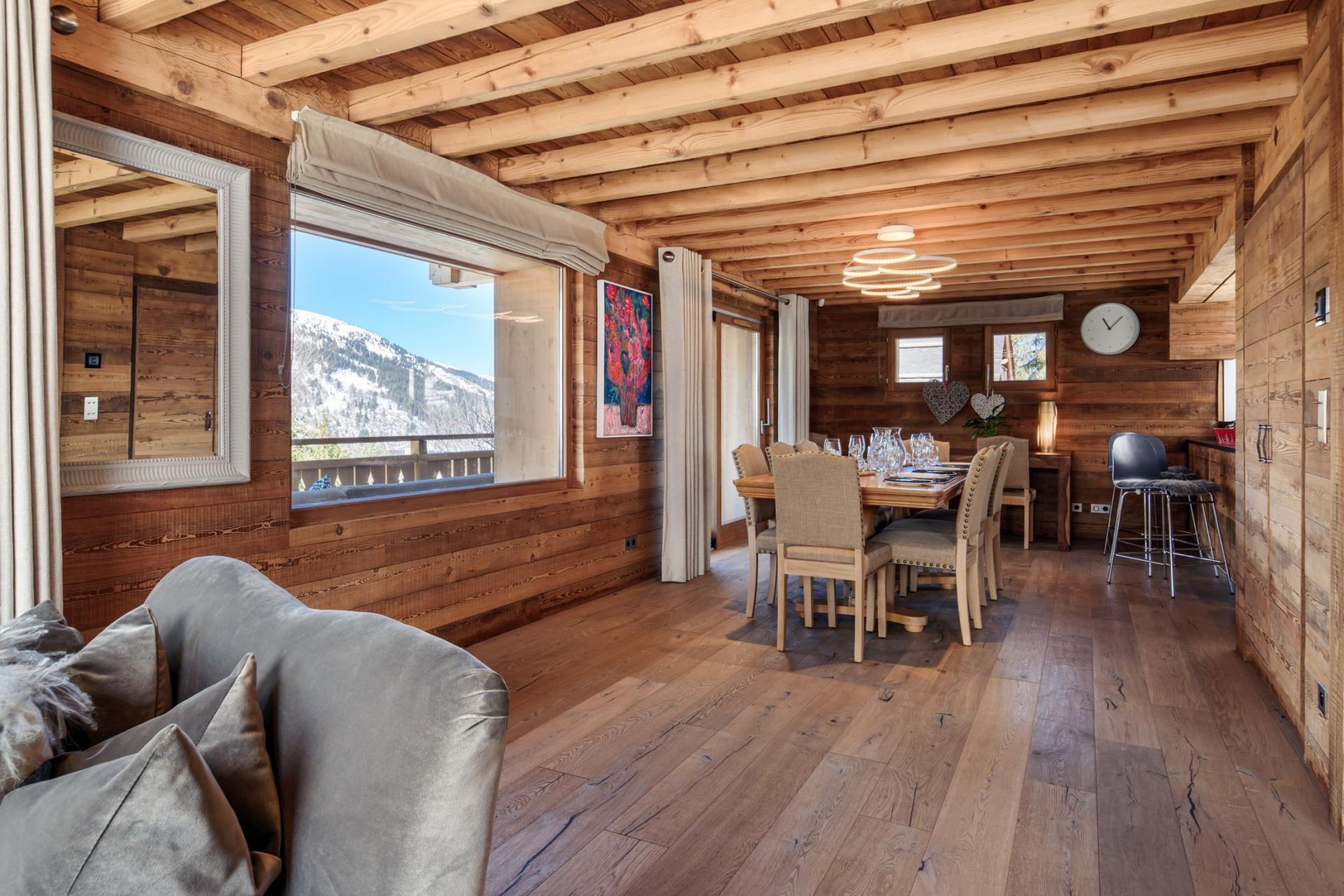 The spacious open-plan living area sits on the first floor of the Chalet La Folie. Adorned with wooden cladding, inviting soft furnishings and a multitude of picture windows, this space adopts a homely feel that's perfect for all the group to unwind. There's a seamless flow between each of the lounge, dining and kitchen areas. Deep comfortable sofas welcome tired legs around the glowing fireplace, with an adjacent bar area perfect for a post-ski beverage. Around the corner lies a wooden dining table and modern kitchen, with breakfast bar, where all mealtimes can be prepared and enjoyed. There's a secondary smaller table, ideal for card games after dinner, or alternatively, sliding doors will lead out onto a large terrace facing south and west to admire the beautiful snowy mountain backdrop.