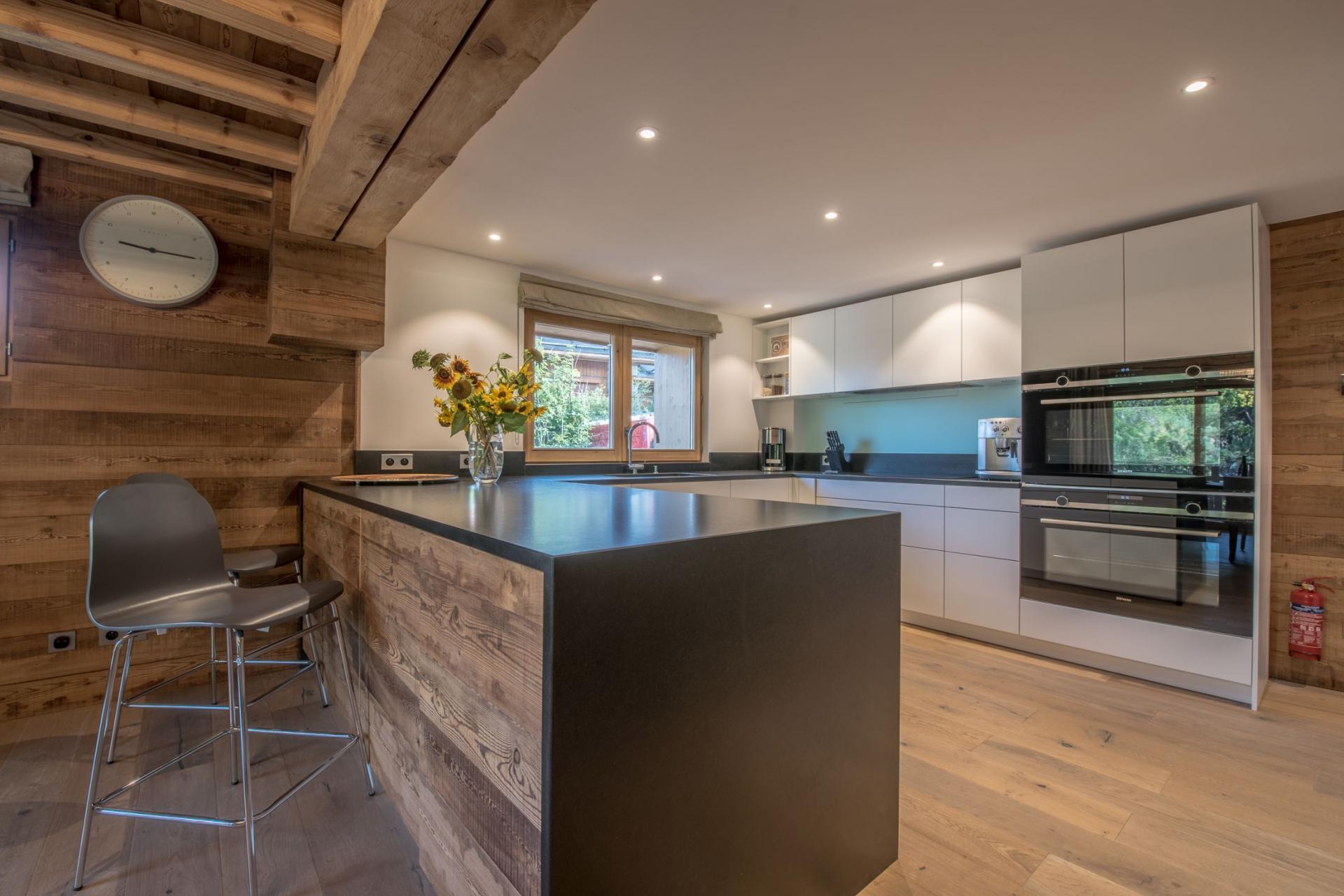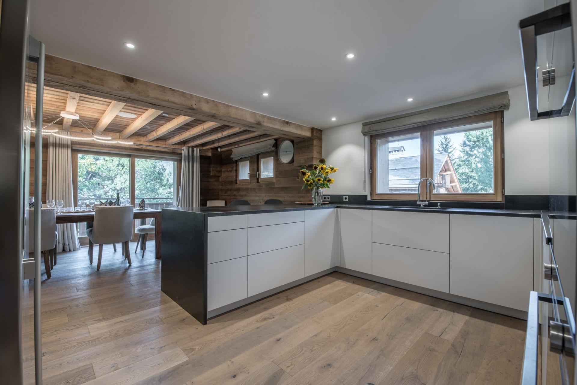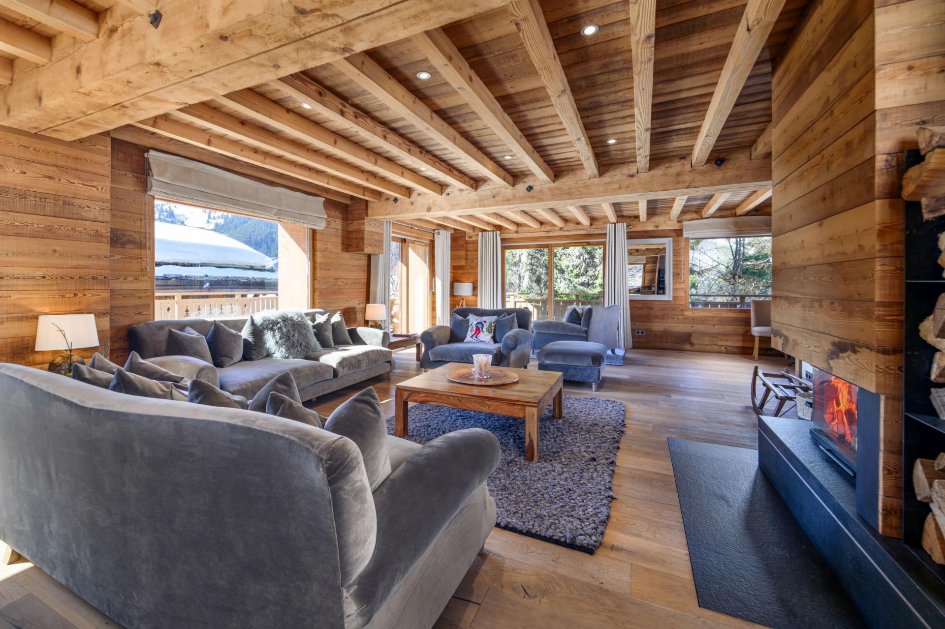 The spacious open-plan living area sits on the first floor of the Chalet La Folie. Adorned with wooden cladding, inviting soft furnishings and a multitude of picture windows, this space adopts a homely feel that's perfect for all the group to unwind. There's a seamless flow between each of the lounge, dining and kitchen areas. Deep comfortable sofas welcome tired legs around the glowing fireplace, with an adjacent bar area perfect for a post-ski beverage. Around the corner lies a wooden dining table and modern kitchen, with breakfast bar, where all mealtimes can be prepared and enjoyed. There's a secondary smaller table, ideal for card games after dinner, or alternatively, sliding doors will lead out onto a large terrace facing south and west to admire the beautiful snowy mountain backdrop.