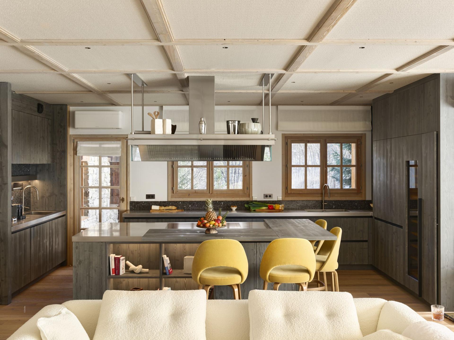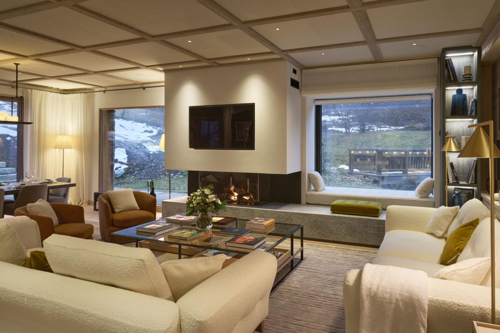 The traditional stone and wood facade of Chalet M hides a contemporary luxury interior design, best showcased across the chalet's main living areas on the ground floor. With wood flooring, a light, airy, open-plan design, and plush modern furnishings, the chalet exhibits a distinct, elegant style. There are numerous sumptuous sofas and armchairs to relax upon around the glass-fronted fireplace, with multiple options for dining, whether at the main dining table, or alongside the island of the spacious, fully-equipped kitchen. Giant picture windows let in natural light, and gaze out towards the chalet's outdoor areas, a garden and terrace with outdoor seating and a cosy firepit, a fantastic space for your group to gather and regale the day's ski adventures.