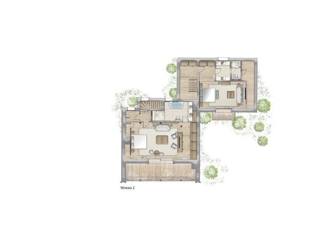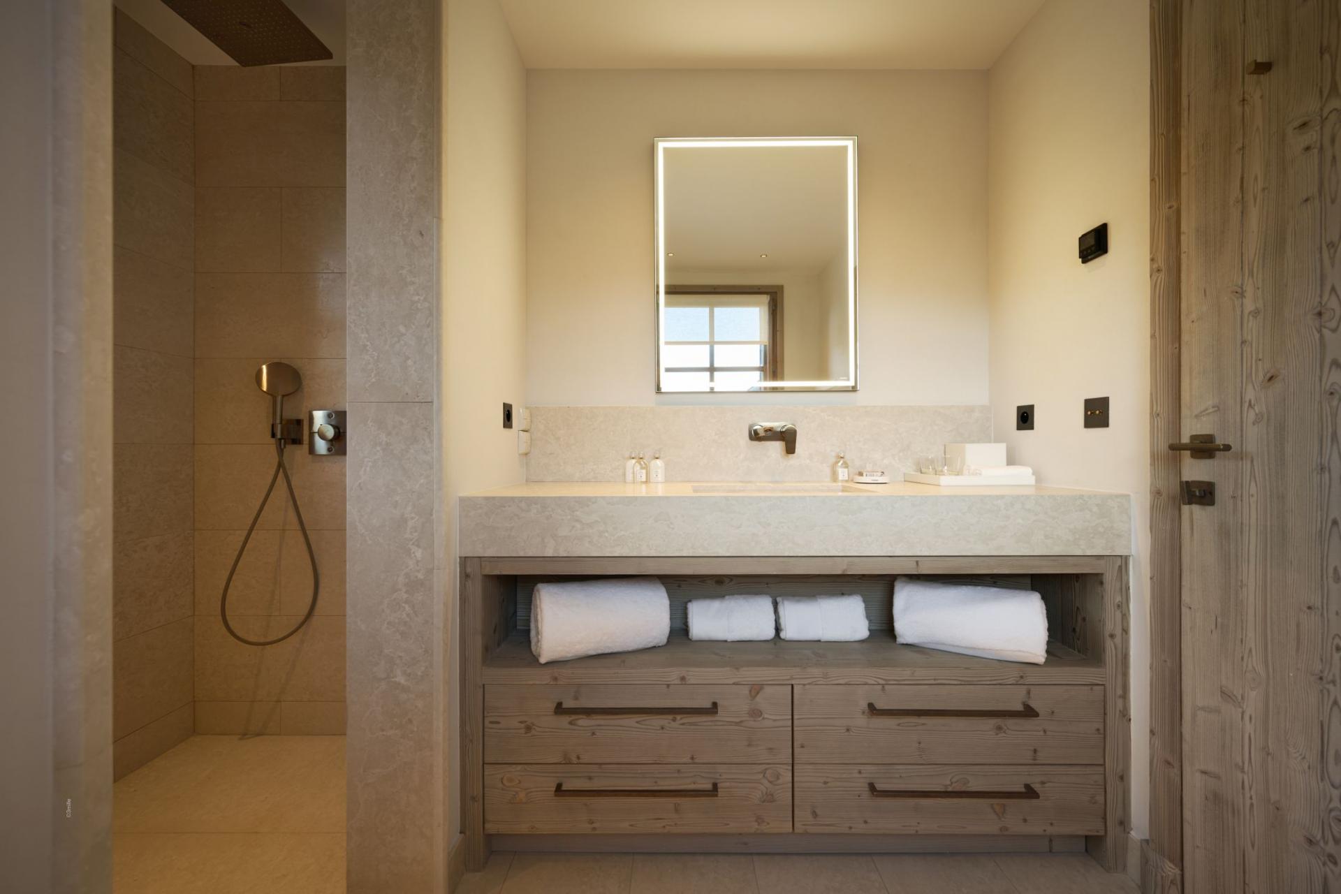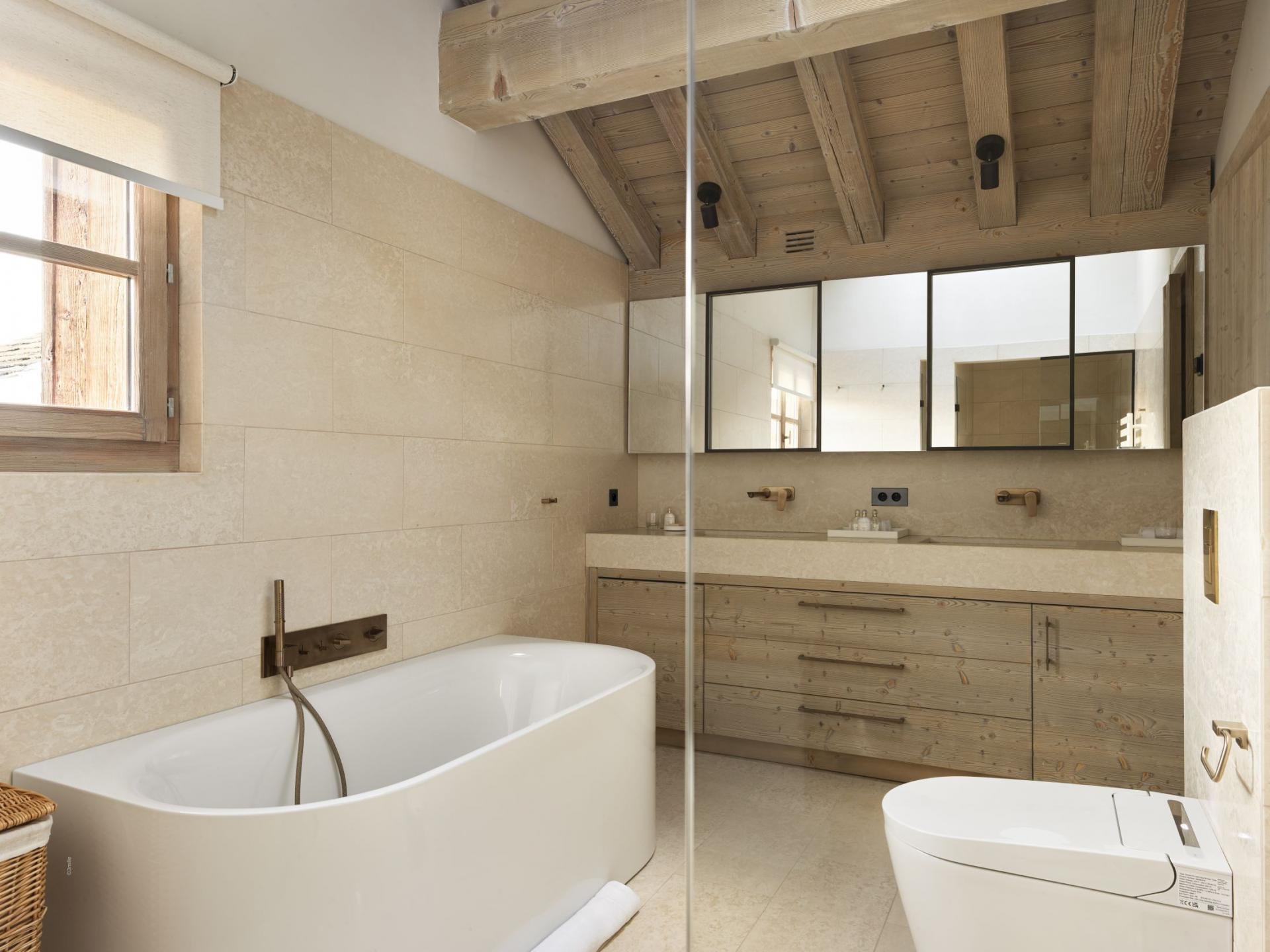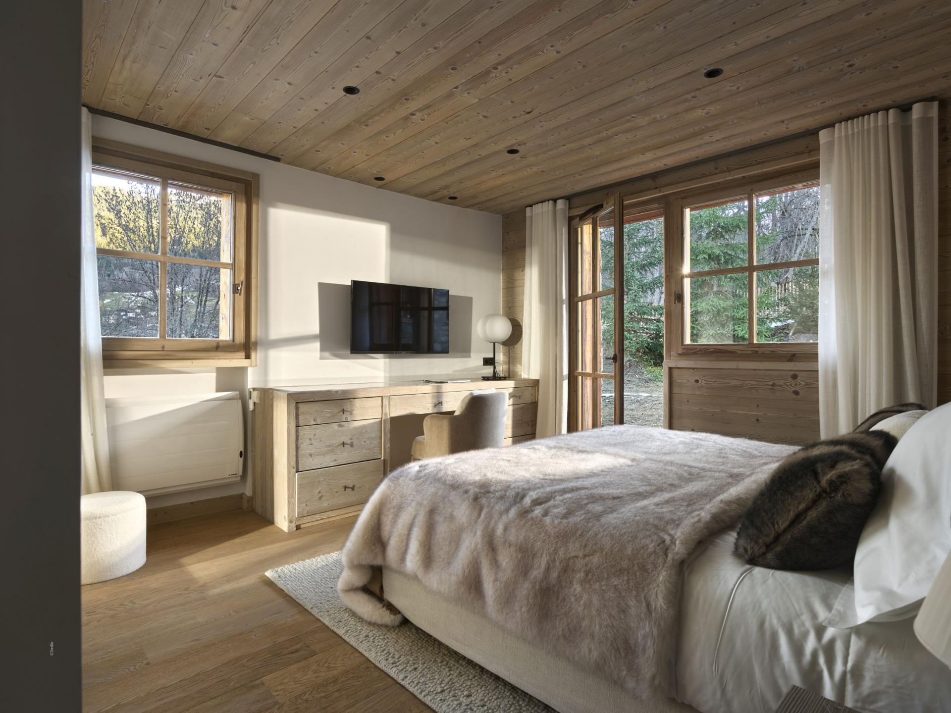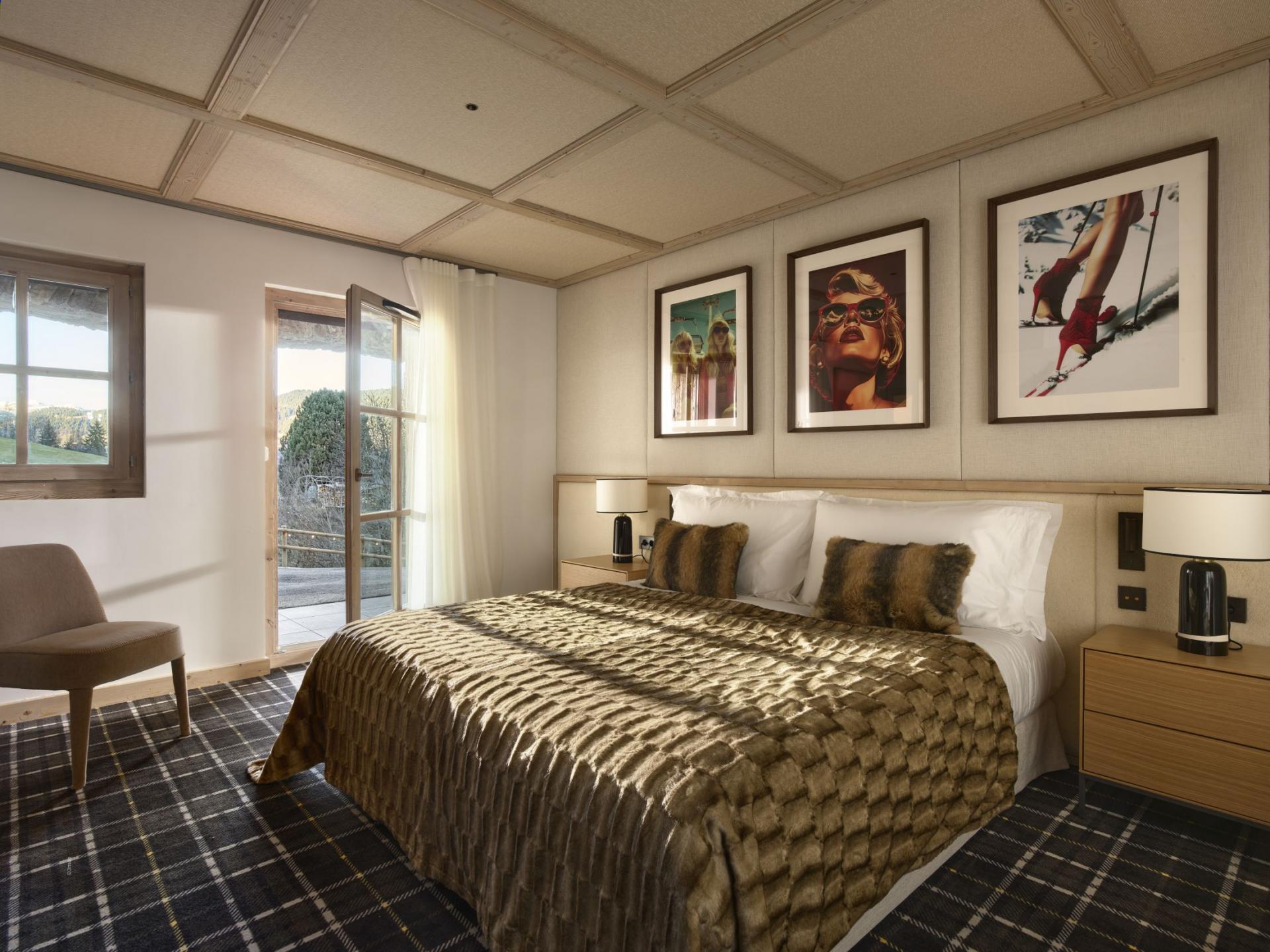 Five double bedrooms across the chalet offer space for groups of up to 10 guests to stay at Chalet M. The bedrooms are especially spacious, with an individual character to their design, utilising light wood interiors, plush bedding, and bold artworks. The master suite on the first floor is particularly lavish, with high vaulted ceilings and its own living area. All bedrooms offer direct outside access, whether to a private balcony or the terrace, and all enjoy private en-suite facilities.