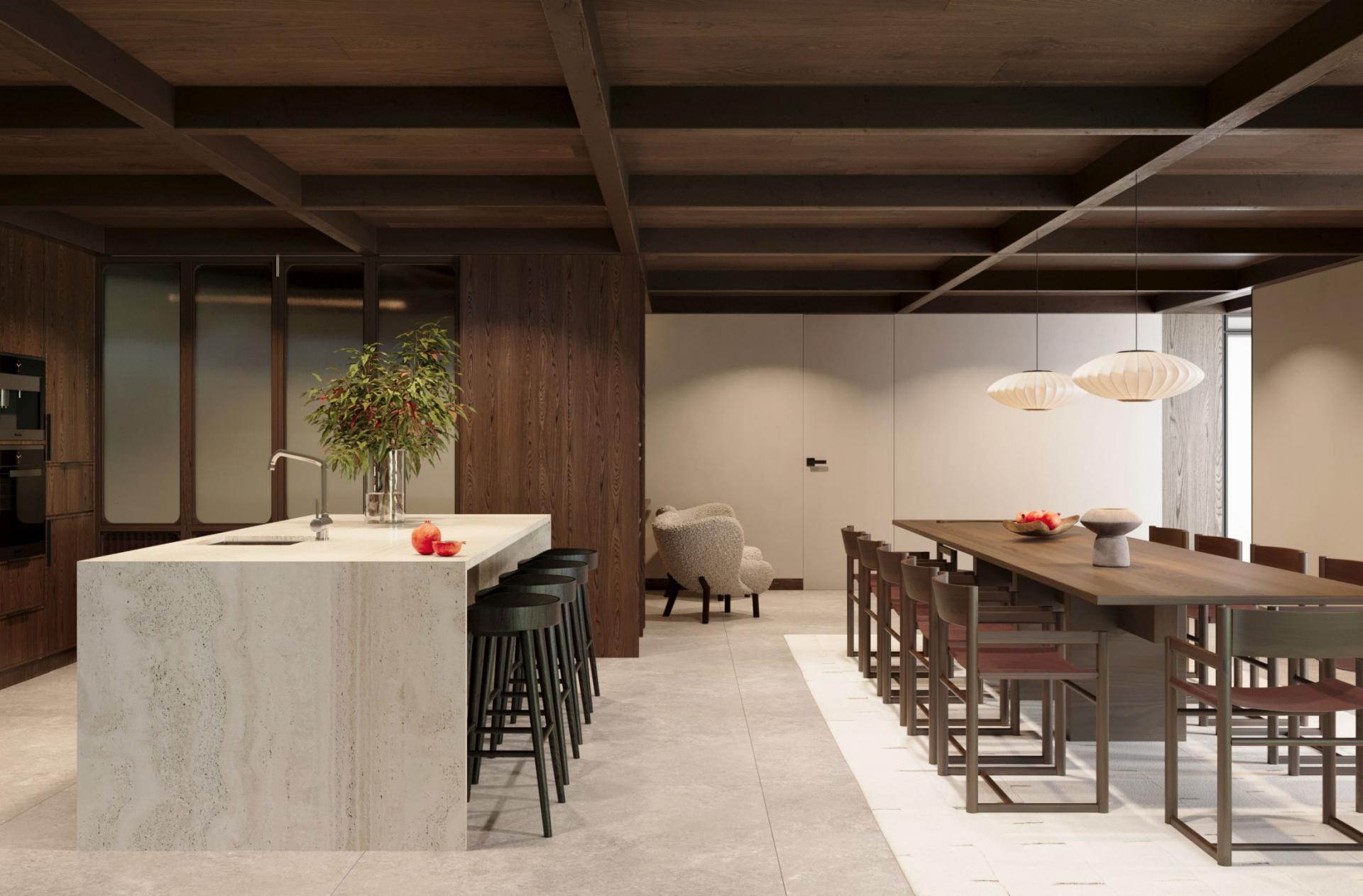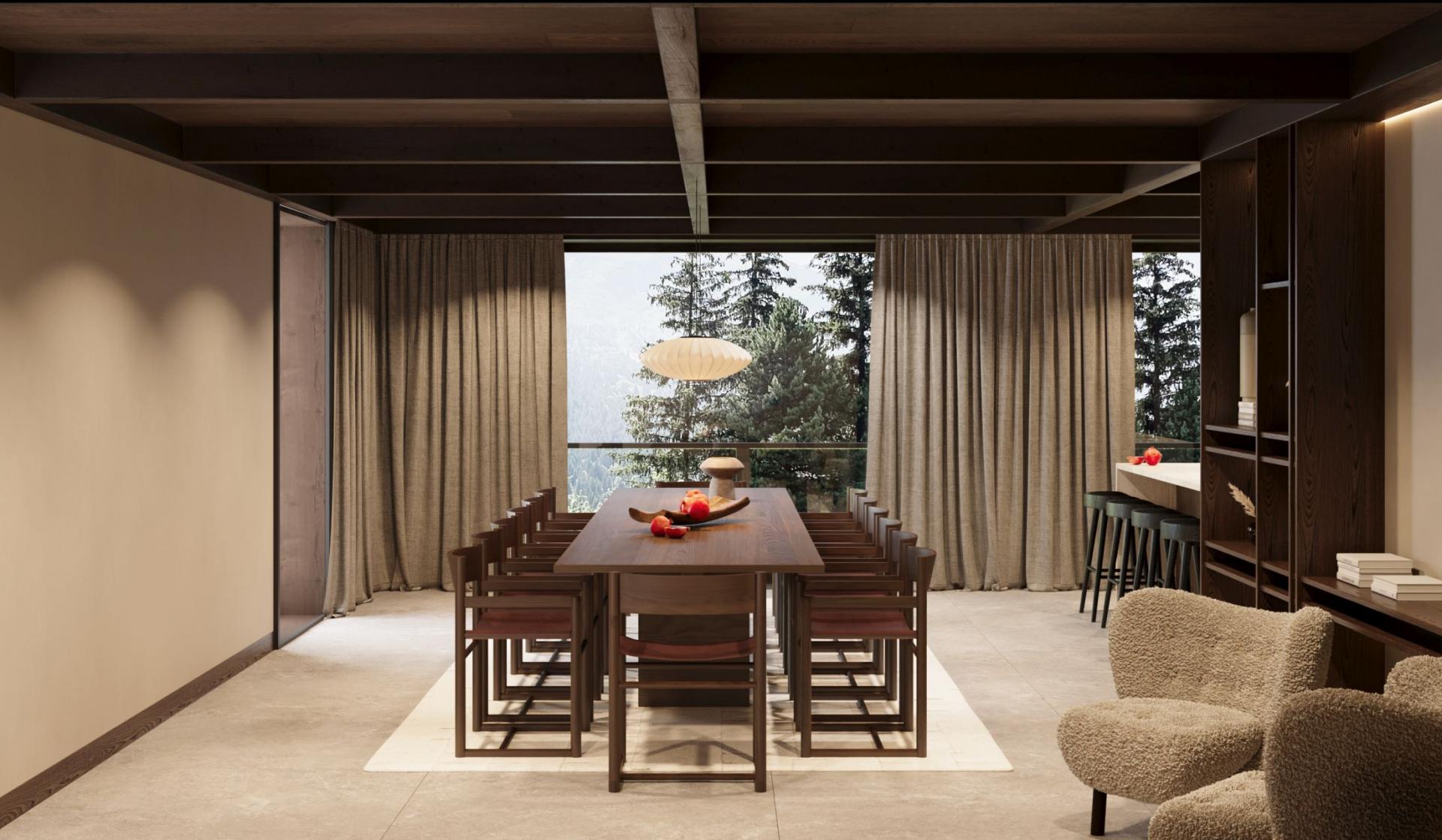 Chalet Montclair's main living space has been designed to share memories with loved ones in a social environment. Exhibiting a modern, open-layout, the living and dining areas combine into a luscious hub for guests to congregate after a mountain day, with a seamless flow between the two sides of this floor. Large panoramic windows and double-height ceilings add to the airy ambience in here, while plush, welcoming furnishings invite guests to relax by the fireplace or amongst a plethora of seating options. Grab a drink of your choice from the bar and share stories on the terrace, leading out from the living space, before heading to the dining table in the evening. Seating the entire group, it's perfect for banquets altogether, whilst meal preparations are taken care of by chalet staff in the open or fully enclosed kitchens.