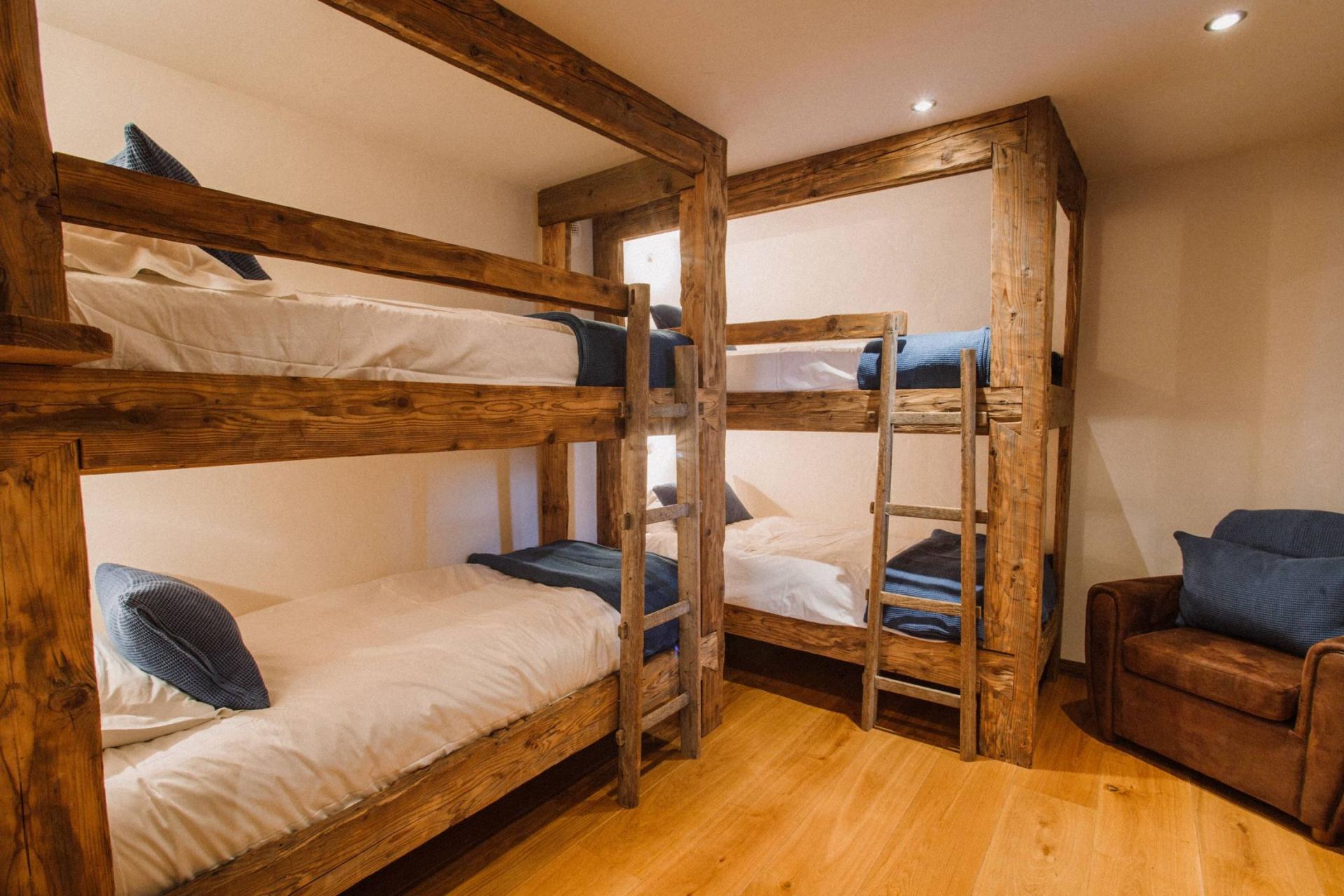 From the entrance, Chalet Chardon opens up, rising through 6 staggered floors and mezzanines, to the vaulted-wooden ceilings and exposed wooden beams. The main open-plan living space towards the top of the chalet features a smart modern kitchen, elegant dining table and sumptuous lounge area, all surrounding a stunning central fireplace open on all sides. Head up a few steps, and you will find additional lounge areas to congregate and socialise. The chalet benefits from several balconies on all sides, as well as a terrace opening out into garden space, where you can play in the snow and drink in incredible views of the surrounding peaks.