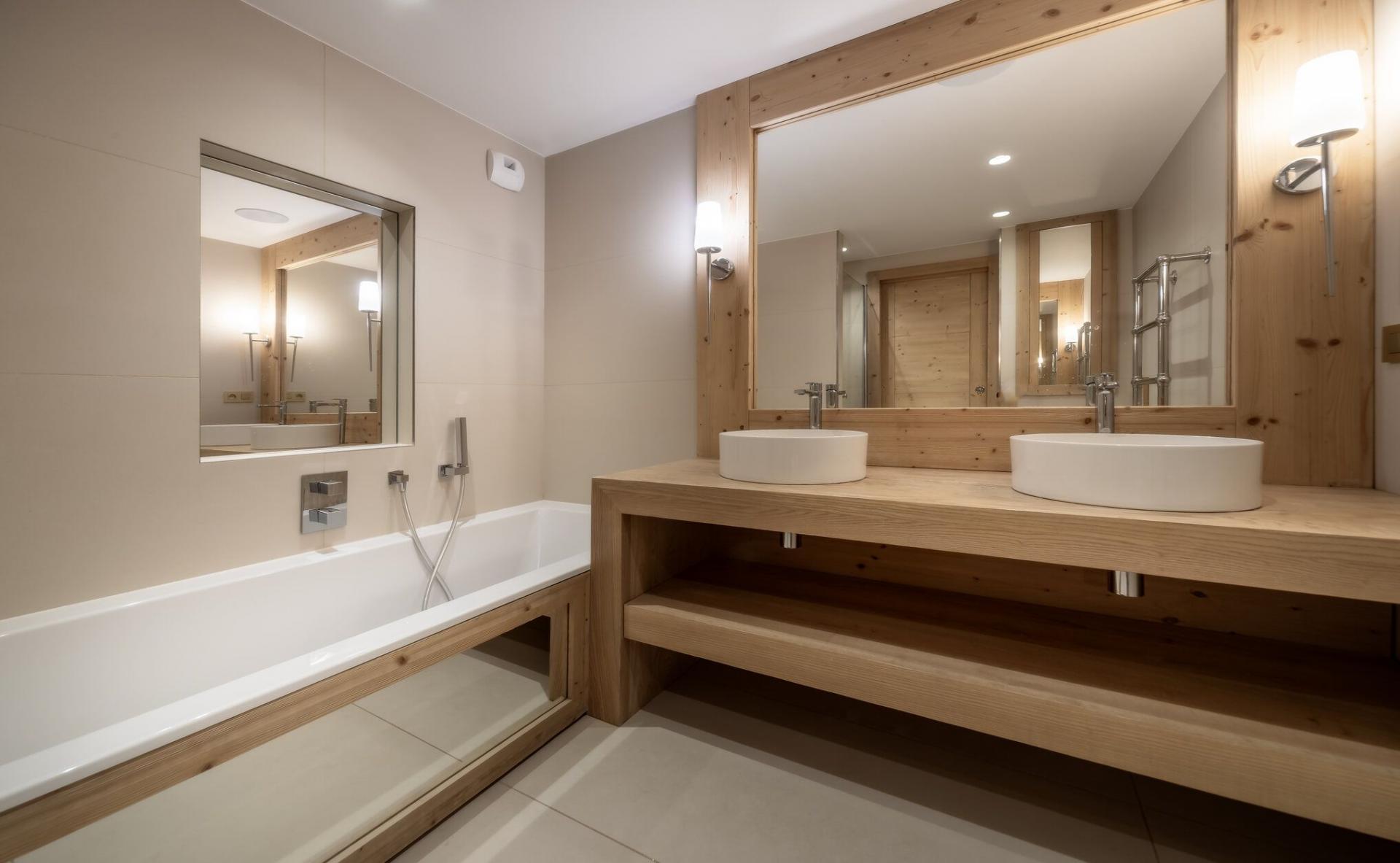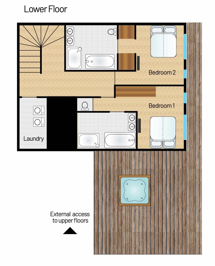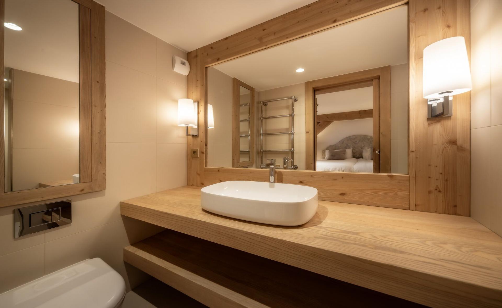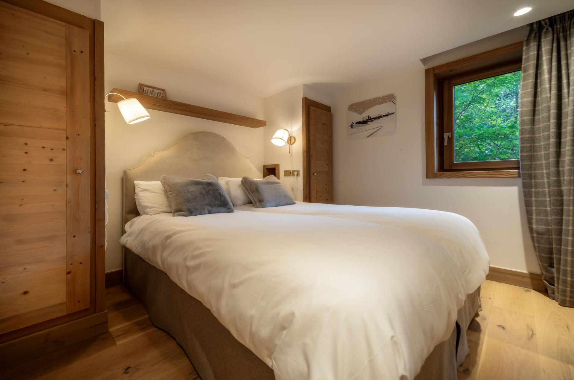 There are six double bedrooms to Chalet Fraser in total, providing the capacity to sleep a total of 12 guests. Spread between the bottom and middle levels, these bedrooms have a simple yet welcoming design, with soft beds that look like they've been transported from a bucolic English country cottage. All the bedrooms can also be taken as twin rooms, offering brilliant flexibility for different group configurations. Many rooms also offer access to shared balconies, while four rooms have an en-suite with the final two bedrooms sharing a Jack & Jill-style shower room.