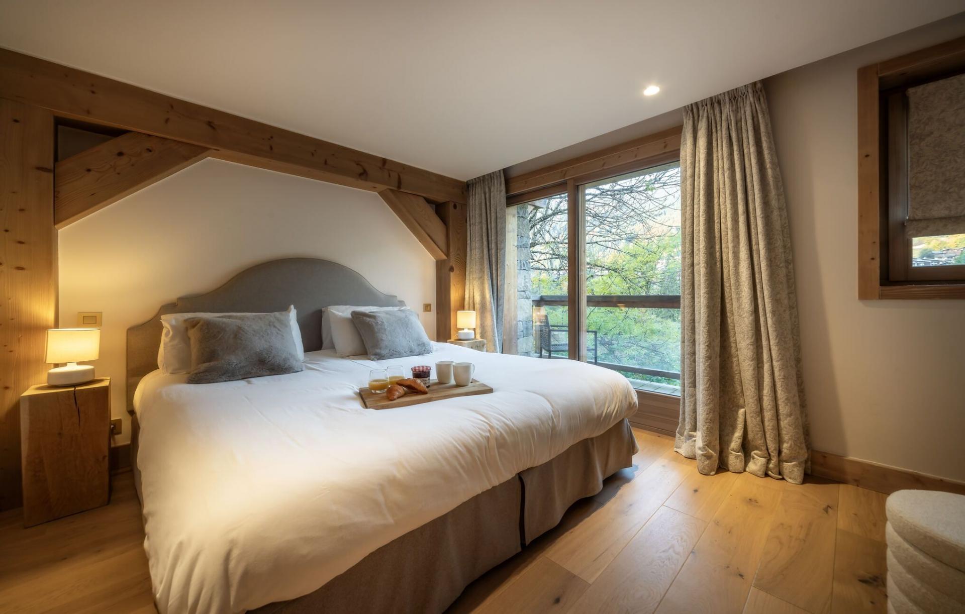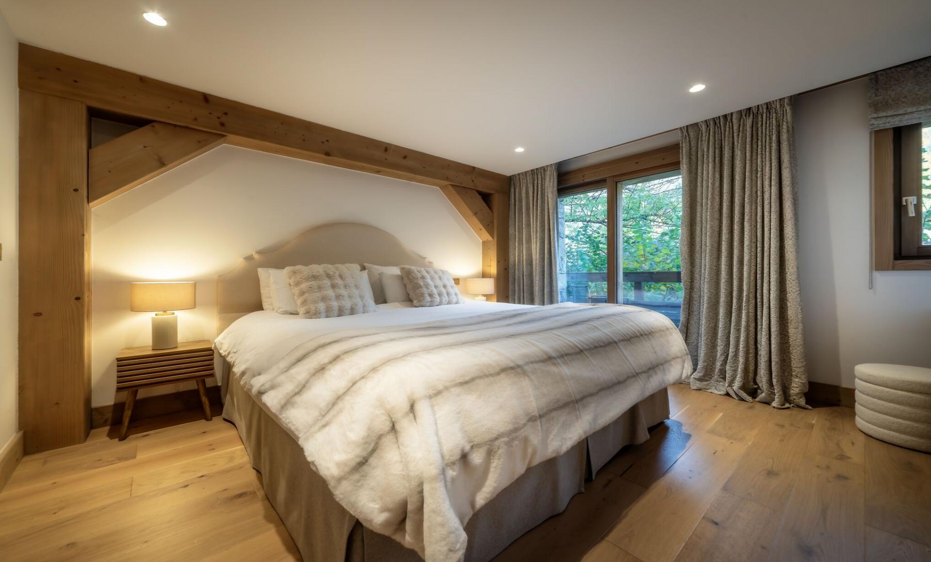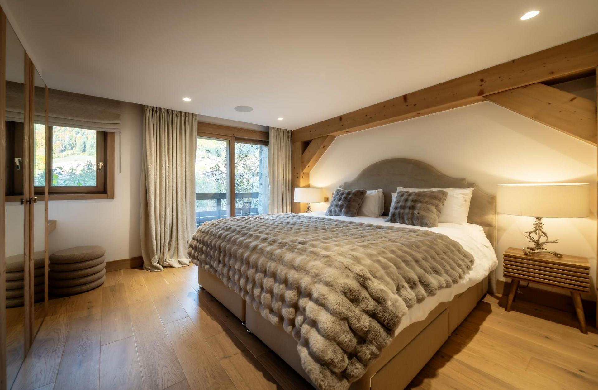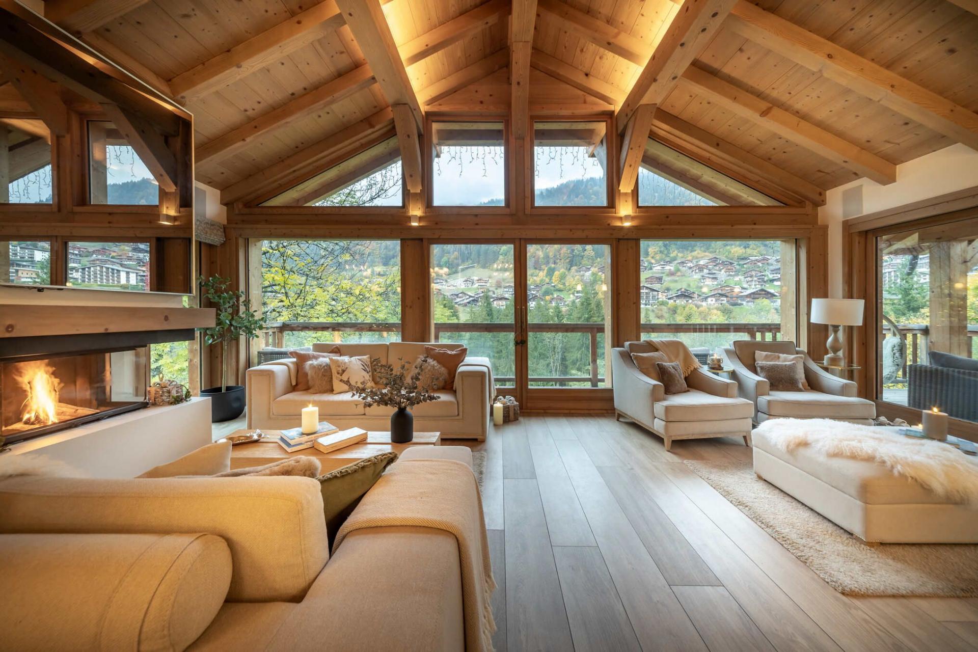 You enter the property on the uppermost level of Chalet Fraser's three floors, which is home to an inviting living space. A vaulted roof structure of exposed beams and light wood opens out the open-plan space, while sumptuous off-white furnishings provide some familiar home comforts. The stylish lounge area sits at one end of the room, accompanied by an elegant fireplace, with the entire space positioned towards a wall of windows which frame beautiful views across Morzine and its valley. A square dining table is well prepared to host mealtimes, while the fully-equipped kitchen can also be found in this open living space. At the far end of the lounge, a balcony spans the breadth of the chalet, where you can enjoy a more intimate view of the scenery, or relax in the shelter of the overhanging roof on the comfortable outdoor furniture, a lovely spot for some après ski drinks.