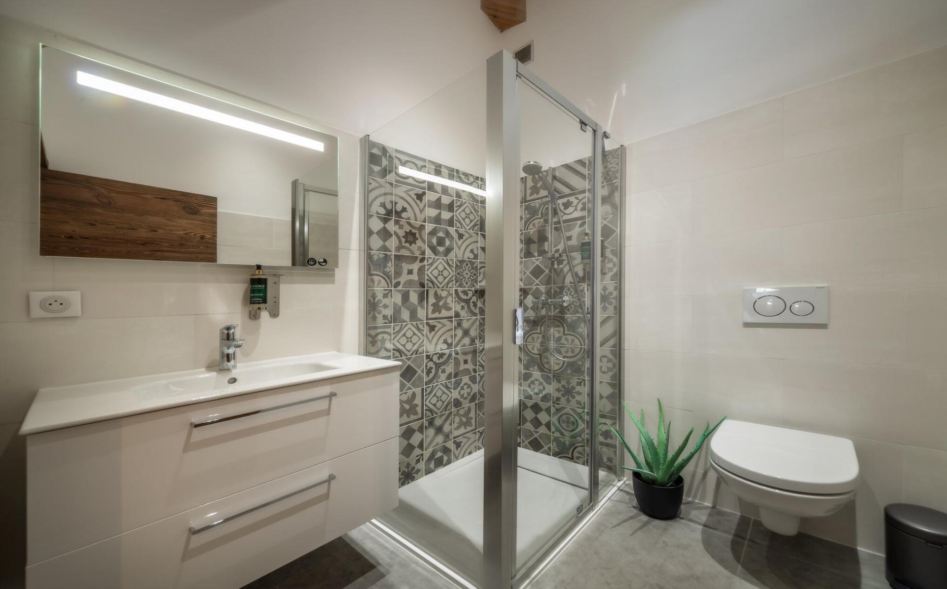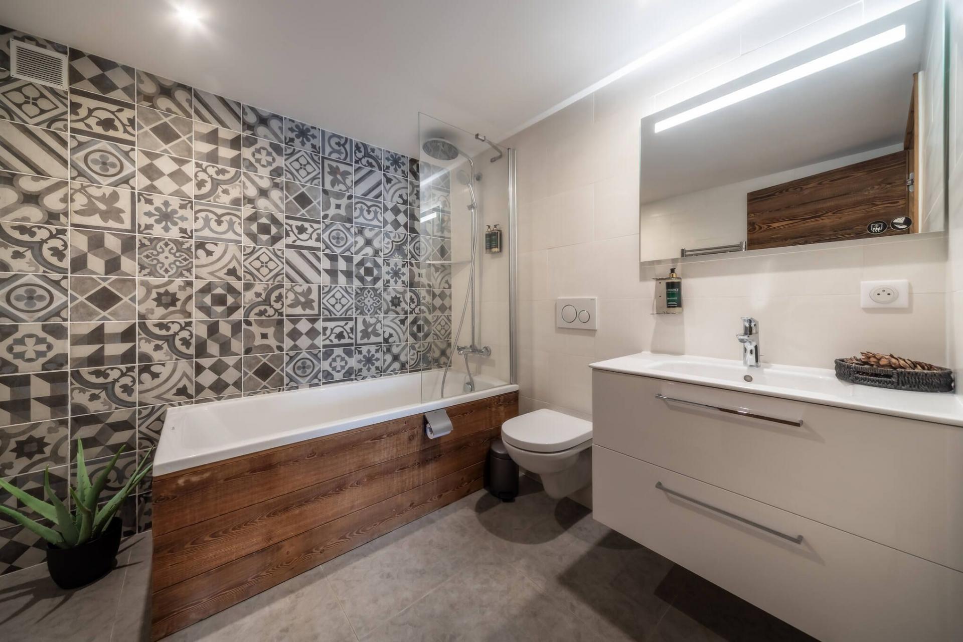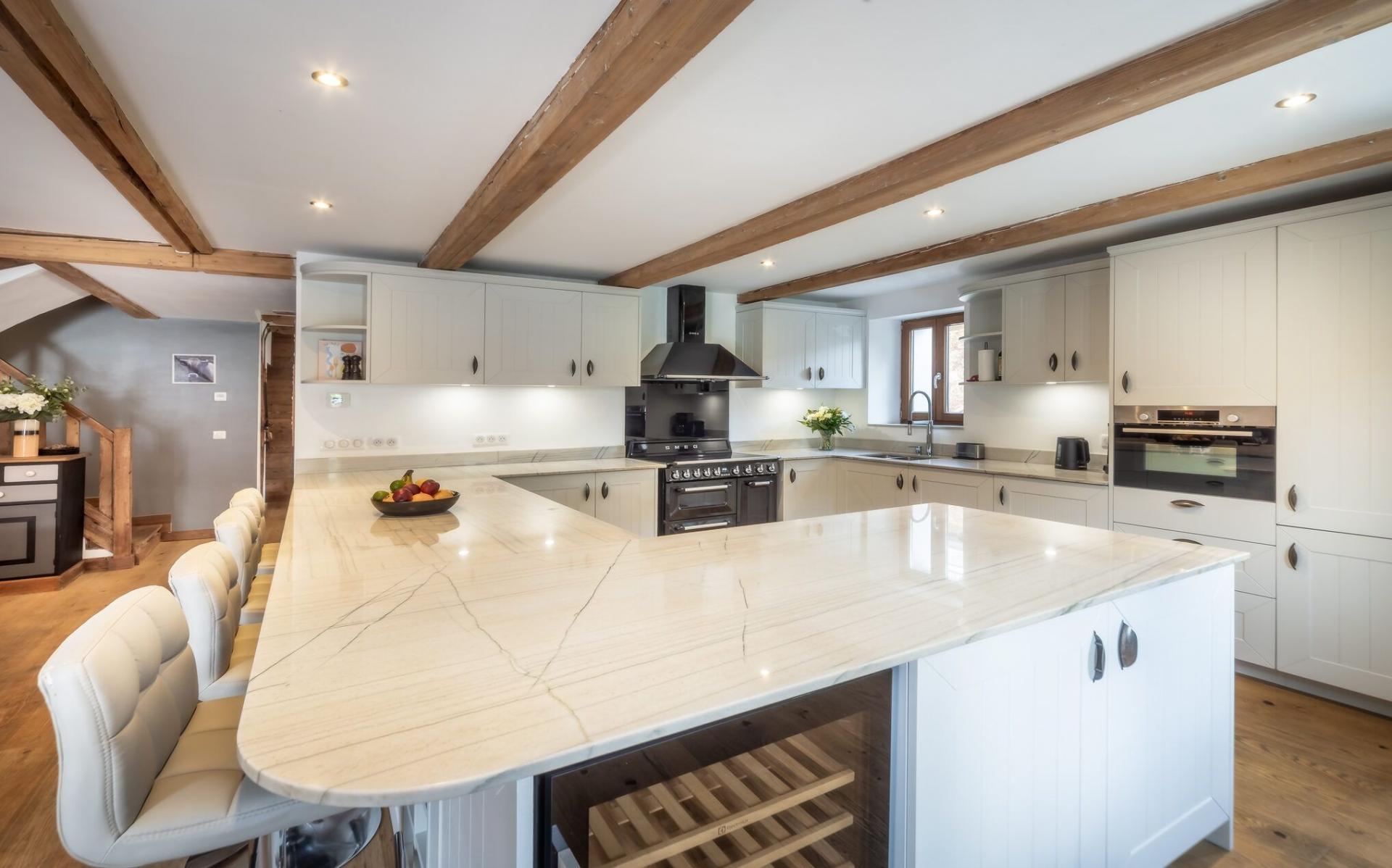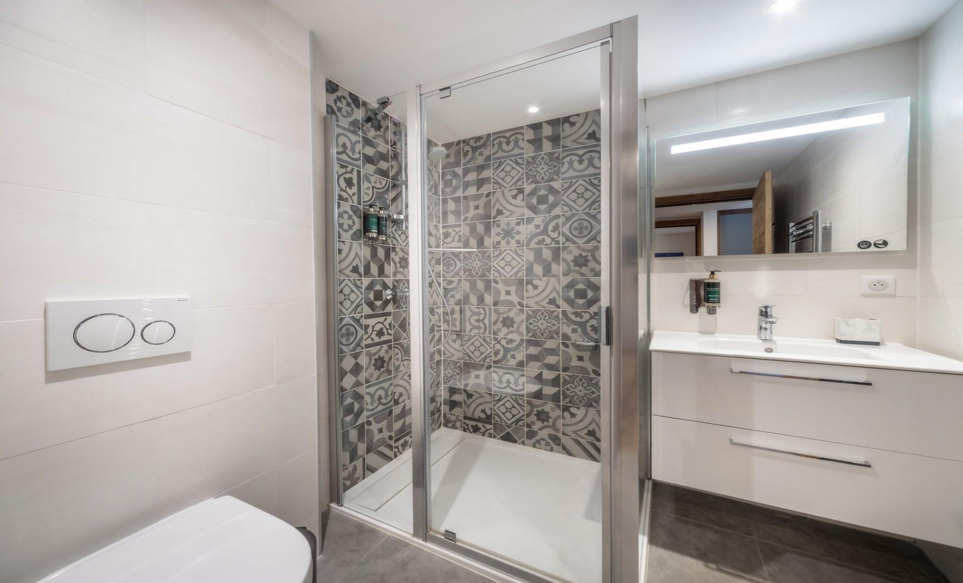 The ground floor of Chalet La Ferme is entirely dedicated to the chalet's living spaces. A cosy, traditional lounge area benefits from a sizeable U-shaped leather sofa, wood-panelled walls, and a rustic log burner fireplace, making excellent use of the space and showcasing the old farmhouse nature of the chalet. Meanwhile, the kitchen and dining areas take on a much more modern fashion. The homely dining area acts as a convivial space for home-cooked meals, which can be made in the sleek, sizeable, expertly-equipped kitchen that is found adjacent to the dining table. Four additional seats run alongside a breakfast bar for more casual dining, a great spot to grab a croissant and morning coffee before heading off to the slopes. Outdoors, Chalet La Ferme benefits from its own pleasant terrace and garden space, where children can play or adults can enjoy some après ski drinks and pretty mountain views.