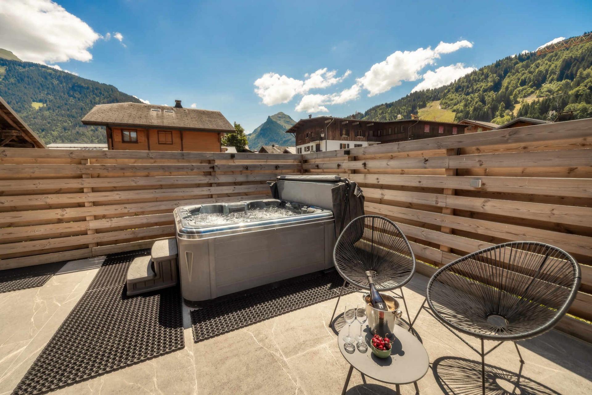 The terrace of Chalet La Ferme also plays host to the chalet's outdoor hot tub, which beckons you to its bubbling warmth to help ease your tired muscles after skiing. If you're in the mood for a quieter night at the chalet, the luxurious TV lounge offers a great spot to unwind.