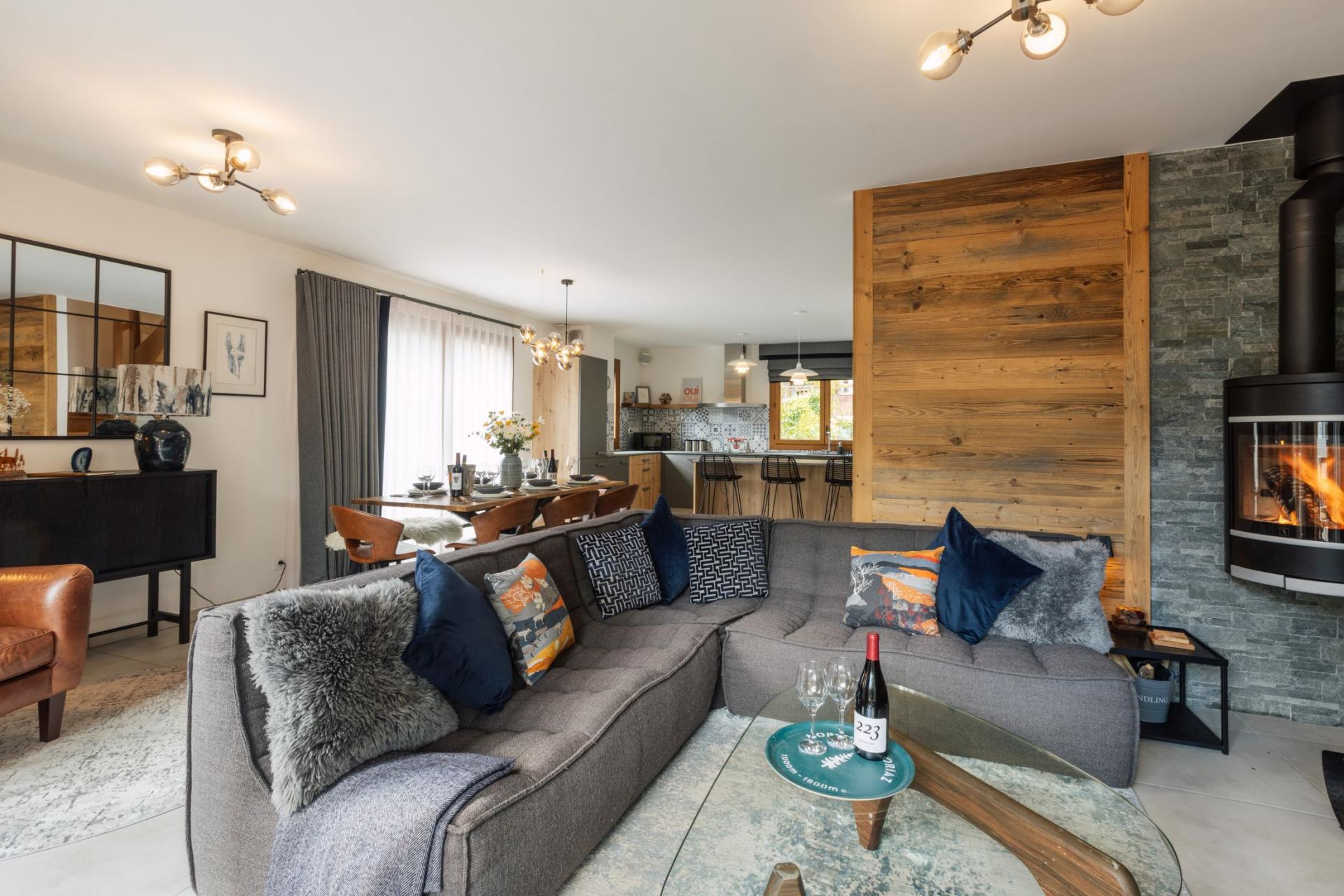 The chalet's living space follows an open-plan design, perfect for social evenings together. A comfortable sofa invites guests to slow down and enjoy the moment in front of the TV and log burner, next to sliding glass doors that lead out to one of two balconies from the living area perfect for alfresco meals and drinks. Towards the back of the room, an open kitchen with a breakfast bar allows guests to whip up delicious meals and hearty breakfasts. The nearby dining table poses as a suitable spot to gather round and eat together as a whole group in the evening.
